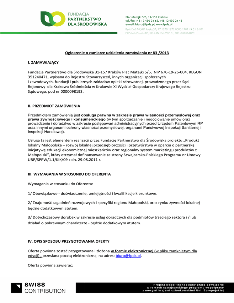 Ogłoszenie o zamiarze udzielenia zamówienia nr 83 /2013 I. ZAMAWIAJĄCY Fundacja Partnerstwo dla Środowiska 31-157 31 Kraków Plac Matejki 5/6, NIP 676-19 19-26-004, REGON 351240471, wpisana do Rejestru Stowarzyszeń, innych organizacji społecznych i zawodowych, fundacji i publicznych zakładów opieki zdrowotnej, prowadzonego przez Sąd Rejonowy dla Krakowa Śródmieścia w Krakowie XI Wydział Gospodarczy Gospodarczy Krajowego Rejestru Sądowego, pod nr 0000098193. II. PRZEDMIOT ZAMÓWIENIA Przedmiotem zamówienia jest obsługa prawna w zakresie prawa własności własno ci przemysłowej oraz prawa żywnościowego ciowego i konsumenckiego (w tym sporządzanie dzanie i negocjowanie umów oraz prowadzenie rowadzenie i doradztwo w zakresie postępowań post administracyjnych przed Urzędem ędem Patentowym RP oraz innymi organami ochrony własności własno przemysłowej, organami Państwowej stwowej Inspekcji Sanitarnej i Inspekcji Handlowej). Usługa ta jest elementem realizacji przez Fundację Fundację Partnerstwo dla Środowiska projektu „Produkt lokalny Małopolska – rozwój lokalnej przedsiębiorczości i przetwórstwa w oparciu o partnerską inicjatywę edukacji ekonomicznej mieszkańców oraz regionalny system marketingu produktów z Małopolski”, który otrzymał rzymał dofinansowanie ze strony Szwajcarsko-Polskiego Szwajcarsko Polskiego Programu nr Umowy URP/SPPW/1.1/KIK/09 z dn. 29.08.2011 r. III. WYMAGANIA W STOSUNKU DO OFERENTA Wymagania w stosunku do Oferenta: ferenta: 1/ Obowiązkowe - doświadczenie, oświadczenie, umiejętności i kwalifikacje kierunkowe. 2/ Znajomość najomość zagadnień rozwojowych i specyfiki regionu Małopolski, Małopol oraz rynku żywności lokalnej będzie dodatkowym atutem. 3/ Dotychczasowy otychczasowy dorobek w zakresie usług doradczych dla podmiotów trzeciego sektora i / lub działań o pokrewnym charakterze - będzie dodatkowym atutem. IV. OPIS SPOSOBU PRZYGOTOWANIA OFERTY Oferta powinna zostać przygotowana i złożona w formie elektronicznej (w pliku zamkniętym dla edycji) , przesłana pocztą elektroniczną na adres: [email protected]. Oferta powinna zawierać: • • • • • datę sporządzenia, adres oferenta, adres e-mail, mail, numer telefonu kontaktowego, opis kierunkowych doświadczeń zawodowych, zawodowych wykazujący cy w jednoznaczny sposób, że Oferent spełnia wymaganie opisane w pkt. III., proponowaną roponowaną wycenę wykonywania pracy – w formie stawki brutto za osobogodzinę świadczenia usług, referencje (nie obowiązkowo). Wybór sposobu przygotowania Oferty od strony merytorycznej pozostawia się Oferentowi, z zachowaniem następujących pujących elementów obowiązkowych: 1/ zawodowe CV i opis doświadczeń zawodowych dla każdego proponowanego członka zespołu Oferenta, który będzie pracował bezpośrednio z Fundacją, jednoznacznie wskazujące na spełnienie wymagań Ogłoszenia, 2/ oferta cenowa. V. MIEJSCE ORAZ TERMIN SKŁADANIA OFERT Oferty należy przesłać do sekretariatu Zamawiającego na podany adres ([email protected] ([email protected]) w terminie do dnia 10.02.2014r.,, do godziny 12.00. Za ofertę złożoną uważana będzie wyłącznie oferta, która w powyższym terminie zostanie faktycznie dostarczona pod wskazany adres email Zamawiającego. Przed upływem terminu składania ofert Wykonawca może zmienić lub wycofać swoją ofertę. Oferty złożone po o terminie składania ofert nie będą rozpatrywane. Wykonawca może złożyć duplikat oferty w formie tradycyjnej (papierowej), w siedzibie Zamawiającego przy pl. Matejki 5/6, Kraków. VI. OCENA OFERT Zamawiający dokona oceny ważnych ofert na podstawie następujących kryteriów: • • • • Doświadczenie, oświadczenie, umiejętności i kwalifikacje kierunkowe (waga 1) Znajomość najomość zagadnień rozwojowych i specyfiki regionu Małopolski, oraz rynku żywności lokalnej (waga 0,5). Dotychczasowy dorobek w zakresie usług doradczych dla podmiotów podmiotów trzeciego sektora i działań o pokrewnym charakterze (waga 0,5) Stawka godzinowa brutto (z podatkiem VAT lub wszelkimi pochodnymi wynagrodzenia) wynagrodzenia (waga 1). Punktacja od 1 pkt-ocena ocena bardzo niska do 5 pkt – ocena bardzo wysoka. VII. ROKOWANIA Oferenta – potencjalnego Wykonawcę, ykonawcę, którego oferta została wybrana jako najkorzystniejsza, Zamawiający zaprasza do negocjacji warunków umowy. Przedmiotem negocjacji mogą być szczegóły dot. zakresu usługi będącej ej przedmiotem zamówienia, sposobu sposo u realizacji usługi, wysokości wys i sposobu płatności wynagrodzenia. Jeżeli w czasie rokowań nie dojdzie do uzgodnienia wszystkich postanowień umowy Zamawiający może zaprosić do rokowań innego Oferenta, którego oferta uzyskała kolejno najlepszą lepszą ocenę, ocenę albo zamknąć postępowanie bez dokonania wyboru. VII. INFORMACJE DOTYCZĄCE WYBORU NAJKORZYSTNIEJSZEJ OFERTY 1. O wyborze najkorzystniejszej najkorzystniejsze oferty Zamawiający zawiadomi Oferentów ferentów za pośrednictwem strony internetowej znajdującej się pod adresem: www.fpds.pl 2. Zamawiający nie ma obowiązku uzasadnienia dokonanego wyboru. 3. Oferty złożone po terminie będą zwrócone Składającym bez otwierania. 4. Oferent może przed upływem terminu składania ofert zmienić lub wycofać ofertę. 5. W toku badania i oceny ofert Zamawiający Zama może żądać od Oferentów wyjaśnień dotyczących treści złożonych ofert. Dodatkowych informacji udziela: udziela W sprawie zakresu prac: Bożena Pietras-Goc, Pietras pod adresem e-mail: [email protected] , /zapytania proszę kierować nie później na 2 dni robocze przed upływem terminu składania ofert/. ofert W pozostałych sprawach: Stanisław Olszówka, Olszówka pod adresem e-mail: [email protected].