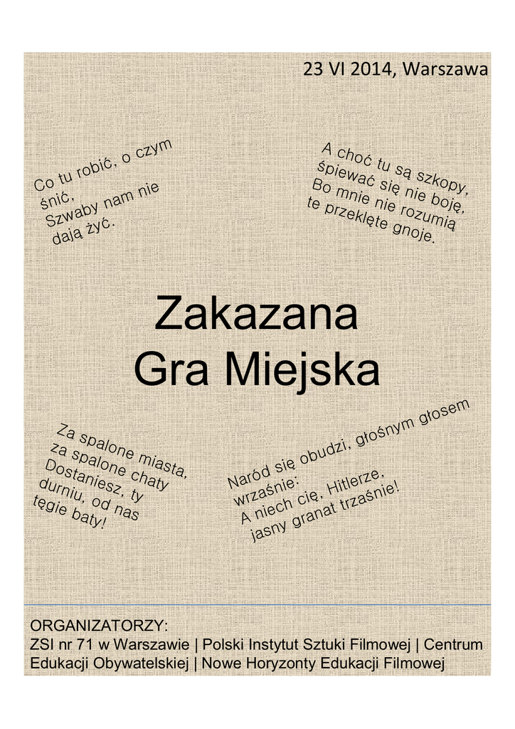 23 VI 2014, Warszawa ym z c ,o i b tu ro o C ie n , m ni na y b a Szw y . daj A ch o piew Bo m a te p nie r ze k l tu s s si n zkopy, i nie r e boj , oz te g umi noje . Zakazana Gra Miejska Za s za s palone p Dos alone miasta , t c durn aniesz haty , t gi iu, od ty nas e ba ty! nym o i, g z d bu o si d e, ó z r r a : e N nie , Hitl ie! a n z i r a w h c at trz c e i A n y gran jasn em s o g ORGANIZATORZY: ZSI nr 71 w Warszawie | Polski Instytut Sztuki Filmowej | Centrum Edukacji Obywatelskiej | Nowe Horyzonty Edukacji Filmowej 70. rocznica Powstania Warszawskiego Gimnazjalisto! Licealisto! Przygotuj się i zagraj! 23 czerwca 2014 Ostatni szkolny poniedziałek Godz. 09.00 – 15.30 - 6 niesamowitych powstańczych przystanków, - wiele zakazanych warszawskich piosenek - zobacz Warszawę sprzed lat!!! - poczuj się Polakiem Wszystkich uczestników zapraszamy na film „Powstanie Warszawskie” na ostatniej stacji w Kinie Muranów Zapisz się do 20 czerwca!!! www.gramiejska.filmotekaszkolna.pl