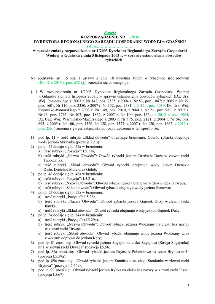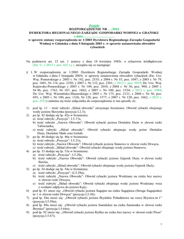 Projekt ROZPORZĄDZENIE NR …/2016 DYREKTORA REGIONALNEGO ZARZĄDU GOSPODARKI WODNEJ w GDAŃSKU z dnia………………………. w sprawie zmiany rozporządzenia nr 1/2003 Dyrektora Regionalnego Zarządu Gospodarki Wodnej w Gdańsku z dnia 5 listopada 2003 r. w sprawie ustanowienia obwodów rybackich Na podstawie art. 15 ust. 1 ustawy z dnia 18 kwietnia 1985r. o rybactwie śródlądowym (Dz. U. z 2015 r. poz. 652 t.j.), zarządza się co następuje: § 1. W rozporządzeniu nr 1/2003 Dyrektora Regionalnego Zarządu Gospodarki Wodnej w Gdańsku z dnia 5 listopada 2003r. w sprawie ustanowienia obwodów rybackich (Dz. Urz. Woj. Pomorskiego z 2003 r. Nr 142, poz. 2535; z 2004 r. Nr 53, poz. 1047; z 2005 r. Nr 79, poz. 1601, Nr 116, poz. 2350; z 2007 r. Nr 132, poz. 2381; z 2012 r. poz. 3019; Dz. Urz. Woj. Kujawsko-Pomorskiego z 2003 r. Nr 149, poz. 2010, z 2004 r. Nr 56, poz. 980, z 2005 r. Nr 96, poz. 1763, Nr 107, poz. 1862; z 2007 r. Nr 100, poz. 1534; z 2012 r. poz. 1984; Dz. Urz. Woj. Warmińsko-Mazurskiego z 2003 r. Nr 175, poz. 2121; z 2004 r. Nr 56, poz. 693; z 2005 r. Nr 100, poz. 1326, Nr 128, poz. 1577; z 2007 r. Nr 120, poz. 1662, z 2012 r. poz. 2551) zmienia się treść załącznika do rozporządzenia w ten sposób, że: 1) 2) 3) 4) 5) 6) 7) 8) 9) pod lp. 11 – treść rubryki „Skład obwodu” otrzymuje brzmienie: Obwód rybacki obejmuje wody jeziora Skrzynka (pozycja I.2.3); po lp. 42 dodaje się lp. 42a w brzmieniu: a) treść rubryki „Pozycja”: I.5.17a, b) treść rubryki „Nazwa Obwodu”: Obwód rybacki jeziora Dreńskie Duże w zlewni rzeki Taborzanka, c) treść rubryki „Skład obwodu”: Obwód rybacki obejmuje wody jezior Dreńskie Duże, Dreńskie Małe oraz Golub; po lp. 46 dodaje się lp. 46a w brzmieniu: a) treść rubryki „Pozycja”: I.5.21a, b) treść rubryki „Nazwa Obwodu”: Obwód rybacki jeziora Stanowo w zlewni rzeki Drwęca, c) treść rubryki „Skład obwodu”: Obwód rybacki obejmuje wody jeziora Stanowo; po lp. 53 dodaje się lp. 53a w brzmieniu: a) treść rubryki „Pozycja”: I.5.28a, b) treść rubryki „Nazwa Obwodu”: Obwód rybacki jeziora Gajerek Duży w zlewni rzeki Iławka, c) treść rubryki „Skład obwodu”: Obwód rybacki obejmuje wody jeziora Gajerek Duży; po lp. 54 dodaje się lp. 54a w brzmieniu: a) treść rubryki „Pozycja”: (I.5.29a), b) treść rubryki „Nazwa Obwodu”: Obwód rybacki jeziora Wodziany na cieku bez nazwy w zlewni rzeki Drwęca, c) treść rubryki „Skład obwodu”: Obwód rybacki obejmuje wody jeziora Wodziany wraz z wodami odpływu do jeziora Kęty; pod lp. 81 znosi się: „Obwód rybacki jeziora Sugajno na cieku Sugajnica (Struga Sugajenka) nr 1 w zlewni rzeki Drwęca” (pozycja I.5.56); pod lp. 84a znosi się: „Obwód rybacki jeziora Bryńskie Południowe na rzece Brynica nr 1” (pozycja I.5.59a); pod lp. 89a znosi się: „Obwód rybacki jeziora Samińskie na cieku Samionka w zlewni rzeki Brynica” (pozycja I.5.64a); pod lp. 92 znosi się: „Obwód rybacki jeziora Rybka na cieku bez nazwy w zlewni rzeki Pissa” (pozycja I.5.67); 1 10) pod lp. 96a znosi się: „Obwód rybacki jeziora Strzemiuszczek na cieku bez nazwy w zlewni rzeki Skarlanka” (pozycja I.5.71a); 11) pod lp. 98a znosi się: „Obwód rybacki jeziora Szczuckie na cieku bez nazwy w zlewni rzeki Drwęca” (pozycja I.5.73a); 12) po lp. 109 dodaje się lp. 109a w brzmieniu: a) treść rubryki „Pozycja”: I.5.84a, b) treść rubryki „Nazwa Obwodu”: Obwód rybacki jeziora Czarownica (Borzymińskie) na Dopływie z Jeziora Trąbińskiego w zlewni rzeki Rypienica, c) treść rubryki „Skład obwodu”: Obwód rybacki obejmuje wody jeziora Czarownica (Borzymińskie) z wodami dopływów do jeziora oraz wody do 50-ciu metrów poniżej wypływu z jeziora; 13) pod lp. 110: a) treść rubryki „Nazwa obwodu” otrzymuje brzmienie: Obwód rybacki jeziora Dłuskie (Długie) na dopływie z jeziora Długiego w zlewni rzeki Rypienica, b) treść rubryki „Skład obwodu” otrzymuje brzmienie: „Obwód rybacki obejmuje wody jezior: Dłuskie (Długie), Kiełpińskie, Warpalskie (Warpalickie) i wody łączących je cieków, cieku Struga Dunaj (Dopływ z Wąpielska) od źródeł do jego ujścia do rzeki Rypienica, oraz wody dopływów do tych wód (pozycja I.5.85); 14) pod lp. 124 znosi się: „Obwód rybacki jeziora Oborskie na cieku bez nazwy w zlewni rzeki Ruziec” (pozycja I.5.99); 15) pod lp. 131a znosi się: „Obwód rybacki jeziora Plebanka (Hilareckie) na cieku bez nazwy w zlewni rzeki Drwęca” (pozycja I.5.106a); 16) pod 131b znosi się: „Obwód rybacki jeziora Macikowskie na cieku bez nazwy w zlewni rzeki Drwęca” (pozycja I.5.106b); 17) pod lp. 137a znosi się: „Obwód rybacki jeziora Korza na cieku Struga Toruńska nr 3a” (pozycja I.6.3a); 18) pod lp. 139 znosi się: „Obwód rybacki jeziora Stare (Dźwierzyńskie) w zlewni cieku Struga Toruńska” (pozycja I.6.5); 19) pod lp. 140a znosi się: „Obwód rybacki jeziora Jeziorek na cieku bez nazwy w zlewni cieku Struga Toruńska” (pozycja I.6.6a); 20) pod lp. 140b znosi się: „Obwód rybacki jeziora Głęboczek na cieku bez nazwy w zlewni cieku Struga Toruńska” (pozycja I.6.6b); 21) po lp. 165 dodaje się lp. 165a w brzmieniu: a) treść rubryki „Pozycja”: I.7.25a, b) treść rubryki „Nazwa Obwodu”: Obwód rybacki jeziora Wandzinek w zlewni cieku Czerwona Struga, c) treść rubryki „Skład obwodu”: Obwód rybacki obejmuje wody jeziora Wandzinek; 22) pod lp. 172a znosi się „Obwód rybacki jeziora Osowo Duże na cieku bez nazwy w zlewni rzeki Prądzona” (pozycja I.7.32a); 23) pod lp. 174 znosi się: „Obwód rybacki jeziora Wielkie Zielone na cieku bez nazwy w zlewni rzeki Chocina” (pozycja I.7.34); 24) pod lp. 181a znosi się: „Obwód rybacki jeziora Leśno Górne na rzece Młosina (Mlusina, Mlusino) nr 1a” (pozycja I.7.41a); 25) pod lp. 184 znosi się: „Obwód rybacki jeziora Małe na rzece Kłoniecznica nr 2