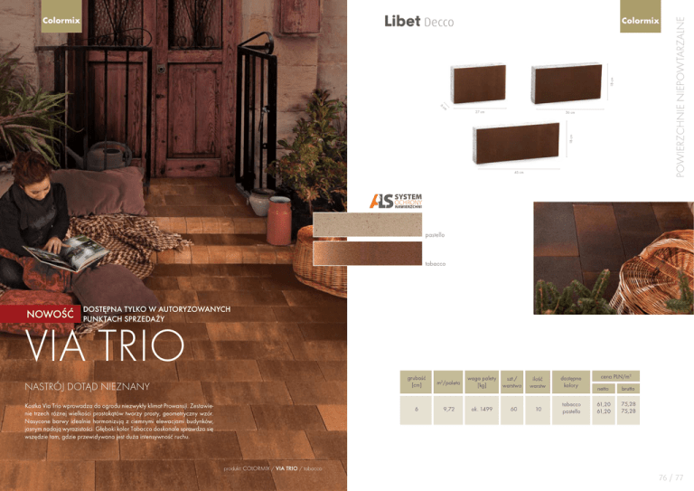 18 cm Colormix 6 36 cm 18 cm cm 27 cm 45 cm pastello tabacco NOWOŚĆ DOSTĘPNA TYLKO W AUTORYZOWANYCH PUNKTACH SPRZEDAŻY VIA TRIO NASTRÓJ DOTĄD NIEZNANY Kostka Via Trio wprowadza do ogrodu niezwykły klimat Prowansji. Zestawienie trzech różnej wielkości prostokątów tworzy prosty, geometryczny wzór. Nasycone barwy idealnie harmonizują z ciemnymi elewacjami budynków, jasnym nadają wyrazistości. Głęboki kolor Tabacco doskonale sprawdza się wszędzie tam, gdzie przewidywana jest duża intensywność ruchu. grubość [cm] m2/paleta waga palety [kg] 6 9,72 ok. 1499 szt./ warstwa 60 ilość warstw dostępne kolory 10 tabacco pastello cena PLN/m2 netto brutto 61,20 61,20 75,28 75,28 produkt: COLORMIX / VIA TRIO / tabacco 76 / 77 Via Trio Via Trio W OTOCZENIU CIEPŁYCH BRĄZÓW Aksamitną ścieżką podążamy w stronę zabytkowych drzwi, ciekawe, co zastaniemy w środku? Nim uchylimy ciężkie skrzydła, rozglądnijmy się chwilę na zewnątrz. Ktoś nie dokończył czytać gazety. Miękkie poduszki zachęcają do odpoczynku. Ciepłe brązy uspokajają, czas wolniej płynie, zostańmy jeszcze przez moment. 1.. 2. 78 3. Fot. 1, 2, 3: produkt: COLORMIX / VIA TRIO / tabacco 79