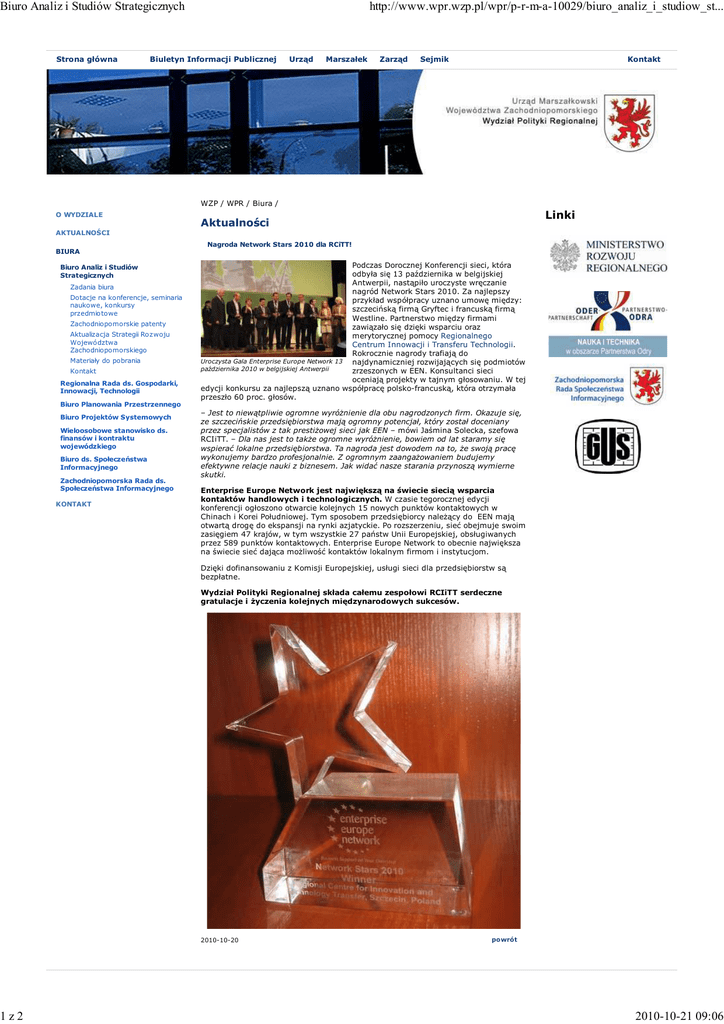 Biuro Analiz i Studiów Strategicznych 1z2 Strona główna http://www.wpr.wzp.pl/wpr/p-r-m-a-10029/biuro_analiz_i_studiow_st... Biuletyn Informacji Publicznej Urząd Marszałek Zarząd Sejmik Kontakt WZP / WPR / Biura / Linki O WYDZIALE Aktualności AKTUALNOŚCI Nagroda Network Stars 2010 dla RCiTT! BIURA Biuro Analiz i Studiów Strategicznych Zadania biura Dotacje na konferencje, seminaria naukowe, konkursy przedmiotowe Zachodniopomorskie patenty Aktualizacja Strategii Rozwoju Województwa Zachodniopomorskiego Materiały do pobrania Kontakt Regionalna Rada ds. Gospodarki, Innowacji, Technologii Podczas Dorocznej Konferencji sieci, która odbyła się 13 października w belgijskiej Antwerpii, nastąpiło uroczyste wręczanie nagród Network Stars 2010. Za najlepszy przykład współpracy uznano umowę między: szczecińską firmą Gryftec i francuską firmą Westline. Partnerstwo między firmami zawiązało się dzięki wsparciu oraz merytorycznej pomocy Regionalnego Centrum Innowacji i Transferu Technologii. Rokrocznie nagrody trafiają do Uroczysta Gala Enterprise Europe Network 13 najdynamiczniej rozwijających się podmiotów października 2010 w belgijskiej Antwerpii zrzeszonych w EEN. Konsultanci sieci oceniają projekty w tajnym głosowaniu. W tej edycji konkursu za najlepszą uznano współpracę polsko-francuską, która otrzymała przeszło 60 proc. głosów. Biuro Planowania Przestrzennego Biuro Projektów Systemowych Wieloosobowe stanowisko ds. finansów i kontraktu wojewódzkiego Biuro ds. Społeczeństwa Informacyjnego Zachodniopomorska Rada ds. Społeczeństwa Informacyjnego KONTAKT – Jest to niewątpliwie ogromne wyróŜnienie dla obu nagrodzonych firm. Okazuje się, ze szczecińskie przedsiębiorstwa mają ogromny potencjał, który został doceniany przez specjalistów z tak prestiŜowej sieci jak EEN – mówi Jaśmina Solecka, szefowa RCIiTT. – Dla nas jest to takŜe ogromne wyróŜnienie, bowiem od lat staramy się wspierać lokalne przedsiębiorstwa. Ta nagroda jest dowodem na to, Ŝe swoją pracę wykonujemy bardzo profesjonalnie. Z ogromnym zaangaŜowaniem budujemy efektywne relacje nauki z biznesem. Jak widać nasze starania przynoszą wymierne skutki. Enterprise Europe Network jest największą na świecie siecią wsparcia kontaktów handlowych i technologicznych. W czasie tegorocznej edycji konferencji ogłoszono otwarcie kolejnych 15 nowych punktów kontaktowych w Chinach i Korei Południowej. Tym sposobem przedsiębiorcy naleŜący do EEN mają otwartą drogę do ekspansji na rynki azjatyckie. Po rozszerzeniu, sieć obejmuje swoim zasięgiem 47 krajów, w tym wszystkie 27 państw Unii Europejskiej, obsługiwanych przez 589 punktów kontaktowych. Enterprise Europe Network to obecnie największa na świecie sieć dająca moŜliwość kontaktów lokalnym firmom i instytucjom. Dzięki dofinansowaniu z Komisji Europejskiej, usługi sieci dla przedsiębiorstw są bezpłatne. Wydział Polityki Regionalnej składa całemu zespołowi RCIiTT serdeczne gratulacje i Ŝyczenia kolejnych międzynarodowych sukcesów. 2010-10-20 powrót 2010-10-21 09:06 Biuro Analiz i Studiów Strategicznych 2z2 http://www.wpr.wzp.pl/wpr/p-r-m-a-10029/biuro_analiz_i_studiow_st... Wydział Polityki Regionalnej, ul. Piłsudskiego 40 -42, 70-952 Szczecin, tel + 48 91 44 67 132, fax. +48 91 44 67 134 2010-10-21 09:06