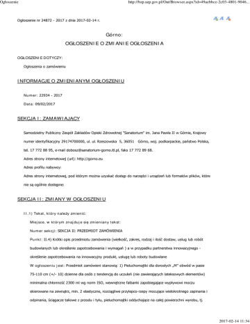 Ogłoszenie http://bzp.uzp.gov.pl/Out/Browser.aspx?id=49aebbce-2c03-4801-9046... Ogłoszenie nr 24872 - 2017 z dnia 2017-02-14 r. Górno: OGŁOSZENI E O ZMI ANI E OGŁOSZENI A OGŁOSZENI E DOTYCZY: Ogłoszenia o zamówieniu I NFORMACJE O ZMI ENI ANYM OGŁOSZENI U Nu m er : 22934 - 2017 Dat a: 09/02/2017 SEKCJA I : ZAMAWI AJĄCY Samodzielny Publiczny Zespół Zakładów Opieki Zdrowotnej "Sanatorium" im. Jana Pawła II w Górnie, Krajowy numer identyfikacyjny 29174700000, ul. ul. Rzeszowska 5, 36051 Górno, woj. podkarpackie, państwo Polska, tel. 17 772 88 95, e-mail [email protected], faks 17 772 89 68. Adres strony internetowej (url): http://gorno.eu Adres profilu nabywcy: Adres strony internetowej, pod którym można uzyskać dostęp do narzędzi i urządzeń lub formatów plików, które nie są ogólnie dostępne: SEKCJA I I : ZMI ANY W OGŁOSZENI U I I .1) Tek st , k t ór y n ależy zm ien ić: Miej sce, w k t ór ym zn aj du j e się zm ien ian y t ek st : Nu m er sek cj i: SEKCJA II: PRZEDMIOT ZAMÓWIENIA Pu n k t : II.4) Krótki opis przedmiotu zamówienia (wielkość, zakres, rodzaj i ilość dostaw, usług lub robót budowlanych lub określenie zapotrzebowania i wymagań ) a w przypadku partnerstwa innowacyjnego określenie zapotrzebowania na innowacyjny produkt, usługę lub roboty budowlane W ogł oszen iu j est : Przedmiot zamówieni stanowią: 1) Pieluchomajtki dla dorosłych „M” obwód w pasie 75-110 cm (+/- 10) dzienne dla osób z tendencją do uczuleń (nie zawierających lateksowych elementów) minimalna chłonność 2300 ml wg norm ISO, wewnętrzne falbanki zapobiegające wypływowi moczu skierowane na zewnątrz, min. 2 elastyczne, rozciągliwe przylepco-rzepy mocujące wielokrotnego zapinania i odpinania, ściągacze taliowe z przodu i tyłu, pieluchomajtki oddychające na całej powierzchni wyrobu, tj. 2017-02-14 11:34 Ogłoszenie http://bzp.uzp.gov.pl/Out/Browser.aspx?id=49aebbce-2c03-4801-9046... wykonane z laminatu, ale nie przepuszczające cieczy, tzn. zarówno wewnętrzna, jak i zewnętrzna warstwa wykonana z materiału przepuszczającego powietrze, system neutralizujący nieprzyjemny zapach, anatomiczny kształt produktu, posiadający wskaźnik wilgoci, w opakowaniu do 50 szt. 2) Pieluchomajtki dla dorosłych „L” obwód w pasie 100-150 cm (+/-10) dzienne, dla osób z tendencją do uczuleń (nie zawierających lateksowych elementów) minimalna chłonność 2600ml. wg norm ISO, wewnętrzne falbanki zapobiegające wypływowi moczu skierowane na zewnątrz, min.2 elastyczne rozciągliwe przylepco-rzepy mocujące wielokrotnego zapinania i odpinania, ściągacze taliowe z przodu i tyłu, pieluchomajtki oddychające na całej powierzchni wyrobu tj. wykonane z laminatu, ale nie przepuszczające cieczy, tzn. zarówno wewnętrzna, jak i zewnętrzna warstwa wykonana z materiału przepuszczającego powietrze, system neutralizujący nieprzyjemny zapach, anatomiczny kształt produktu, posiadający wskaźnik wilgoci, w opakowaniu do 50 szt. 3) Pieluchomajtki dla dorosłych „M” obwód w pasie 75-110 (+/- 10) nocne o podwyższonej chłonności dla osób z tendencją do uczuleń (nie zawierających lateksowych elementów) minimalna chłonność 2900ml. wg. norm ISO, wewnętrzne falbanki zapobiegające wypływowi moczu skierowane na zewnątrz, min. 2 elastyczne rozciągliwe przylepco-rzepy mocujące wielokrotnego zapinania i odpinania, ściągacze taliowe z przodu i tyłu, pieluchomajtki oddychające na całej powierzchni wyrobu, tj. wykonane z laminatu, ale nie przepuszczające cieczy, tzn. zarówno wewnętrzna, jak i zewnętrzna warstwa wykonana z materiału przepuszczającego powietrze, system neutralizujący nieprzyjemny zapach, anatomiczny kształt produktu, posiadający wskaźnik wilgoci, w opakowaniu do 50 szt. 4) Pieluchomajtki dla dorosłych „L” obwód w pasie 100-150 cm (+/-10) nocne o podwyższonej chłonności dla osób z tendencją do uczuleń (nie zawierające lateksowych elementów) minimalna chłonność 3200 ml wg. norm ISO, wewnętrzne falbanki zapobiegające wypływowi moczu skierowane na zewnątrz, min.2 elastyczne rozciągliwe przylepco-rzepy mocujące wielokrotnego zapinania i odpinania, ściągacze taliowe z przodu i tyłu, pieluchomajtki oddychające na całej powierzchni wyrobu, tj. wykonane z laminatu, ale nie przepuszczające cieczy, tzn. zarówno wewnętrzna jak i zewnętrzna warstwa wykonana z materiału przepuszczającego powietrze, system neutralizujący nieprzyjemny zapach, anatomiczny kształt produktu, posiadający wskaźnik wilgoci, w opakowaniu do 50 szt. W ogł oszen iu pow in n o być: Przedmiot zamówienia stanowią: 1) Pieluchomajtki dla dorosłych „M” obwód w pasie 75-110 cm (+/- 10) dzienne dla osób z tendencją do uczuleń (nie zawierających lateksowych elementów) minimalna chłonność 2300 ml wg norm ISO, wewnętrzne falbanki zapobiegające wypływowi moczu skierowane na zewnątrz lub do wewnątrz, min. 2 elastyczne, rozciągliwe przylepco-rzepy mocujące wielokrotnego zapinania i odpinania, ściągacze taliowe z przodu i tyłu, pieluchomajtki oddychające na całej powierzchni wyrobu, tj. wykonane z laminatu, ale nie przepuszczające cieczy, tzn. zarówno wewnętrzna, jak i zewnętrzna warstwa wykonana z materiału przepuszczającego powietrze, system neutralizujący nieprzyjemny zapach, anatomiczny kształt produktu, posiadający wskaźnik wilgoci, w opakowaniu do 50 szt. 2) Pieluchomajtki dla dorosłych „L” obwód w pasie 100-150 cm (+/-10) dzienne, dla osób z tendencją do 2017-02-14 11:34 Ogłoszenie http://bzp.uzp.gov.pl/Out/Browser.aspx?id=49aebbce-2c03-4801-9046... uczuleń (nie zawierających lateksowych elementów) minimalna chłonność 2600ml. wg norm ISO, wewnętrzne falbanki zapobiegające wypływowi moczu skierowane na zewnątrz lub do wewnątrz, min.2 elastyczne rozciągliwe przylepco-rzepy mocujące wielokrotnego zapinania i odpinania, ściągacze taliowe z przodu i tyłu, pieluchomajtki o