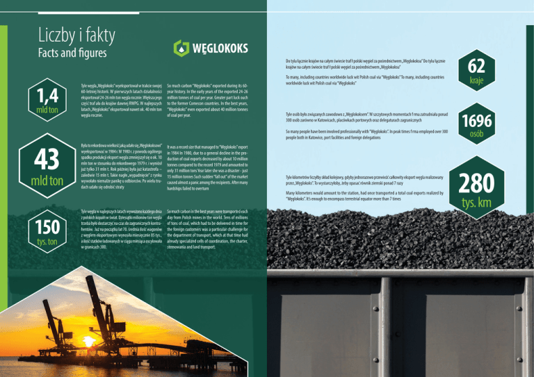 Liczby i fakty Facts and figures 1,4 mld ton 43 mld ton 150 tys. ton Tyle węgla „Węglokoks” wyeksportował w trakcie swojej 60-letniej historii. W pierwszych latach działalności eksportował 24-26 mln ton węgla rocznie. Większa jego część traf ała do krajów dawnej RWPG. W najlepszych latach „Węglokoks” eksportował nawet ok. 40 mln ton węgla rocznie. Do tylu łącznie krajów na całym świecie traf ł polski węgiel za pośrednictwem „Węglokoksu” Do tylu łącznie krajów na całym świecie traf ł polski węgiel za pośrednictwem „Węglokoksu” So much carbon “Węglokoks” exported during its 60year history. In the early years of the exported 24-26 million tonnes of coal per year. Greater part luck ouch to the former Comecon countries. In the best years, “Węglokoks” even exported about 40 million tonnes of coal per year. To many, including countries worldwide luck wit Polish coal via “Węglokoks” To many, including countries worldwide luck wit Polish coal via “Węglokoks” Tyle osób było związanych zawodowo z „Węglokoksem”. W szczytowych momentach f rma zatrudniała ponad 300 osób zarówno w Katowicach, placówkach portowych oraz delegaturach zagranicznych So many people have been involved professionally with “Węglokoks”. In peak times f rma employed over 300 people both in Katowice, port facilities and foreign delegations Była to rekordowa wielkość jaką udało się„Węglokoksowi” wyeksportować w 1984 r. W 1980 r. z powodu ogólnego spadku produkcji eksport węgla zmniejszył się o ok. 10 mln ton w stosunku do rekordowego 1979 r. i wyniósł już tylko 31 mln t. Rok później była już katastrofa – zaledwie 15 mln t. Takie nagłe „wypadnięcie” z rynku wywołało niemalże panikę u odbiorców. Po wielu trudach udało się odrobić straty Tyle węgla w najlepszych latach wywożono każdego dnia z polskich kopalń w świat. Dziesiątki milionów ton węgla trzeba było dostarczyć na czas do zagranicznych kontrahentów. Już na początku lat 70. średnia ilość wagonów z węglem eksportowym wynosiła miesięcznie 85 tys., a ilość statków ładowanych w ciągu miesiąca oscylowała w granicach 300. It was a record size that managed to “Węglokoks” export in 1984 In 1980, due to a general decline in the production of coal exports decreased by about 10 million tonnes compared to the record 1979 and amounted to only 31 million tons Year later she was a disaster - just 15 million tonnes Such sudden “fall out” of the market caused almost a panic among the recipients. After many hardships failed to overturn So much carbon in the best years were transported each day from Polish mines in the world. Tens of millions of tons of coal, which had to be delivered in time for the foreign customers was a particular challenge for the department of transport, which at that time had already specialized cells of coordination, the charter, stemowania and land transport. Tyle kilometrów liczyłby skład kolejowy, gdyby jednorazowo przewieźć całkowity eksport węgla realizowany przez „Węglokoks”. To wystarczyłoby, żeby opasać równik ziemski ponad 7 razy Many kilometers would amount to the station, had once transported a total coal exports realized by “Węglokoks”. It’s enough to encompass terrestrial equator more than 7 times 62 kraje 1696 osób 280 tys. km
