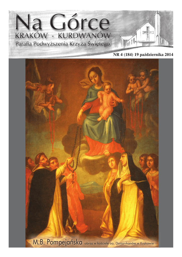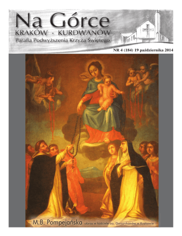 Nr 4 (184) Na Górce 19 października 2014 NR 4 (184) 19 października 2014 M.B. Pompejańska obraz w kościele oo. Dominikanów w Krakowie 1 19 października 2014 Modlitwa ŚDM Kraków 2016 Boże, Ojcze Miłosierny, który objawiłeś swoją miłość w Twoim Synu Jezusie Chrystusie i wylałeś ją na nas w Duchu Świętym, Pocieszycielu, Tobie zawierzamy dziś losy świata i każdego człowieka. Zawierzamy Ci szczególnie ludzi młodych ze wszystkich narodów, ludów i języków. Prowadź ich bezpiecznie po zawiłych ścieżkach współczesnego świata i daj im łaskę owocnego przeżycia Światowych Dni Młodzieży w Krakowie. Ojcze niebieski, uczyń nas świadkami Twego miłosierdzia. Naucz nieść wiarę wątpiącym, nadzieję zrezygnowanym, miłość oziębłym, przebaczenie winnym i radość smutnym. Niech iskra miłosiernej miłości, którą w nas zapaliłeś, stanie się ogniem przemieniającym ludzkie serca i odnawiającym oblicze ziemi. Maryjo, Matko Miłosierdzia, módl się za nami. Święty Janie Pawle II, módl się za nami. Na Górce Nr 4 (184) Parafia Podwyższenia Krzyża Świętego w Krakowie Kurdwanowie ul. Witosa 9, 30-612 Kraków, tel.: 6544569, 6544720 Porządek nabożeństw Msze św. W niedziele i święta (1stycznia - św. BOŻEJ RODZICIELKI, PONIEDZIAŁEK WIELKANOCNY, 3 maja - NAJŚWIĘTSZEJ MARYI PANNY KRÓLOWEJ POLSKI, BOŻE CIAŁO, 15 sierpnia - WNIEBOWZIĘCIE NAJŚWIĘTSZEJ MARYI PANNY, 1 listopada – WSZYSTKICH ŚWIĘTYCH, BOŻE NARODZENIE i św. Szczepana): 7.00, 8.30, 10.00, 11.30, 13.00, 14.15, 17.00 i 19.00 (Od 1. października 2007r. w każdą niedzielę odbywa się msza św. o godz. 14.15 dla rodzin z małymi dziećmi z możliwością udzielenia sakramentu chrztu św.) Msze św. w dniu 6. stycznia w święto Objawienia Pańskiego jak w każdą niedzielę 2 LUTEGO-OFIAROWANIE PAŃSKIE, ŚRODA POPIELCOWA, DZIEŃ ZADUSZNY; 8 GRUDNIA-NIEPOKALANE POCZĘCIE NAJŚWIĘTSZEJ MARYI PANNY 6.30, 7.15, 8.00,16.00, 17.00, 18.00,19.00 W dni powszednie: 6.30, 7.00, 18.00 W dni powszednie – w ferie i wakacje: 7.00, 18.00 W pierwsze piątki: 6.30, 7.00, 16.30, 18.00 Nowenna do Matki Bożej Nieustającej Pomocy - w każdą środę po Mszy św. wieczornej. Adoracja Najświętszego Sakramentu - w pierwszy czwartek miesiąca o godz. 18.30 „Na Górce” Adoracja Najświętszego Sakramentu w kaplicy - biuletyn Parafii Podwyższenia Krzyża - od poniedziałku do soboty w godz. 7.30 – 21.00 Świętego w Krakowie Kurdwanowie Różaniec za zmarłych Redagują: - w trzeci wtorek miesiąca o godz. 17.30 fot. M.Pabis E. Biedrzycka-Wołek, M. Czekaj, B. Czerwińska, M. Fortuna-Sudor, Z Sakramentu Pokuty korzystać można: B. Grabowska (red.nacz), W niedziele i święta – 20 minut przed każdą Mszą św. ks. P. Kummer, R. Kurdybowicz, W dni powszednie w godz. 6.30 – 7.30 i 18.00 do 18.30 S. Lesiewicz, ks. J. Mrowca, M. Powązka, E. Stadtmüller, Nabożeństwa Wielkiego Postu w naszym kościele: A. Tokarz, D. Waksmundzka, Droga Krzyżowa - piątki, godz. 8, 16 - dla dzieci, 17, 19 - dla młodzieży. G. Kania. Gorzkie Żale - niedziele, godz. 18 Biuletyn „Na Górce” jest redagowany bez Kancelaria parafialna Od poniedziałku do piątku (z wyjątkiem pierwszego piątku miesiąca) w godz. 9.00 – 10.00 i 16.00 - 17.30. W soboty w godz. 9.00 – 10.00. Kancelaria Parafialna w czasie ferii zimowych i wakacji czynna jest wyłącznie w poniedziałki i czwartki. Księża pracujący w parafii: Ks. Jan Mrowca - proboszcz, ks. Jan Dziubek, ks. Krzysztof Główka, ks. Ryszard Ptak, ks. Rafał Salawa. honorariów. Kontakt z redakcją: Kraków, ul. Witosa 9, z dopiskiem: „Na Górce” e-mail: [email protected] adres strony internetowej naszej parafii: http://www.krakow-kurdwanow.parafia.info.pl adres e-mail: kurdwanow_parafi[email protected] 2 Nr 4 (184) Na Górce 19 października 2014 Jak paciorki Różańca... Modlitwa Różańcowa, odmawiana przez Kościół Katolicki szczególnie w październiku, jest bardzo popularnym i autentycznie katolickim nabożeństwem Maryjnym. Różaniec to słowa i kontemplacja. Forma tej modlitwy ma swoją historię, ale zawsze była bardzo ewangeliczna, bo opierała się na słowach z Pisma Św.: „Ojcze nasz...” i „Zdrowaś Maryjo...”. O Różańcu mówiło i pisało wielu wybitnych czcicieli Matki Najświętszej. Na przykład Św. Jan Paweł II: „Różaniec, odmawiany powoli i rozważany - w rodzinie, grupie czy osobiście - stopniowo przybliży nas do uczuć Jezusa Chrystusa i Jego Matki, przywołując wszystkie wydarzenia będące kluczem do naszego zbawienia.”(06.05.1980 r.) Czy nie jest tak, że często lekceważymy modlitwę Różańcową? Dla jednych jest zbyt długa, dla innych nudna, jeszcze dla innych - staroświecka. Wydaje się, że dla wielu jest po prostu nieznana i niezgłębiona. Ks. Jan Mrowca Jan Paweł II w wierszu Juliusza Słowackiego POŚRÓD NIESNASKÓW - PAN BÓG UDERZA... Pośród niesnasków - Pan Bóg uderza W ogromny dzwon, Dla Słowiańskiego oto Papieża Otwarty tron. Ten przed mieczami tak nie uciecze Jako ten Włoch, On śmiało jak Bóg pójdzie na miecze; Świat mu - to proch. Twarz jego, słońcem rozpromieniona, Lampą dla sług, Za nim rosnące pójdą plemiona W światło - gdzie Bóg. Na jego pacierz i rozkazanie Nie tylko lud Jeśli rozkaże - to słońce stanie, Bo moc - to cud. * On się już zbliża - rozdawca nowy Globowych sił, Cofnie się w żyłach pod jego słowy Krew naszych żył; W sercach się zacznie światłości Bożej Strumienny ruch, Co myśl pomyśli przezeń, to stworzy, Bo moc - to duch. A trzebaż mocy, byśmy ten Pański Dźwignęli świat... Więc oto idzie - Papież Słowiański, Ludowy brat... Oto już leje balsamy świata Do naszych łon, Hufiec aniołów - kwiatem umiata Dla niego tron. On rozda miłość, jak dziś mocarze Rozdają broń, Sakramentalną moc on pokaże, Świat wziąwszy w dłoń. * Gołąb mu słowa - słowem wyleci, Poniesie wieść, Nowinę słodką,
