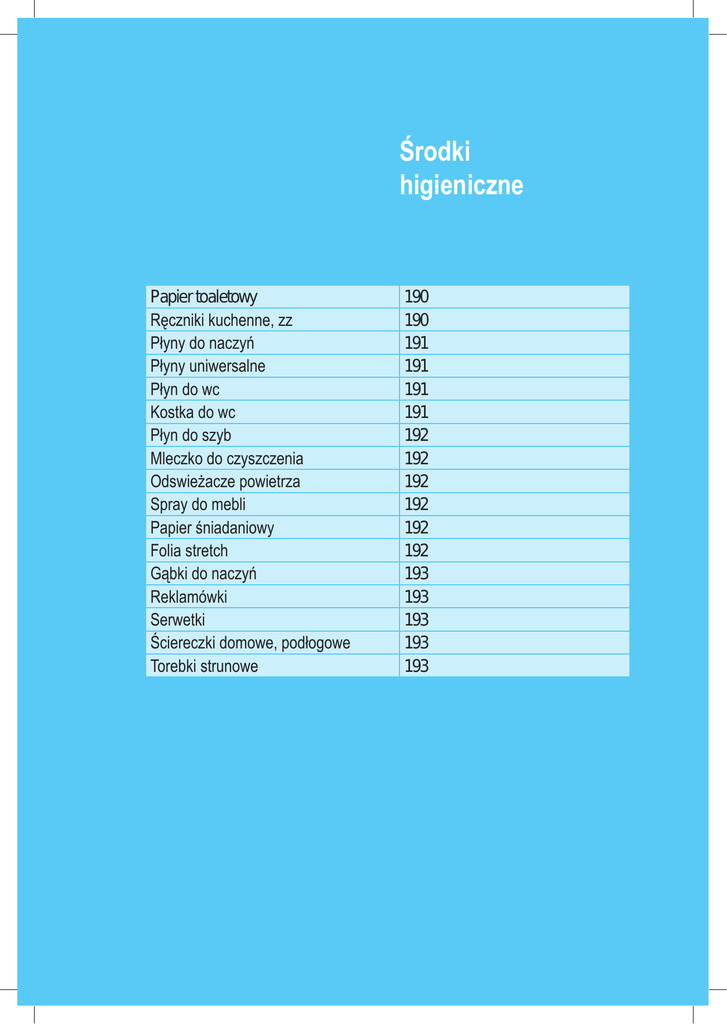 Środki higieniczne Papier toaletowy Ręczniki kuchenne, zz Płyny do naczyń Płyny uniwersalne Płyn do wc Kostka do wc Płyn do szyb Mleczko do czyszczenia Odswieżacze powietrza Spray do mebli Papier śniadaniowy Folia stretch Gąbki do naczyń Reklamówki Serwetki Ściereczki domowe, podłogowe Torebki strunowe 190 190 191 191 191 191 192 192 192 192 192 192 193 193 193 193 193 ŚRODKI HIGIENICZNE Papier toaletowy , Ręczniki Indeks LB PT11 ME 071 Opis Mola Papier toaletowy 8 rol.Mola Mola Ręczniki 4 szt. Classic Harmony a”2 ręcznik kuchenny Tira ręcznik celulozowy Indeks KLU 7/2 KLU 7/21 Opis - Tira "300" ręcznik celulozowy 300 listków - Tira „500” ręcznik celulozowy 500 listków Chusteczki Harmony - Prima Soft chust.higieniczna 10x10 trójwarstwowa ŚRODKI HIRIENICZNE Indeks KLU 7/4 ME ZZ/B ME ZZB ME ZZ Opak. Ręcznik papierowy a;2 Classic Ręcznik ZZ biały do podajników 4000 szt Recznik ZZ szary do podajników 4000 szt Ręcznik ZZ zielony do podajników 4000 szt Mydło w płynie Indeks CHE 20/3 CHE 20/2 190 Rodzaj Mydło w płynie z dozownikem Mydło w płynie 5 L - Prima pudełko a”100 chust. uniwersalna Indeks COR 9 COR 7/1 KLU 6 Opak. folia pudełko folia Worki Office Products Indeks KF 21113 KF 21123 KF 21218 KF 21222 KF 22232 KF 22242 KF 23218 KF 23222 KF 23232 Opis (HDPE) STANDARD 35L/50 szt. (HDPE) STANDARD 60L/50 szt. (LDPE) MOCNE 35L/15 szt. (LDPE) MOCNE 60L/10 szt. (LDPE) SUPER MOCNE 120L/10 szt. (LDPE) SUPER MOCNE 160L/10 szt. z taśmą, (LDPE) SUPER MOCNE 35L/15 szt. z taśmą, (LDPE) SUPER MOCNE 60L/10 szt. z taśmą, (LDPE) SUPER MOCNE 120L/10 szt. ŚRODKI HIGIENICZNE Płyn do naczyń Ludwik Płyny do mycia naczyń Pojemność 1l. Indeks CHE 28/02 CHE 28/01 CHE 28/03 Pojemność Płyn do naczyń 0,5l Płyn do naczyń 1L Płyn do naczyń 5L Płyn do naczyń Fairy Indeks CHE 103/1 CHE 8/1 Opis 0,5 l 1l Płyn do WC DOMESTOS Indeks CHE 25 Opis Płyn do WC Domestos zapach Citrus, leśny , atlanitic Kolor Płyn do naczyń Pur 1 L Płyn do naczyń Fairy 1L Płyn do naczyń 5L Płyn do czyszczenia Ajax Indeks CHE 15/1 BK 118 CHE 15/4 Opis Płyn do szyb 500 ml Ajax Płyn uniwersalny Ajax Floral Fiesta Płyn Kamień i rdza ŚRODKI HIGIENICZNE Płyn do naczyń Fairy to efektywnie sokncentorwana formuła - dobry sposób na oszczędność. Mnóstwo piany, która działa i starcza na długo. Super skuteczny, świetnie rozpuszcza tłuszcz nawet w zimnej wodzie. Delikatny dla dłoni. Indeks CHE 95 CHE 8/1 CHE 94 Kostka do WC DOMESTOS Indeks CHE 49 CHE 47 Opis Domestos WC koszyk Domestos WC wkład 191 ŚRODKI HIGIENICZNE Płyn do szyb WINDOW Mleczko do czyszczenia CIF Pojemność 500 ml. Indeks CHE 212 CHE 81 CHE 211 Opis Płyn do szyb Windows 750 ml Płyn do szyb MR.MUSCLE 500 ml Płyn do szyb Clin Odświeżacz powietrza – areozol, żel ŚRODKI HIGIENICZNE Indeks CHE 6 LB OD1 Opis Odswieżacz powietrza Spray Odświeżacz powietrza żel stojący Indeks CHE 202 CHE 1/2 CHE 210 Opis Mleczko CIF 250 ml Mleczko CIF 500 ml Mleczko CIF 700 ml Spray do mebli Pronto Indeks CHE 8 CHE 8 CHE 8 Opis Clasic Jasmin Lemon Papier śniadaniowy Folia stretch Opakowanie 25 ark. Służy do ręcznego owijania paczek, szerokość rolki: 500mm, grubość folii: 23µm, średnica tuby wewnętrznej: 2 cale, rozciągliwość: 180%, waga: 1,7 kg lub 1,2 kg. Indeks LB PS 192 Indeks KF 15673 KF 15672 PPL T8 PPL T9 Opis 1,7 Kg 1,2 Kg 1,4 czarna 2,5 czarna ŚRODKI HIGIENICZNE Gąbka do naczyń Reklamówki Gąbki do naczyń mają dobrze dobraną wielkość – znakomicie pasują do dłoni, zapewniając jednocześnie optymalne mycie naczyń; część miękka - wykonana z pianki poliestrowej - dobrze spienia środki myjące – jest też bardzo chłonna; część zielona – szorstka – służy do usuwania najtrwalszych zabrudzeń – nie rysuje jednak czyszczonych powierzchni; w opakowaniu znajduje się 5 różnokolorowych gąbek. Reklamówki jednorazowe HDPE Indeks CHE 11 Ilość 10 szt Opis Gąbka do naczyń a;10 Indeks PPL T/008 PPL T/001 PPL T/002 PPL T/003 PPL T/004 PPL T/005 Opis 17/4X32 18/4X30 25/5,5X45 30/9X55 40/10/80 43/10/80 Ilość A;100 SZT A;200 SZT A:200 SZT A;160 SZT A:100 SZT A:100 SZT Ściereczki domowe ekstra grube Opakowanie 20 szt. Wymiar 33x33 cm. Trzy miękkie, uniwersalne ściereczki domowe mają wszechstronne zastosowanie; unikalnemu splotowi włókien zawdzięczamy, że są delikatne i bardzo wytrzymałe; doskonale usuwają brud, tłuszcz i kurz; nadają się do mycia na mokro i do wycierania na sucho; wymiar 38x40 cm. Indeks COR 12/2 LB SF COR 13/4 COR 13/2 COR 13/9 COR 6/5 Opis Czerwone Fioletowe Granatowe Kremowe Zielone Wzorzyste Indeks CHE 21/4 CHE S/LU Opis Ściereczki uniwersalne a;3 kolor Ściereczka z mikrofibry Ścierka do podłogi Torebki strunowe Wymiar 50x60 cm. Opakowanie 100 szt. Indeks BK 119 Indeks PPL S11 PPL S16 PPL S4 PPL S9 PPL S14 PPL S17 PPL S13 PPL S10 PPL S5 PPL S3 PPL S6 PPL S33 PPL S1 PPL S22 PPL S24 PPL S20 PPL S25 PPL S19 PPL S19 PPL S23 PPL S15 PPL S12 PPL S18 PPL S21 ŚRODKI HIGIENICZNE Serwetki jednokolorowe Elegance Opis 40X60 50X70 60X80 70X100 80X120 90X200 100X100 100X120 100X150 150X200 150X250 150X300 160X250 120X180 170X230 190X250 200X300 200X250 220X280 230X320 240X340 250X350 300X400 350X450 193 Szeroki wybór produktów