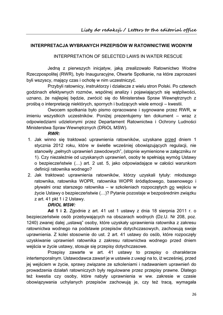 Listy do redakcji / Letters to the editorial office INTERPRETACJA WYBRANYCH PRZEPISÓW W RATOWNICTWIE WODNYM INTERPRETATION OF SELECTED LAWS IN WATER RESCUE Jedną z pierwszych inicjatyw, jaką zrealizowało Ratownictwo Wodne Rzeczpospolitej (RWR), było Inauguracyjne, Otwarte Spotkanie, na które zaproszeni byli wszyscy, mający czas i ochotę w nim uczestniczyć. Przybyli ratownicy, instruktorzy i działacze z wielu stron Polski. Po czterech godzinach efektywnych rozmów, wspólnej analizy i pojawiających się wątpliwości, uznano, że najlepiej będzie, zwrócić się do Ministerstwa Spraw Wewnętrznych z prośbą o interpretację niektórych, spornych i budzących wiele emocji – kwestii. Owocem spotkania było pismo opracowane i sygnowane przez RWR, w imieniu wszystkich uczestników. Poniżej prezentujemy ten dokument – wraz z odpowiedziami udzielonymi przez Departament Ratownictwa i Ochrony Ludności Ministerstwa Spraw Wewnętrznych (DRiOL MSW). RWR: 1. Jak winno się traktować uprawnienia ratowników, uzyskane przed dniem 1 stycznia 2012 roku, które w świetle wcześniej obowiązujących regulacji, nie stanowiły „pełnych uprawnień zawodowych”, (stopnie wymienione w załączniku nr 1). Czy niezależnie od uzyskanych uprawnień, osoby te spełniają wymóg Ustawy o bezpieczeństwie (…) art. 2 ust. 5, jako odpowiadające w całości warunkom definicji ratownika wodnego? 2. Jak traktować uprawnienia ratowników, którzy uzyskali tytuły: młodszego ratownika, ratownika WOPR, ratownika WOPR śródlądowego, basenowego i pływalni oraz starszego ratownika – w szkoleniach rozpoczętych po wejściu w życie Ustawy o bezpieczeństwie (…)? Pytanie pozostaje w bezpośrednim związku z art. 41 pkt 1 i 2 Ustawy. DRiOL MSW: Ad 1 i 2. Zgodnie z art. 41 ust 1 ustawy z dnia 18 sierpnia 2011 r. o bezpieczeństwie osób przebywających na obszarach wodnych (Dz.U. Nr 208, poz. 1240) zwanej dalej „ustawą” osoby, które uzyskały uprawnienia ratownika z zakresu ratownictwa wodnego na podstawie przepisów dotychczasowych, zachowują swoje uprawnienia. Z kolei stosownie do ust. 2 art. 41 ustawy do osób, które rozpoczęły uzyskiwanie uprawnień ratownika z zakresu ratownictwa wodnego przed dniem wejścia w życie ustawy, stosuje się przepisy dotychczasowe. Przepisy zawarte w art. 41 ustawy to przepisy o charakterze intertemporalnym. Ustawodawca zawarł je w ustawie z uwagi na to, iż wcześniej, przed jej wejściem w życie, sprawy związane ze szkoleniami i nadawaniem uprawnień do prowadzenia działań ratowniczych były regulowane przez przepisy prawne. Dlatego też kwestia czy osoby, które nabyły uprawnienia w ww. zakresie w czasie obowiązywania uchylanych przepisów zachowują je, czy też tracą, wymagała 26 uregulowania. Podobnie, jak kwestia szkoleń rozpoczętych na zasadach określanych przez tracące moc obowiązującą przepisy. Do dnia 1 stycznia 2012 r., tj. do dnia wejścia w życie ustawy, prowadzenie szkoleń służby ratowniczej oraz nadawania stopni ratowniczych i określania uprawnień do prowadzenia działań ratowniczych, w zależności od posiadanych kwalifikacji stanowiło, w myśl § 3 ust. 1 pkt 2 i 4 rozporządzenia Ministra Spraw Wewnętrznych i Administracji z dnia 12 listopada 2002 r. w sprawie szczegółowego zakresu obowiązków i uprawnień specjalistycznych organizacji ratowniczych, warunków ich wykonywania przez inne organizacje ratownicze rodzaju i wysokości świadczeń przysługujących ratownikom górskim i wodnym w związku z udziałem w akcji ratowniczej (Dz.U. Nr 193, poz. 1624) uprawnienie specjalistycznych organizacji ratowniczych. Specjalistyczna organizacją ratowniczą było m.in. Wodne Ochotnicze Pogotowie Ratunkowe (WOPR). Prawo do prowadzenia szkoleń służby ratowniczej oraz określania uprawnień do prowadzenia działań ratowniczych, w zależności od posiadanych kwalifikacji przysługiwało również organizacjom ratowniczym, które posiadały zgodę ministra właściwego do spraw wewnętrznych na wykonywanie obowiązków i uprawnień specjalistycznych organizacji ratowniczych (zgodę taka miały Mazurska Służba Ratownicza i Mazurskie Wodne Ochotnicze Pogotowie Ratunkowe). Ustawodawca w art. 41 ustawy użył zwrotu „uprawnień ratownika z zakresu ratownictwa wodnego”, przy czym nie wyjaśnił, o jakie uprawnienia chodzi. Biorąc pod uwagę przepis § 3 ust. pkt 4 ww. rozporządzenia, zasadnym jest wniosek, iż chodzi o zachowanie uprawnień ratownika bez wskazywania uprawnień przypisywanych konkretnemu stopniowi ratowniczemu, oznacza to, że swoje uprawnienia zachowała osoba będąca zarówno w stopniu młodszego ratownika, ratownika czy też starszego ratownika. W ocenie Departamentu Ratownictwa i Ochrony Ludności przepis art. 41 ustawy pozwala co najwyżej na przyjęcie, iż osoby, o których mowa w tym przepisie posiadają wiedzę i umiejętności z zakresu ratownictwa, o których mowa w art. 2 pkt 5 ustawy i jeżeli spełniają pozostałe warunki określone w tym przepisie, mogą zostać uznane za ratownika wodnego. Z kolei – w ocenie Departamentu Ratownictwa i Ochrony Ludności – intencją ustawodawcy we wprowadzeniu przepisu art. 41 ust. 2 ustawy było umożliwienie osobom uczestniczącym w szkoleniach na dany stopień ratowniczy rozpoczętych przed dniem 1 stycznia 2012 r. ukończenie tych szkoleń i zdobycie uprawnień, których odbycie danego szkolenia gwarantowało. Osoby te niewątpliwie posiadają również wiedzę i umiejętności z zakresu ratownictwa, o których mowa w art. 2 pkt 5 ustawy. RWR: 3. Czy można nadawać tytuł ratownika wodnego osobom, które nie posiadają ważnych uprawnień ratownika KPP? (w załączniku nr 2, screen strony internetowej Dolnośląskiego WOPR, z której wynika, że ratownik wodny przystępujący do egzaminu – czyli kończący szkolenie, ma mieć ukończony 17 rok życia, a co za tym idzie – nie może posiadać szkolenia Ratownika KPP). DRiOL MSW: 27 Ad 