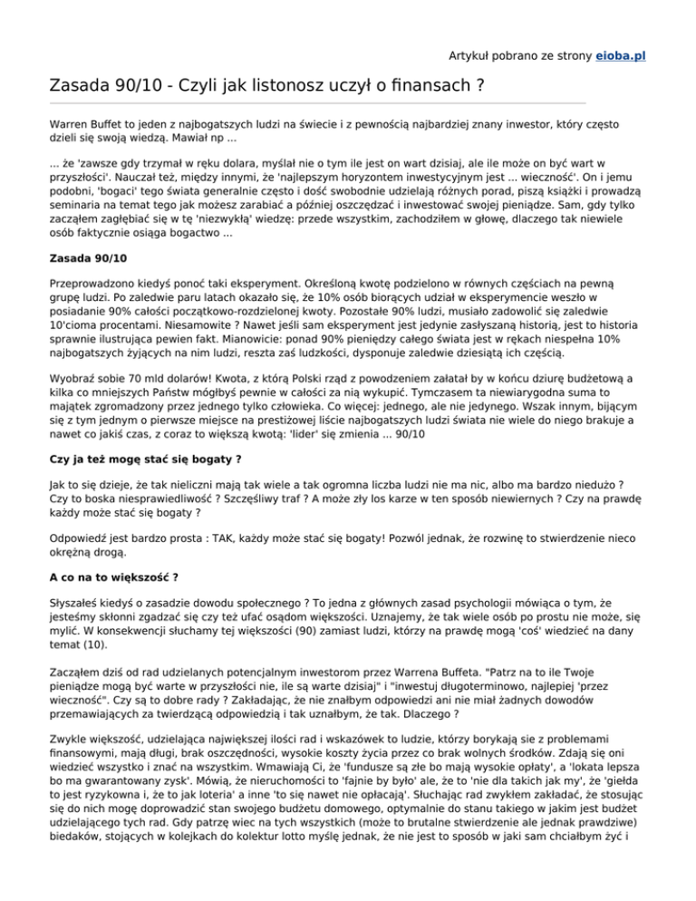 Artykuł pobrano ze strony eioba.pl Zasada 90/10 - Czyli jak listonosz uczył o finansach ? Warren Buffet to jeden z najbogatszych ludzi na świecie i z pewnością najbardziej znany inwestor, który często dzieli się swoją wiedzą. Mawiał np ... ... że 'zawsze gdy trzymał w ręku dolara, myślał nie o tym ile jest on wart dzisiaj, ale ile może on być wart w przyszłości'. Nauczał też, między innymi, że 'najlepszym horyzontem inwestycyjnym jest ... wieczność'. On i jemu podobni, 'bogaci' tego świata generalnie często i dość swobodnie udzielają różnych porad, piszą książki i prowadzą seminaria na temat tego jak możesz zarabiać a później oszczędzać i inwestować swojej pieniądze. Sam, gdy tylko zacząłem zagłębiać się w tę 'niezwykłą' wiedzę: przede wszystkim, zachodziłem w głowę, dlaczego tak niewiele osób faktycznie osiąga bogactwo ... Zasada 90/10 Przeprowadzono kiedyś ponoć taki eksperyment. Określoną kwotę podzielono w równych częściach na pewną grupę ludzi. Po zaledwie paru latach okazało się, że 10% osób biorących udział w eksperymencie weszło w posiadanie 90% całości początkowo-rozdzielonej kwoty. Pozostałe 90% ludzi, musiało zadowolić się zaledwie 10'cioma procentami. Niesamowite ? Nawet jeśli sam eksperyment jest jedynie zasłyszaną historią, jest to historia sprawnie ilustrująca pewien fakt. Mianowicie: ponad 90% pieniędzy całego świata jest w rękach niespełna 10% najbogatszych żyjących na nim ludzi, reszta zaś ludzkości, dysponuje zaledwie dziesiątą ich częścią. Wyobraź sobie 70 mld dolarów! Kwota, z którą Polski rząd z powodzeniem załatał by w końcu dziurę budżetową a kilka co mniejszych Państw mógłbyś pewnie w całości za nią wykupić. Tymczasem ta niewiarygodna suma to majątek zgromadzony przez jednego tylko człowieka. Co więcej: jednego, ale nie jedynego. Wszak innym, bijącym się z tym jednym o pierwsze miejsce na prestiżowej liście najbogatszych ludzi świata nie wiele do niego brakuje a nawet co jakiś czas, z coraz to większą kwotą: 'lider' się zmienia ... 90/10 Czy ja też mogę stać się bogaty ? Jak to się dzieje, że tak nieliczni mają tak wiele a tak ogromna liczba ludzi nie ma nic, albo ma bardzo niedużo ? Czy to boska niesprawiedliwość ? Szczęśliwy traf ? A może zły los karze w ten sposób niewiernych ? Czy na prawdę każdy może stać się bogaty ? Odpowiedź jest bardzo prosta : TAK, każdy może stać się bogaty! Pozwól jednak, że rozwinę to stwierdzenie nieco okrężną drogą. A co na to większość ? Słyszałeś kiedyś o zasadzie dowodu społecznego ? To jedna z głównych zasad psychologii mówiąca o tym, że jesteśmy skłonni zgadzać się czy też ufać osądom większości. Uznajemy, że tak wiele osób po prostu nie może, się mylić. W konsekwencji słuchamy tej większości (90) zamiast ludzi, którzy na prawdę mogą 'coś' wiedzieć na dany temat (10). Zacząłem dziś od rad udzielanych potencjalnym inwestorom przez Warrena Buffeta. "Patrz na to ile Twoje pieniądze mogą być warte w przyszłości nie, ile są warte dzisiaj" i "inwestuj długoterminowo, najlepiej 'przez wieczność". Czy są to dobre rady ? Zakładając, że nie znałbym odpowiedzi ani nie miał żadnych dowodów przemawiających za twierdzącą odpowiedzią i tak uznałbym, że tak. Dlaczego ? Zwykle większość, udzielająca największej ilości rad i wskazówek to ludzie, którzy borykają sie z problemami finansowymi, mają długi, brak oszczędności, wysokie koszty życia przez co brak wolnych środków. Zdają się oni wiedzieć wszystko i znać na wszystkim. Wmawiają Ci, że 'fundusze są złe bo mają wysokie opłaty', a 'lokata lepsza bo ma gwarantowany zysk'. Mówią, że nieruchomości to 'fajnie by było' ale, że to 'nie dla takich jak my', że 'giełda to jest ryzykowna i, że to jak loteria' a inne 'to się nawet nie opłacają'. Słuchając rad zwykłem zakładać, że stosując się do nich mogę doprowadzić stan swojego budżetu domowego, optymalnie do stanu takiego w jakim jest budżet udzielającego tych rad. Gdy patrzę wiec na tych wszystkich (może to brutalne stwierdzenie ale jednak prawdziwe) biedaków, stojących w kolejkach do kolektur lotto myślę jednak, że nie jest to sposób w jaki sam chciałbym żyć i zarządzać swoim budżetem. Eksperyment na .. Tobie! Gdyby dzisiaj zebrać cały majątek świata i rozdzielić każdemu dokładnie po równo za kilka lat okazałoby się pewnie, że Ty masz mniej więcej tyle ile dzisiaj, Warren Buffet na powrót jest miliarderem a ja znowu piszę artykuły by coś Ci uzmysłowić. Część z Nas ma talent, dryg czy po prostu umiejętność do zarabiania pieniędzy. To oni wyznaczają trendy i tworzą wielkie przedsiębiorstwa. Gdy jednak spojrzysz, może już nie na listę tych najbogatszych, ale na ogólne statystyki milionerów zobaczysz tam niezwykłe przypadki zwykłych ludzi, którzy przekraczają tę magiczną kwotę sześciu zer dzięki prostym planom i własnej konsekwencji. Czego możesz nauczyć się od emerytowanego listonosza ? Jednym z najznakomitszych przykładów jest Amerykanin Scott Bauer, który przez 47 lat pracy w oddziale US Postal Service w Chicago jako listonosz, codziennie odkładał 1$ na fundusze inwestycyjne. Po prawie półwieczu jego rachunek powinien więc wynosić 17.155 $ (tyle łącznie zainwestował Scott) jednak na jego koncie znajdowało się prawie 2mln dolarów! a średnia roczna stopa zwrotu wyniosła 13,7%. Gdy przyjrzysz się statystyką okaże się ,że wcale nie jest to aż tak odosobniony przypadek. 80% amerykańskich milionerów to zwykli pracownicy odkładający przez całe swoje życie drobne kwoty na zmienny % na swoim funduszu inwestycyjnym. Kogo będziesz słuchał ? To czy należysz więc do 90% mających skromne 10% pieniędzy świata, czy wręcz przeciwnie do 10% gromadzących zdecydowaną większość zależy głównie