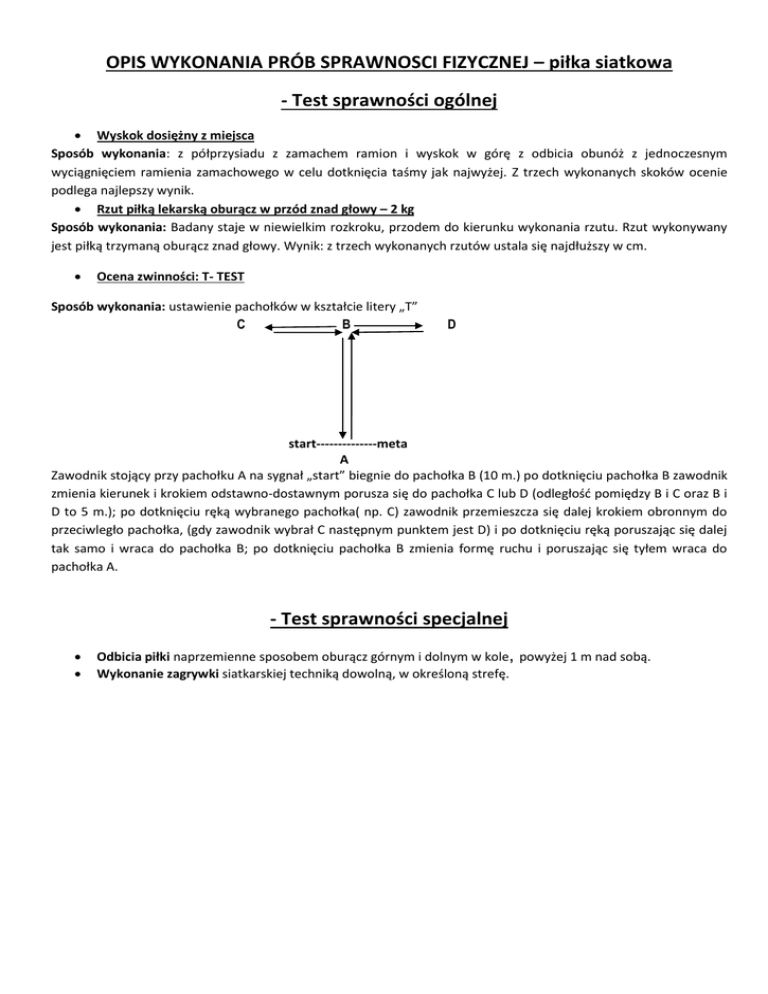 OPIS WYKONANIA PRÓB SPRAWNOSCI FIZYCZNEJ – piłka siatkowa - Test sprawności ogólnej Wyskok dosiężny z miejsca Sposób wykonania: z półprzysiadu z zamachem ramion i wyskok w górę z odbicia obunóż z jednoczesnym wyciągnięciem ramienia zamachowego w celu dotknięcia taśmy jak najwyżej. Z trzech wykonanych skoków ocenie podlega najlepszy wynik. Rzut piłką lekarską oburącz w przód znad głowy – 2 kg Sposób wykonania: Badany staje w niewielkim rozkroku, przodem do kierunku wykonania rzutu. Rzut wykonywany jest piłką trzymaną oburącz znad głowy. Wynik: z trzech wykonanych rzutów ustala się najdłuższy w cm. Ocena zwinności: T- TEST Sposób wykonania: ustawienie pachołków w kształcie litery „T” C B D start--------------meta A Zawodnik stojący przy pachołku A na sygnał „start” biegnie do pachołka B (10 m.) po dotknięciu pachołka B zawodnik zmienia kierunek i krokiem odstawno-dostawnym porusza się do pachołka C lub D (odległość pomiędzy B i C oraz B i D to 5 m.); po dotknięciu ręką wybranego pachołka( np. C) zawodnik przemieszcza się dalej krokiem obronnym do przeciwległo pachołka, (gdy zawodnik wybrał C następnym punktem jest D) i po dotknięciu ręką poruszając się dalej tak samo i wraca do pachołka B; po dotknięciu pachołka B zmienia formę ruchu i poruszając się tyłem wraca do pachołka A. - Test sprawności specjalnej Odbicia piłki naprzemienne sposobem oburącz górnym i dolnym w kole, powyżej 1 m nad sobą. Wykonanie zagrywki siatkarskiej techniką dowolną, w określoną strefę.