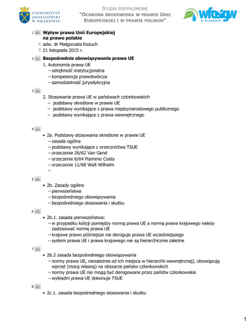 STUDIA PODYPLOMOWE "OCHRONA ŚRODOWISKA W PRAWIE UNII EUROPEJSKIEJ I W PRAWIE POLSKIM” 1 1 2 2 Wpływ prawa Unii Europejskiej na prawo polskie adw. dr Małgorzata Kożuch 21 listopada 2015 r. Bezpośrednie obowiązywanie prawa UE 1. Autonomia prawa UE – odrębność instytucjonalna – kompetencja prawotwórcza – samodzielność jurysdykcyjna 3 2. Stosowanie prawa UE w państwach członkowskich – podstawy określone w prawie UE – podstawy wynikające z prawa międzynarodowego publicznego – podstawy wynikające z prawa wewnętrznego 4 • 2a. Podstawy stosowania określone w prawie UE – zasada ogólna – podstawy wynikające z orzecznictwa TSUE – orzeczenie 26/62 Van Gend – orzeczenie 6/64 Flaminio Costa – orzeczenie 11/68 Walt Wilhelm – 5 • 2b. Zasady ogólne – pierwszeństwa – bezpośredniego obowiązywania – bezpośredniego stosowania i skutku 6 • 2b.1. zasada pierwszeństwa: – w przypadku kolizji pomiędzy normą prawa UE a normą prawa krajowego należy zastosować normę prawa UE – krajowe prawo późniejsze nie deroguje prawa UE wcześniejszego – system prawa UE i prawa krajowego nie są hierarchicznie zależne 7 • 2b.2 zasada bezpośredniego obowiązywania – normy prawa UE, niezależnie od ich miejsca w hierarchii wewnętrznej), obowiązują wprost (mocą własną) na obszarze państw członkowskich – normy prawa UE nie mogą być derogowane przez państw członkowskie – wykładni prawa UE dokonuje TSUE 8 • 2c.1. zasada bezpośredniego stosowania i skutku – normy prawa UE kreują prawa dla państw członkowskich oraz dla jednostek – sądy i organy krajowe mają obowiązek stosowania prawa UE zgodnie z jego treścią – jednostki mogą powoływać się na prawo UE – ochrona prawna powinna być efektywna 1 – normy prawa UE nie mogą być derogowane przez państw członkowskie STUDIA PODYPLOMOWE – wykładni prawa UE dokonuje TSUE 8 "OCHRONA ŚRODOWISKA W PRAWIE UNII EUROPEJSKIEJ I W PRAWIE POLSKIM” • 2c.1. zasada bezpośredniego stosowania i skutku – normy prawa UE kreują prawa dla państw członkowskich oraz dla jednostek – sądy i organy krajowe mają obowiązek stosowania prawa UE zgodnie z jego treścią – jednostki mogą powoływać się na prawo UE – ochrona prawna powinna być efektywna 9 • 3. Podstawy stosowania określone w prawie wewnętrznym • – akt akcesyjny i cenzus czasowy - orzeczenie C 161/06 Skoma Lux – wykładnia prawa przychylna prawu UE 10 • 3a. Metody wykładni – językowa – historyczna – celowościowa – kontekstowa – porównawcza 11 • 3a. Przepisy Konstytucji RP – art. 8, art. 9, art. 87, art. 91 – Orzeczenia TK 18/04, P 37/05; K 32/09; SK 45/09; U 8/08; P1/05 12 • Artykuł 2 Traktatu Akcesyjnego z 2003 r. Od dnia przystąpienia nowe Państwa Członkowskie są związane postanowieniami Traktatów założycielskich i aktów przyjętych przez instytucje Wspólnot i Europejski Bank Centralny przed dniem przystąpienia; postanowienia te są stosowane w nowych Państwach Członkowskich zgodnie z warunkami określonymi w tych Traktatach i w niniejszym akcie. • 13 Artykuł 90 Konstytucji RP • 1. Rzeczpospolita Polska może na podstawie umowy międzynarodowej przekazać organizacji międzynarodowej lub organowi międzynarodowemu kompetencje organów władzy państwowej w niektórych sprawach. • 14 Artykuł 8 ust. 1 Konstytucji RP Konstytucja jest najwyższym prawem Rzeczypospolitej Polskiej. Artykuł 9 Konstytucji RP Rzeczpospolita Polska przestrzega wiążącego ją prawa międzynarodowego. • 15 Artykuł 87 ust. 1 Konstytucji RP Źródłami powszechnie obowiązującego prawa Rzeczypospolitej Polskiej są: Konstytucja, 2 Artykuł 8 ust. 1 Konstytucji RP Konstytucja jest najwyższym prawem Rzeczypospolitej Polskiej. STUDIA PODYPLOMOWE "OCHRONA ŚRODOWISKA W PRAWIE UNII Artykuł 9 KonstytucjiERP UROPEJSKIEJ I W PRAWIE POLSKIM” Rzeczpospolita Polska przestrzega wiążącego ją prawa międzynarodowego. • 15 Artykuł 87 ust. 1 Konstytucji RP Źródłami powszechnie obowiązującego prawa Rzeczypospolitej Polskiej są: Konstytucja, ustawy, ratyfikowane umowy międzynarodowe oraz rozporządzenia. • 16 Artykuł 91 ust. 1 i 2 Konstytucji RP Ratyfikowana umowa międzynarodowa, po jej ogłoszeniu w Dzienniku Ustaw Rzeczypospolitej Polskiej, stanowi część krajowego porządku prawnego i jest bezpośrednio stosowana, chyba że jej stosowanie jest uzależnione od wydania ustawy. Umowa międzynarodowa ratyfikowana za uprzednią zgodą wyrażoną w ustawie ma pierwszeństwo przed ustawą, jeżeli ustawy tej nie da się pogodzić z umową. • 17 • Trybunał Konstytucyjny w uzasadnieniu orzeczeniu z dnia 19 grudnia 2006 r. w sprawie do sygn.: P 37/05, OTK 2006, nr 11, poz. 177, • • rozstrzyganie konkretnych spraw w oparciu o bezpośrednio stosowane przepisy prawa UE należy do sfery stosowania prawa przez sądy. 18 • Sąd Najwyższy w postanowieniu z dnia 28 kwietnia 2010 r., sygn. III CZP 3/10, LEX nr 584035, • • sądy zobowiązane są kierować zagadnienia prawne dotyczące wykładni prawa UE bezpośrednio do Trybunału Sprawiedliwości, a Sąd Najwyższy nie ma w tym zakresie kompetencji do wykładni prawa UE 19 • 4. Model stosowania prawa UE – Koncepcje monizmu (stanowisko TSUE) – Koncepcje multicentrycznych systemów – Koncepcje pluralizmu konstytucyjnego 20 • 5. Stosowanie aktów UE w wewnętrznym porządku prawnym państw – prawo pierwotne – umowy międzynarodowe – prawo wtórne a) bezpośrednio skuteczne b) wymagające implementacji – orzecznictwo TSUE 21 Artykuł 12 TWE: Państwa członkowskie nie będą wprowadzały nowych ceł przywozowych lub wywozowych ani też opłat o podobnych skutkach, ani też nie będą podwyższały tych opłat, które jeszcze obowiązują w ich wzajemnych stosunkach. • 26/62 van Gend i Loos Wspólnota tworzy nowy porządek prawa międzynarodowego, na rzecz którego państwa 3 b) wymagające implementac