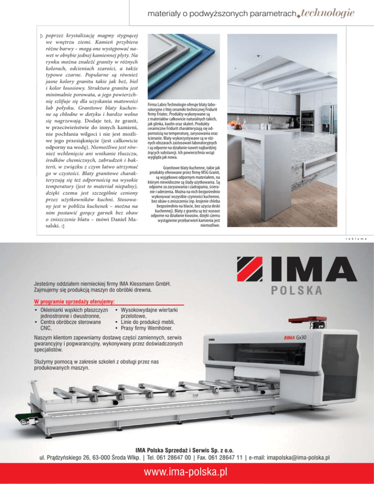 materiay opodwyszonych parametrachX technologie f poprzez krystalizację magmy stygnącej we wnętrzu ziemi. Kamień przybiera różne barwy – mogą one występować nawet w obrębie jednej kamiennej płyty. Na rynku można znaleźć granity w różnych kolorach, odcieniach szarości, a także typowo czarne. Popularne są również jasne kolory granitu takie jak beż, biel i kolor łososiowy. Struktura granitu jest minimalnie porowata, a jego powierzchnię szlifuje się dla uzyskania matowości lub połysku. Granitowe blaty kuchenne są chłodne w dotyku i bardzo wolno się nagrzewają. Dodaje też, że granit, w przeciwieństwie do innych kamieni, nie pochłania wilgoci i nie jest możliwe jego przesiąknięcie (jest całkowicie odporny na wodę). Niemożliwe jest również wchłonięcie ani wnikanie tłuszczu, środków chemicznych, zabrudzeń i bakterii, w związku z czym łatwo utrzymać go w czystości. Blaty granitowe charakteryzują się też odpornością na wysokie temperatury (jest to materiał niepalny), dzięki czemu jest szczególnie ceniony przez użytkowników kuchni. Stosowany jest w pobliżu kuchenek – można na nim postawić gorący garnek bez obaw o zniszczenie blatu – mówi Daniel Masalski. d Firma Labro Technologie oferuje blaty laboratoryjne z litej ceramiki technicznej Fridurit firmy Friatec. Produkty wykonywane są z materiałów całkowicie naturalnych takich, jak glinka, kaolin oraz skaleń. Produkty ceramiczne Fridurit charakteryzują się odpornością na temperaturę, zarysowania oraz ścieranie. Blaty wykorzystywane są w różnych obszarach zastosowań laboratoryjnych i są odporne na działanie nawet najbardziej żrących substancji. Ich powierzchnia wciąż wygląda jak nowa. Granitowe blaty kuchenne, takie jak produkty oferowane przez firmę MSG Granit, są wyjątkowo odpornym materiałem, na którym niewidoczne są ślady użytkowania. Są odporne za zarysowania i zadrapania, ścieranie i uderzenia. Można na nich bezpośrednio wykonywać wszystkie czynności kuchenne, bez obaw o zniszczenia (np. krojenie chleba bezpośrednio na blacie, bez użycia deski kuchennej). Blaty z granitu są też wysoce odporne na działanie kwasów, dzięki czemu wystąpienie przebarwień kamienia jest niemożliwe. r e k l a m a -HVWHĂP\RGG]LDïHPQLHPLHFNLHMğUP\,0$.OHVVPDQQ*PE+ =DMPXMHP\VLÚSURGXNFMÈPDV]\QGRREUöENLGUHZQD :bSURJUDPLHVSU]HGDĝ\RIHUXMHP\ ľ 2NOHLQLDUNLZÈVNLFKSïDV]F]\]Q ľ :\VRNRZ\GDMQHZLHUWDUNL MHGQRVWURQQHLbGZXVWURQQH SU]HORWRZH ľ &HQWUDREUöEF]HVWHURZDQH ľ /LQLHGRSURGXNFMLPHEOL &1& ľ 3UDV\ğUP\:HPKùQHU 1DV]\PNOLHQWRP]DSHZQLDP\GRVWDZÚF]ÚĂFL]DPLHQQ\FKVHUZLV JZDUDQF\MQ\LbSRJZDUDQF\MQ\Z\NRQ\ZDQ\SU]H]GRĂZLDGF]RQ\FK VSHFMDOLVWöZ 6ïXĝ\P\SRPRFÈZb]DNUHVLHV]NROHñ]bREVïXJLSU]H]QDV SURGXNRZDQ\FKPDV]\Q ,0$3ROVND6SU]HGDĝL6HUZLV6S]RR XO3UÈG]\ñVNLHJR¥URGD:ONS_7HO_)D[_HPDLOLPDSROVND#LPDSROVNDSO ZZZLPDSROVNDSO