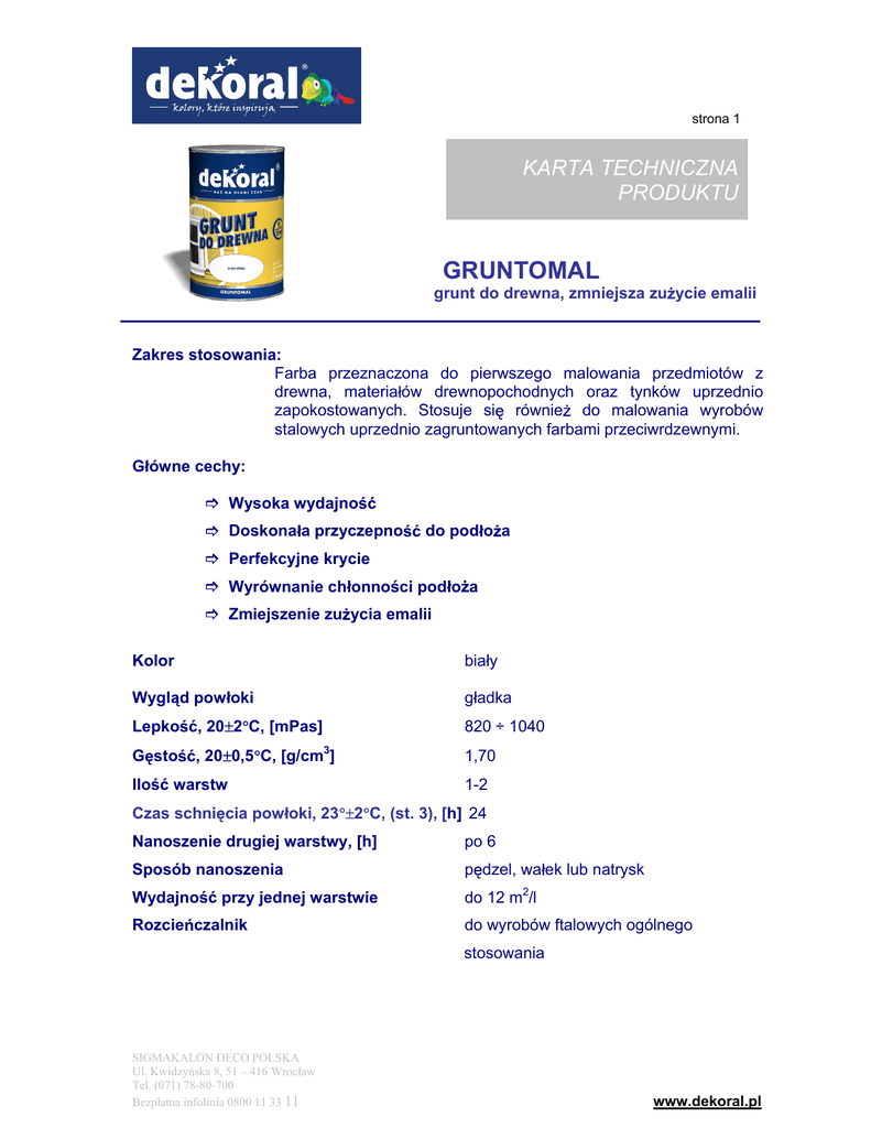 strona 1 KARTA TECHNICZNA PRODUKTU GRUNTOMAL grunt do drewna, zmniejsza zu ycie emalii Zakres stosowania: Farba przeznaczona do pierwszego malowania przedmiotów z drewna, materia ów drewnopochodnych oraz tynków uprzednio zapokostowanych. Stosuje si równie do malowania wyrobów stalowych uprzednio zagruntowanych farbami przeciwrdzewnymi. G ówne cechy: Wysoka wydajno Doskona a przyczepno do pod o a Perfekcyjne krycie Wyrównanie ch onno ci pod o a Zmiejszenie zu ycia emalii Kolor bia y Wygl d pow oki g adka Lepko , 20 2 C, [mPas] 820 ÷ 1040 G sto , 20 0,5 C, [g/cm3] 1,70 Ilo warstw 1-2 Czas schni cia pow oki, 23 2 C, (st. 3), [h] 24 Nanoszenie drugiej warstwy, [h] po 6 Sposób nanoszenia p dzel, wa ek lub natrysk Wydajno do 12 m2/l przy jednej warstwie Rozcie czalnik do wyrobów ftalowych ogólnego stosowania SIGMAKALON DECO POLSKA Ul. Kwidzy ska 8, 51 416 Wroc aw Tel. (071) 78-80-700 Bezp atna infolinia 0800 11 33 11 www.dekoral.pl strona 2 Sposób u ycia 1.Przygotowanie pod o a Z pod o a przeznaczonego do malowania nale y usun wszelkie zabrudzenia, nierówno ci, odt u ci i wysuszy . Pod o e stalowe zagruntowa podk adem antykorozyjnym UNIKOR C marki Dekoral. Pod o e drewniane - pokostem lnianym marki Drewnochron lub DREWNOCHRONEM IMPREGNATEM bezbarwnym. Tynki mineralne - pokostem lnianym marki Drewnochron. 2. Malowanie Przed u yciem wyrób nale y dok adnie wymiesza . W razie potrzeby rozcie czy rozcie czalnikiem do wyrobów ftalowych ogólnego stosowania w ilo ci max 2% obj. Malowa za pomoc p dzla, wa ka lub natrysku. Zaleca si nak adanie warstw: 12. Nanoszenie kolejnej warstwy zaleca si po 6h. 3. Dodatkowe informacje Temperatura podczas malowania i wysychania powinna wynosi co najmniej +5 0 C. Niska temperatura, zawy ona wilgotno powietrza wyd u aj czas schni cia pow oki. Po zako czeniu malowania narz dzia nale y umy rozcie czalnikiem do wyrobów ftalowych ogólnego stosowania. Wyrób przechowywa w opakowaniach szczelnie zamkni tych, z dala od róde ognia i ciep a w pomieszczeniach zamkni tych. 4. Wskazówki BHP i PPO Produkt atwopalny. Chroni przed dzie mi. Nie wprowadza do kanalizacji. W razie po kni cia niezw ocznie zasi gnij porady lekarza - poka opakowanie lub etykiet . Stosowa wy cznie w dobrze wentylowanych pomieszczeniach. Przechowywa w opakowaniach szczelnie zamkni tych z dala od róde ciep a i ognia. W czasie prac malarskich i po ich zako czeniu pomieszczenia przed u ytkowaniem wywietrzy do zaniku specyficznego zapachu. Stosowa si do zalece podanych na opakowaniu. Szczegó owe informacje zamieszczone s w Karcie Charakterystyki. Norma: Atesty: PKWiU: Data wa no ci: SIGMAKALON DECO POLSKA Ul. Kwidzy ska 8, 51 416 Wroc aw Tel. (071) 78-80-700 Bezp atna infolinia 0800 11 33 11 ZN-SKDP-029 Posiada Atest Higieniczny PZH 24.30.12-29.00 36 miesi cy od daty produkcji www.dekoral.pl strona 3 Limit zawarto ci LZO wg dyrektywy 2004/42/WE (kat. A/g/FR): 450g/l (2007)/350g/l (2010). Produkt zawiera max. 350 g/l. Opakowanie handlowe SIGMAKALON DECO POLSKA Ul. Kwidzy ska 8, 51 416 Wroc aw Tel. (071) 78-80-700 Bezp atna infolinia 0800 11 33 11 1L, 5L, 10L www.dekoral.pl