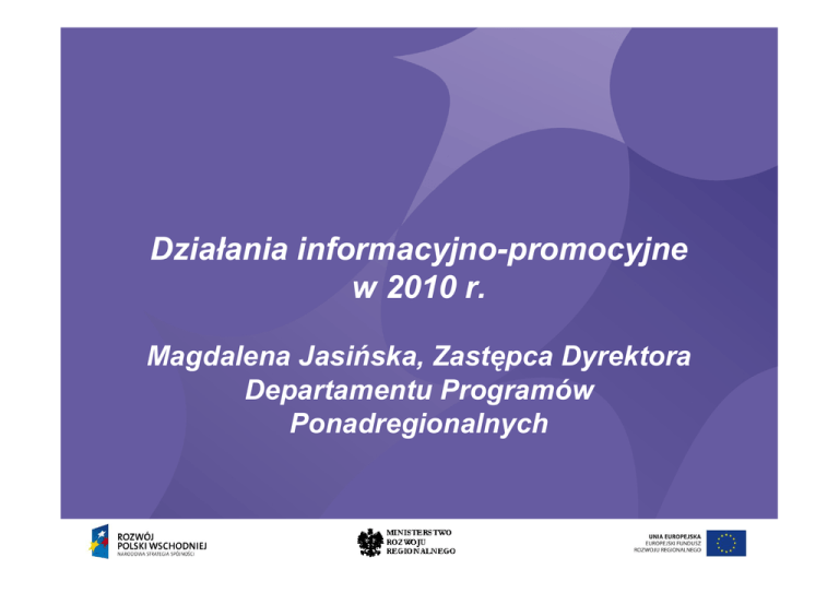 Działania informacyjno-promocyjne w 2010 r. Magdalena Jasińska, Zastępca Dyrektora Departamentu Programów Ponadregionalnych Ogólnopolska kampania informacyjna Ogólnopolska kampania informacyjna Ogólnopolska kampania informacyjna Wybrane działania promocyjne Wybrane działania promocyjne Konferencje, debaty, wymiana doświadczeń Panel rektorów, 11.10.2010 Konferencja „półmetkowa” PO RPW, 04.11.2010 III Forum Funduszy, 1-2.10.2010 Wakacje z rowerem, 25.08.2010 EFFIE za promocję PO RPW w 2009 r. Dziękuję !