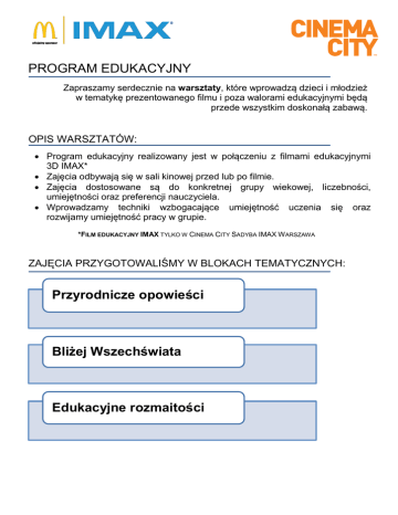 PROGRAM EDUKACYJNY Zapraszamy serdecznie na warsztaty, które wprowadzą dzieci i młodzież w tematykę prezentowanego filmu i poza walorami edukacyjnymi będą przede wszystkim doskonałą zabawą. OPIS WARSZTATÓW: Program edukacyjny realizowany jest w połączeniu z filmami edukacyjnymi 3D IMAX* Zajęcia odbywają się w sali kinowej przed lub po filmie. Zajęcia dostosowane są do konkretnej grupy wiekowej, liczebności, umiejętności oraz preferencji nauczyciela. Wprowadzamy techniki wzbogacające umiejętność uczenia się oraz rozwijamy umiejętność pracy w grupie. *FILM EDUKACYJNY IMAX TYLKO W CINEMA CITY SADYBA IMAX W ARSZAWA ZAJĘCIA PRZYGOTOWALIŚMY W BLOKACH TEMATYCZNYCH: Przyrodnicze opowieści Bliżej Wszechświata Edukacyjne rozmaitości TEMATY WARSZTATÓW Przyrodnicze opowieści Galapagos – wyspy, które zmieniły naukę [SP, GIM, PG] Wyspa Lemurów - Madagaskar [SP, GIM, PG] Rafy koralowe – podmorskie ogrody [SP, GIM, PG] Sierocińce po dwóch stronach oceanu [SP, GIM,] Podróż po delcie Okawango [SP, GIM, PG] Bliżej Wszechświata Odkryj Wszechświat własnymi rękami [SP, GIM, PG] Edukacyjne rozmaitości Aby pies był Twoim przyjacielem [SP] 4 aspekty kontaktu ze zwierzętami [SP] Zwierzę to nie rzecz [PR] PR – przedszkole SP – szkoła podstawowa, GIM – gimnazjum, PG – szkoła ponadgimnazjalna ZAREZERWUJ BILETY DLA GRUPY JUŻ DZIŚ! REZERWACJE GRUPOWE IMAX WARSZAWA, UL. POWSIŃSKA 31, 02-903 WARSZAWA TEL.: 22 550 33 22/25 E-MAIL: [email protected]
