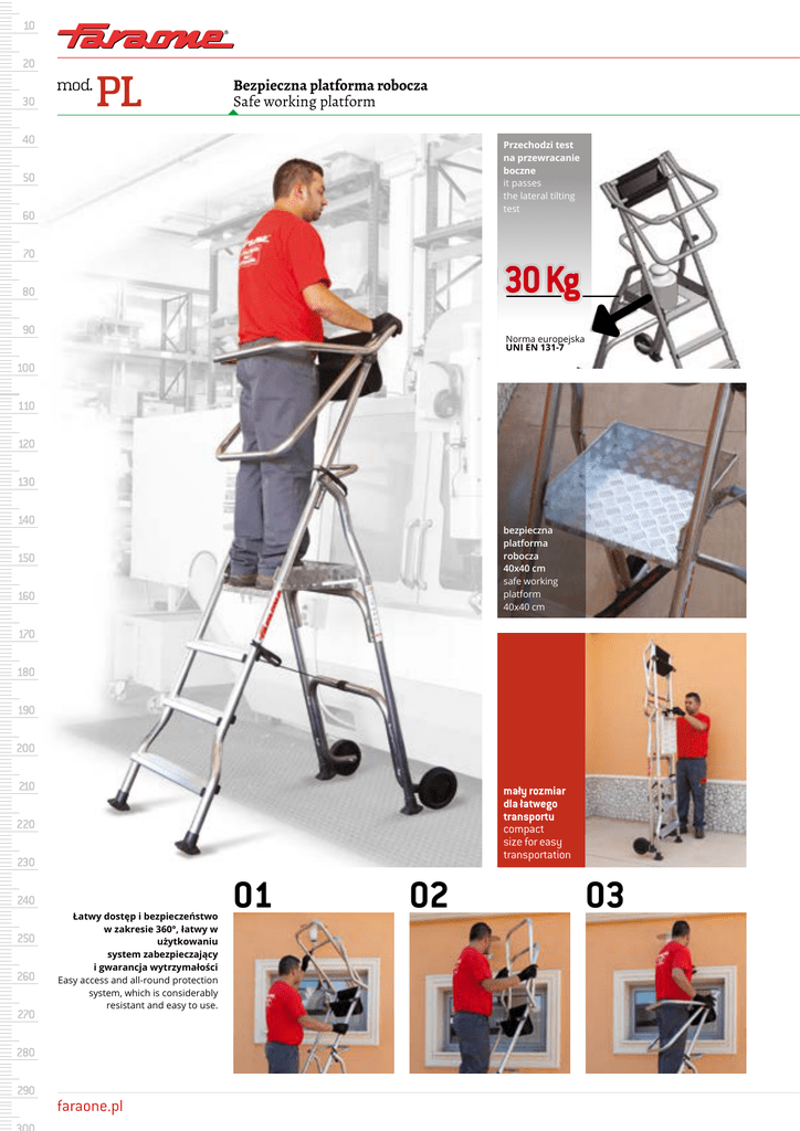 mod. PL Bezpieczna platforma robocza Safe working platform Przechodzi test na przewracanie boczne it passes the lateral tilting test Norma europejska UNI EN 131-7 bezpieczna platforma robocza 40x40 cm safe working platform 40x40 cm mały rozmiar dla łatwego transportu compact size for easy transportation Łatwy dostęp i bezpieczeństwo w zakresie 360°, łatwy w użytkowaniu system zabezpieczający i gwarancja wytrzymałości Easy access and all-round protection system, which is considerably resistant and easy to use. faraone.pl 01 02 03 105 H. MAX LAVORO WORKING HEIGHT A max MAX 150KGKg 150 3,2 MT EN 131-7 P93-353 D.L. 81 DRABINY SCALEPROFESJONALNE PROFESSIONALI /. PROFESSIONAL LADDERS GRADO DI SICUREZZA DEGREE OF SAFETY Podstawa jest ergonomicznie zaprojektowana aby omijać wszystkie przeszkody the base is ergonomically designed to overcome various obstacles / stepladders scale adrabiny castelloskładane . rolling ladders Stabilizator teleskopowy konieczny w modelach PL5 i PL6 telescopic stabilizer required on models PL5 and PL6 Absolutna stabilność podczas pracy, wygodne i szybkie przemieszczanie absolute stability while working and rapid and easy displacement specyfikacja techniczna / technical specifications MODEL ITEM LICZBA STOPNI* WAGA KG. STABILIZATORY N. OF RUNGS* WEIGHT KG. STABILISERS WYM. DRABINY LADDER DIM. A cm B cm C cm D cm D1 cm D2 cm L cm S cm PL3 PL4 PL5 PL6 3 4 5 6 72x200x34 72x228x34 72x254x37 72x282x37 252 276 300 324 72 96 120 144 116 134 152 170 72 72 72 72 167 167 68 68 68 68 200 228 254 282 34 34 37 37 13 15 17 19 NIE/NO NIE/NO TAK/YES TAK/YES * Łącznie z podestem / Work deck included D2