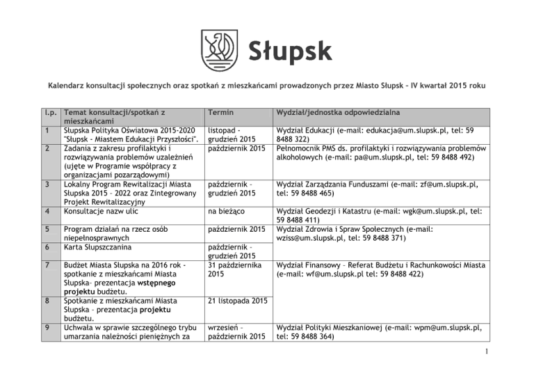 Kalendarz konsultacji społecznych oraz spotkań z mieszkańcami prowadzonych przez Miasto Słupsk – IV kwartał 2015 roku l.p. Temat konsultacji/spotkań z mieszkańcami 1 Słupska Polityka Oświatowa 2015-2020 "Słupsk - Miastem Edukacji Przyszłości". 2 Zadania z zakresu profilaktyki i rozwiązywania problemów uzaleŜnień (ujęte w Programie współpracy z organizacjami pozarządowymi) 3 Lokalny Program Rewitalizacji Miasta Słupska 2015 – 2022 oraz Zintegrowany Projekt Rewitalizacyjny 4 Konsultacje nazw ulic 5 6 7 8 9 Program działań na rzecz osób niepełnosprawnych Karta Słupszczanina BudŜet Miasta Słupska na 2016 rok spotkanie z mieszkańcami Miasta Słupska– prezentacja wstępnego projektu budŜetu. Spotkanie z mieszkańcami Miasta Słupska – prezentacja projektu budŜetu. Uchwała w sprawie szczególnego trybu umarzania naleŜności pienięŜnych za Termin Wydział/jednostka odpowiedzialna listopad grudzień 2015 październik 2015 Wydział Edukacji (e-mail: [email protected], tel: 59 8488 322) Pełnomocnik PMS ds. profilaktyki i rozwiązywania problemów alkoholowych (e-mail: [email protected], tel: 59 8488 492) październik – grudzień 2015 Wydział Zarządzania Funduszami (e-mail: [email protected], tel: 59 8488 465) na bieŜąco Wydział Geodezji i Katastru (e-mail: [email protected], tel: 59 8488 411) Wydział Zdrowia i Spraw Społecznych (e-mail: [email protected], tel: 59 8488 371) październik 2015 październik – grudzień 2015 31 października 2015 Wydział Finansowy – Referat BudŜetu i Rachunkowości Miasta (e-mail: [email protected] tel: 59 8488 422) 21 listopada 2015 wrzesień – październik 2015 Wydział Polityki Mieszkaniowej (e-mail: [email protected], tel: 59 8488 364) 1 10 lokale wchodzące w skład mieszkaniowego zasobu Miasta Słupsk Konsultacje decyzji o warunkach zabudowy, które mogą być istotne dla lokalnej społeczności na wniosek 11 Konsultacje Kierunków Rozwoju Sportu (w ramach monitoringu) grudzień Samodzielne stanowisko ds. Sportu I Rekreacji (e-mail: 2015/styczeń2016 [email protected], tel: 59 8488 234) 12 „Program ochrony środowiska Miasta Słupska na lata 2016-2020 z perspektywą na lata 2021-2024” wraz z prognozą oddziaływania na środowisko. Strategia Rozwoju Miasta Słupska 2022 Miejski Kodeks Dialogu październik 2015 Wydział Gospodarki Komunalnej i Ochrony Środowiska (e-mail: [email protected], tel: 59 8488 318) listopad 2015 listopad – grudzień 2015 październik – listopad 2015 Biuro Prezydenta Miasta – Referat Dialogu Społecznego (e-mail: [email protected], tel: 59 8487 922) 13 14 15 16 Wieloletni Program Współpracy Miasta Słupska z Organizacjami Pozarządowymi na lata 2016 - 2020 Roczny Program Współpracy Miasta Słupska z Organizacjami Pozarządowymi na 2016 rok Wydział Urbanistyki, Architektury i Budownictwa (e-mail: [email protected], tel: 59 8488 323) październik – listopad 2015 Opracowanie: Referat Dialogu Społecznego – Biuro Prezydenta Miasta (e-mail:[email protected], tel: 59 8487 922). 2