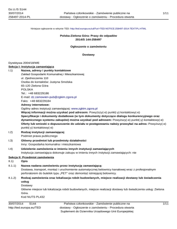 Dz.U./S S144 30/07/2014 258497-2014-PL Państwa członkowskie - Zamówienie publiczne na dostawy - Ogłoszenie o zamówieniu - Procedura otwarta 1/11 Niniejsze ogłoszenie w witrynie TED: http://ted.europa.eu/udl?uri=TED:NOTICE:258497-2014:TEXT:PL:HTML Polska-Zielona Góra: Prasy do odpadów 2014/S 144-258497 Ogłoszenie o zamówieniu Dostawy Dyrektywa 2004/18/WE Sekcja I: Instytucja zamawiająca I.1) Nazwa, adresy i punkty kontaktowe Zakład Gospodarki Komunalnej i Mieszkaniowej ul. Zjednoczenia 110 Osoba do kontaktów: Justyna Smolska 65-120 Zielona Góra POLSKA Tel.: +48 683229186 E-mail: [email protected] Faks: +48 683229184 Adresy internetowe: Ogólny adres instytucji zamawiającej: www.zgkim.zgora.pl Więcej informacji można uzyskać pod adresem: Powyższy(-e) punkt(-y) kontaktowy(-e) Specyfikacje i dokumenty dodatkowe (w tym dokumenty dotyczące dialogu konkurencyjnego oraz dynamicznego systemu zakupów) można uzyskać pod adresem: Powyższy(-e) punkt(-y) kontaktowy(-e) Oferty lub wnioski o dopuszczenie do udziału w postępowaniu należy przesyłać na adres: Powyższy(-e) punkt(-y) kontaktowy(-e) I.2) Rodzaj instytucji zamawiającej Podmiot prawa publicznego I.3) Główny przedmiot lub przedmioty działalności Inny: Gospodarka komunalna i mieszkaniowa I.4) Udzielenie zamówienia w imieniu innych instytucji zamawiających Instytucja zamawiająca dokonuje zakupu w imieniu innych instytucji zamawiających: nie Sekcja II: Przedmiot zamówienia II.1) Opis II.1.1) Nazwa nadana zamówieniu przez instytucję zamawiającą: Dostawa, transport, montaż i uruchomienie automatycznej belownicy kanałowej wraz z profesjonalnym perforatorem do butelek typu „PET” oraz demontaż istniejącej belownicy. II.1.2) Rodzaj zamówienia oraz lokalizacja robót budowlanych, miejsce realizacji dostawy lub świadczenia usług Dostawy Główne miejsce lub lokalizacja robót budowlanych, miejsce realizacji dostawy lub świadczenia usług: Zielona Góra. Kod NUTS PL432 30/07/2014 S144 http://ted.europa.eu/TED Państwa członkowskie - Zamówienie publiczne na dostawy - Ogłoszenie o zamówieniu - Procedura otwarta Suplement do Dziennika Urzędowego Unii Europejskiej 1/11 Dz.U./S S144 30/07/2014 258497-2014-PL Państwa członkowskie - Zamówienie publiczne na dostawy - Ogłoszenie o zamówieniu - Procedura otwarta 2/11 II.1.3) Informacje na temat zamówienia publicznego, umowy ramowej lub dynamicznego systemu zakupów (DSZ) Ogłoszenie dotyczy zamówienia publicznego II.1.4) Informacje na temat umowy ramowej II.1.5) Krótki opis zamówienia lub zakupu Przedmiotem zamówienia jest dostawa automatycznej belownicy kanałowej wraz z profesjonalnym perforatorem do butelek typu „PET” – dostawa wraz z transportem, montażem i uruchomieniem oraz demontaż istniejącej belownicy kanałowej i transport w miejsce wskazane przez Zamawiającego – na terenie Działu Zagospodarowania Odpadów ZGKiM w Zielonej Górze. W ramach zamówienia Dostawca przeszkoli wyznaczonych pracowników Zamawiającego w ilości minimum 6 osób w zakresie obsługi, konserwacji i eksploatacji urządzenia.Określenie parametrów urządzenia: 1. fabrycznie nowa (rok produkcji 2014 r.) prasa do belowania makulatury, twardych i miękkich tworzyw sztucznych, balastu po sortowni odpadów - wyposażona w profesjonalny perforator do butelek typu „PET”, 2. kolor belownicy: RAL 6018, 3. moc min. 45 kW, 4. siła prasowania min. 800 kN, 5. nacisk jednostkowy: min. 97,0 N/cm2, 6. przekrój leja zasypowego: min. 1400 x 1000 mm - dostosowany do istniejącej 7. instalacji zasypowej – linia „HORSTMANN”, 8. waga min. 18 ton, 9. maksymalna długość: do 11000 mm, 10. maksymalna wysokość: do 3900 mm, 11. wymiar od podłoża do dolnego tragarza min. 600 mm, 12. wymiar beli (B x H): 1100 x 750 mm, 13. minimalny ciężar beli butelek z tworzywa PET: 300 kg, 14. regulacja kanału: 3 – stronna, automatyczna, 15. wydajność teoretyczna min. 226 m3 / godz. 16. klimatyzacja szafy sterowniczej, 17. układ chłodzenia oleju hydraulicznego, 18. układ podgrzewania oleju hydraulicznego, 19. ilość oleju hydraulicznego: max. 1000 litrów wraz z pierwszym wyposażeniem w olej, 20. jeden siłownik hydrauliczny, 21. tłok prasujący musi prasować różnorodne typy materiałów np. butelki PET, taśmy bandujące, twarde tworzywa sztuczne, gąbki, skrawki tkanin, skór, balast po sortowni, paliwo alternatywne, odpady komunalne itp. Tłok musi być zabezpieczony mechanicznie przed przedostawaniem się zgniatanego materiału w szczeliny lanc na tłoku, 22. brak klapy wstępnego zgniotu w komorze zasypowej, 23. wyświetlacz długości beli, 24. klawiszowy panel sterowniczy, 25. zabezpieczenie mechaniczne przed cofaniem się sprasowanego materiału do 26. komory zasypowej, 27. sterowanie biegu szybkiego i roboczego oraz automatyczne dopasowanie szybkości w zależności od wymaganego nacisku prasowania, 28. noże tnące na tłoku prasującym oraz na kadłubie, 29. boki kanału tłoka prasującego zbudowane z odpornej na ścieranie blachy stalowej 30/07/2014 S144 http://ted.europa.eu/TED Państwa członkowskie - Zamówienie publiczne na dostawy - Ogłoszenie o zamówieniu - Procedura otwarta Suplement do Dziennika Urzędowego Unii Europejskiej 2/11 Dz.U./S S144 30/07/2014 258497-2014-PL Państwa członkowskie - Zamówienie publiczne na dostawy - Ogłoszenie o zamówieniu - Procedura otwarta 3/11 Hardox 400, 30. dno z odpornej na ścieranie blachy stalowej Hardox 400 o grubości min. 15 mm. Blacha dna komory złożona z segmentów, przykręcana śrubami ułatwiające jego wymianę, 31. instalacja elektryczna w belownicy winna być prowadzona w rurkach stalowych i zabezpieczona przed gryzoniami, 32. urządzenie powinno być wyposażone w wewnętrzną instalację ochrony przeciwprzepięciowej, 33. trójstronna w pełni automatyczna regulacja kanału prasy z regulacją zależną od nacisku prasowania, 34. automatyczne wiązanie drutem, pięciokrotne pionowe z me
