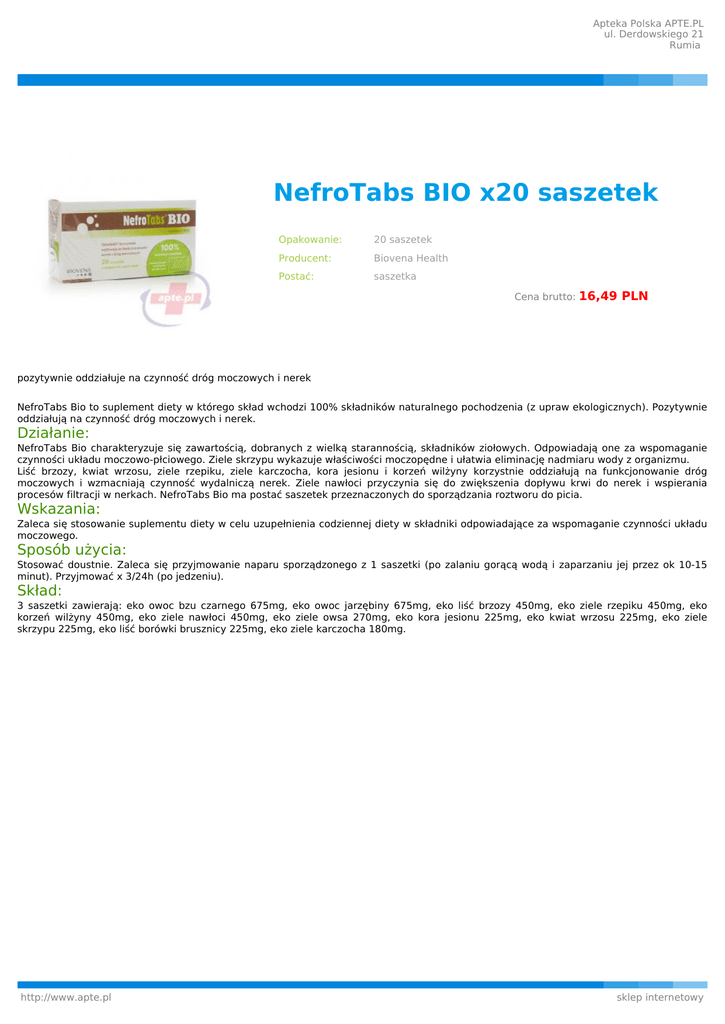 Apteka Polska APTE.PL ul. Derdowskiego 21 Rumia NefroTabs BIO x20 saszetek Opakowanie: 20 saszetek Producent: Biovena Health Postać: saszetka Cena brutto: 16,49 PLN pozytywnie oddziałuje na czynność dróg moczowych i nerek NefroTabs Bio to suplement diety w którego skład wchodzi 100% składników naturalnego pochodzenia (z upraw ekologicznych). Pozytywnie oddziałują na czynność dróg moczowych i nerek. Działanie: NefroTabs Bio charakteryzuje się zawartością, dobranych z wielką starannością, składników ziołowych. Odpowiadają one za wspomaganie czynności układu moczowo-płciowego. Ziele skrzypu wykazuje właściwości moczopędne i ułatwia eliminację nadmiaru wody z organizmu. Liść brzozy, kwiat wrzosu, ziele rzepiku, ziele karczocha, kora jesionu i korzeń wilżyny korzystnie oddziałują na funkcjonowanie dróg moczowych i wzmacniają czynność wydalniczą nerek. Ziele nawłoci przyczynia się do zwiększenia dopływu krwi do nerek i wspierania procesów filtracji w nerkach. NefroTabs Bio ma postać saszetek przeznaczonych do sporządzania roztworu do picia. Wskazania: Zaleca się stosowanie suplementu diety w celu uzupełnienia codziennej diety w składniki odpowiadające za wspomaganie czynności układu moczowego. Sposób użycia: Stosować doustnie. Zaleca się przyjmowanie naparu sporządzonego z 1 saszetki (po zalaniu gorącą wodą i zaparzaniu jej przez ok 10-15 minut). Przyjmować x 3/24h (po jedzeniu). Skład: 3 saszetki zawierają: eko owoc bzu czarnego 675mg, eko owoc jarzębiny 675mg, eko liść brzozy 450mg, eko ziele rzepiku 450mg, eko korzeń wilżyny 450mg, eko ziele nawłoci 450mg, eko ziele owsa 270mg, eko kora jesionu 225mg, eko kwiat wrzosu 225mg, eko ziele skrzypu 225mg, eko liść borówki brusznicy 225mg, eko ziele karczocha 180mg. http://www.apte.pl sklep internetowy