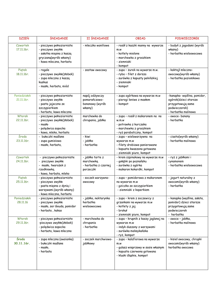 DZIEŃ ŚNIADANIE II ŚNIADANIE Czwartek 17.11.16r. - pieczywo pełnoziarniste - pieczywo zwykłe - sałatka mięsna z kaszą gryczaną(wyrób własny) - kawa mleczna, herbata - mleczko waniliowe Piątek 18.11.16r. - rogale - pieczywo zwykłe(żłobek) - zupa mleczna z kaszą kuskus - masło, herbata, miód - zestaw owocowy Poniedziałek 21.11.16r. - pieczywo pełnoziarniste - pieczywo zwykłe - pasta jajeczna ze szczypiorkiem - herbata, kawa mleczna - pieczywo pełnoziarniste - pieczywo zwykłe(żłobek) - masło - polędwica sopocka - kawa, mleko, herbata - bułeczki maślane - zupa gumisiowa - masło, herbata, - pieczywo pełnoziarniste - pieczywo zwykłe - masło, twarożek z rzodkiewką - kawa, herbata, mleko - pieczywo pełnoziarniste - pieczywo zwykłe - pasta mięsna z dynią i warzywami,(wyrób własny) - kawa mleczna, herbata - pieczywo pełnoziarniste - pieczywo zwykłe - masło, ser Gouda, pomidor - herbata , kakao - jabłko tarte z marchewką - herbatka z czarnej porzeczki Wtorek 29.11.16r. - pieczywo pełnoziarniste -pieczywo zwykłe(żłobek) - polędwica sopocka - herbata, kawa mleczna - marchewka do chrupania - herbatka Środa 30.11.16r. - zupa mleczna (owsianka) - bułeczki maślane - masło, - herbata - soczek marchwiowojabłkowy Wtorek 22.11.16r. Środa 23.11.16r. Czwartek 24.11.16r. Piątek 25.11.16r. Poniedziałek 28.11.16 OBIAD PODWIECZOREK - rosół z kaszki manny na wywarze m.w - kotlety mielone - marchewka z groszkiem - ziemniaki - kompot - zupa – żurek na wywarze m.w. - ryba – filet z dorsza - surówka z kapusty pekińskiej - ziemniaki - kompot - budyń z jagodami (wyrób własny) - herbatka wieloowocowa napój odżywczy pomarańczowobananowy (wyrób własny) - zupa ogórkowa na wywarze m.w - pierogi leniwe z masłem - kompot marchewka do chrupania, jabłka - zupa – rosół z makaronem na na w.m.w - potrawka z kurczaka - marchewka z groszkiem - ryż paraboliczny, kompot - zupa – wielowarzywna na wywarze m.w - filety drobiowe panierowane - kapusta kwaszona gotowana - ziemniaki piure, kompot - krem szpinakowy na wywarze m.w - gołąbki po poznańsku - surówka z ogórka - makaron kokardki, kompot -kanapka- wędlina, pomidor, ogórek(dzieci starsze przygotowują same podwieczorek) - herbatka malinowa - owoce- banany - herbatka - kiwi - jabłko - herbatka - koktajl mlecznoowocowy(wyrób własny) - herbatka poziomkowa - ciasto(wyrób własny) - herbatka malinowa - ryż z jabłkami i cynamonem - herbatka wieloowocowa - soczek warzywnoowocowy - zupa – pomidorowa z makaronem na wywarze m.w - gziczka ze szczypiorkiem - ziemniaki z koperkiem - jogurt naturalny z owocami(wyrób własny) - herbatka - jabłko, nektarynka herbatka wieloowocowa - zupa – krem z soczewicy z grzankami na wywarze m.w - kotlety z jaj - brokuł - ziemniaki piure, kompot - zupa – krupnik z kaszy jaglanej na wywarze m.w - indyk duszony z warzywami - surówka meksykańska - ryż, kompot - zupa – kalafiorowa na wywarze m.w - gulasz wieprzowy w sosie własnym - kapusta czerwona gotowana - kluski śląskie, kompot - kanapka (wędlina, sałata, pomidor) dzieci starsze przygotowują same podwieczorek - herbatka - owoce – jabłka, - herbatka malinowa - kisiel owocowy, chrupki owocami(wyrób własny) herbatka owocowa