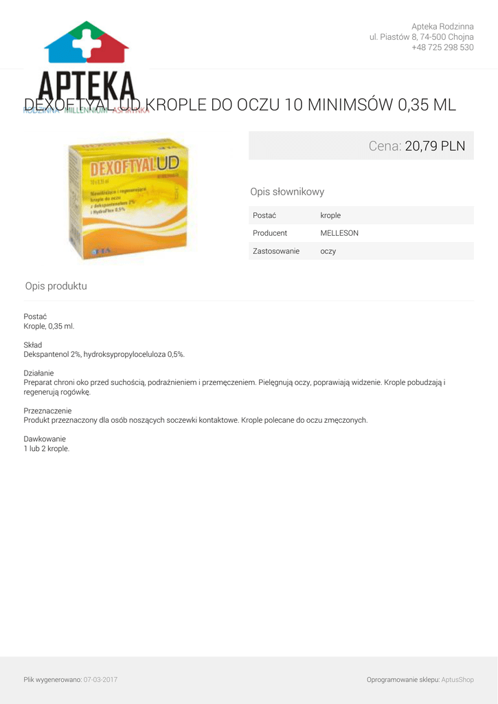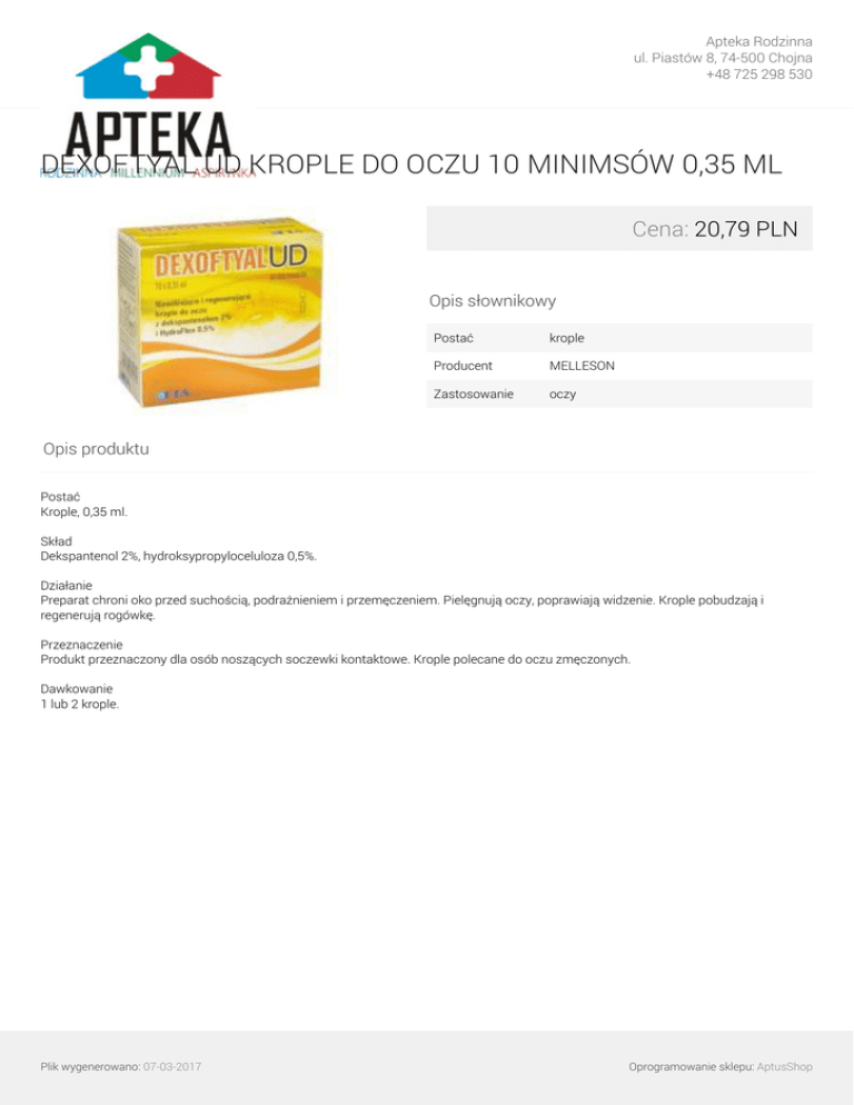 Apteka Rodzinna ul. Piastów 8, 74-500 Chojna +48 725 298 530 DEXOFTYAL UD KROPLE DO OCZU 10 MINIMSÓW 0,35 ML Cena: 20,79 PLN Opis słownikowy Postać krople Producent MELLESON Zastosowanie oczy Opis produktu Postać Krople, 0,35 ml. Skład Dekspantenol 2%, hydroksypropyloceluloza 0,5%. Działanie Preparat chroni oko przed suchością, podrażnieniem i przemęczeniem. Pielęgnują oczy, poprawiają widzenie. Krople pobudzają i regenerują rogówkę. Przeznaczenie Produkt przeznaczony dla osób noszących soczewki kontaktowe. Krople polecane do oczu zmęczonych. Dawkowanie 1 lub 2 krople. Plik wygenerowano: 07-03-2017 Powered by TCPDF (www.tcpdf.org) Oprogramowanie sklepu: AptusShop