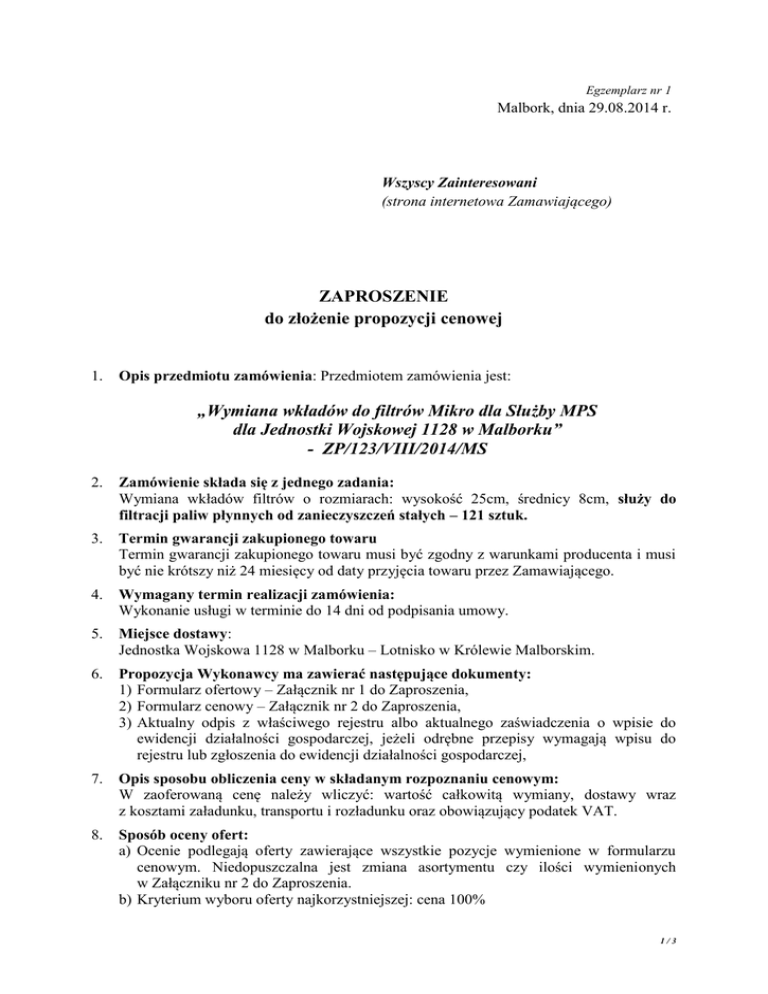 Egzemplarz nr 1 Malbork, dnia 29.08.2014 r. Wszyscy Zainteresowani (strona internetowa Zamawiającego) ZAPROSZENIE do złożenie propozycji cenowej 1. Opis przedmiotu zamówienia: Przedmiotem zamówienia jest: „Wymiana wkładów do filtrów Mikro dla Służby MPS dla Jednostki Wojskowej 1128 w Malborku” - ZP/123/VIII/2014/MS 2. Zamówienie składa się z jednego zadania: Wymiana wkładów filtrów o rozmiarach: wysokość 25cm, średnicy 8cm, służy do filtracji paliw płynnych od zanieczyszczeń stałych – 121 sztuk. 3. Termin gwarancji zakupionego towaru Termin gwarancji zakupionego towaru musi być zgodny z warunkami producenta i musi być nie krótszy niż 24 miesięcy od daty przyjęcia towaru przez Zamawiającego. 4. Wymagany termin realizacji zamówienia: Wykonanie usługi w terminie do 14 dni od podpisania umowy. 5. Miejsce dostawy: Jednostka Wojskowa 1128 w Malborku – Lotnisko w Królewie Malborskim. 6. Propozycja Wykonawcy ma zawierać następujące dokumenty: 1) Formularz ofertowy – Załącznik nr 1 do Zaproszenia, 2) Formularz cenowy – Załącznik nr 2 do Zaproszenia, 3) Aktualny odpis z właściwego rejestru albo aktualnego zaświadczenia o wpisie do ewidencji działalności gospodarczej, jeżeli odrębne przepisy wymagają wpisu do rejestru lub zgłoszenia do ewidencji działalności gospodarczej, 7. Opis sposobu obliczenia ceny w składanym rozpoznaniu cenowym: W zaoferowaną cenę należy wliczyć: wartość całkowitą wymiany, dostawy wraz z kosztami załadunku, transportu i rozładunku oraz obowiązujący podatek VAT. 8. Sposób oceny ofert: a) Ocenie podlegają oferty zawierające wszystkie pozycje wymienione w formularzu cenowym. Niedopuszczalna jest zmiana asortymentu czy ilości wymienionych w Załączniku nr 2 do Zaproszenia. b) Kryterium wyboru oferty najkorzystniejszej: cena 100% 1/3 stęp do dokumentu: Sekcja Zamówień Publicznych c) Sposób porównania ofert: oferty zostaną przeliczone zgodnie ze wzorem: cena oferty najniższej/cena oferty badanej x 100 x 100% Oferta najkorzystniejsza to ta, która uzyska największą ilość punktów w kryterium cena. 9. Istotne postanowienia które zostaną wprowadzone do treści umowy: a) Wykonawca zapłaci Zamawiającemu kary umowne za zawinione niewykonanie lub nienależyte wykonanie umowy w następujących przypadkach i wysokości: 10% wartości brutto umowy, gdy Zamawiający odstąpi od umowy z powodu okoliczności, za które odpowiada Wykonawca, 10% wartości brutto umowy, gdy Wykonawca nie wykona zamówienia w całości, bądź nawet w jakiejś jego części. b) warunki płatności: faktury będą płatne 30 dni od dnia dostarczenia przez Wykonawcę faktury do Zamawiającego. 10. Opis sposobu przygotowania oferty cenowej: Ofertę można złożyć w zamkniętej, nieprzezroczystej kopercie Zamawiającego, ponadto powinna posiadać następujące oznaczenie: Nazwa Wykonawcy Adres w siedzibie JEDNOSTKA WOJSKOWA 1128 Kancelaria Jawna ul. 17 Marca 20 82 – 200 Malbork Oferta na zapytanie cenowe pn.: „Wymiana wkładów do filtrów Mikro dla Służby MPS dla Jednostki Wojskowej 1128 w Malborku” Sygnatura sprawy: ZP/123/VIII/2014/MS Nie otwierać przed dniem 08.09.2014 godz. 14.00 Ofertę można również złożyć z wypełnionym i podpisanym (wraz z pieczątką) załącznikiem wybranym poniżej sposobem: osobiście, bądź drogą pocztową: JEDNOSTKA WOJSKOWA 1128 Kancelaria Jawna Budynek nr 1, pokój nr 118 ul. 17 Marca 20 82 – 200 Malbork; w formie elektronicznej na adres: [email protected]; w formie faksu na numer: 55 620 67 13. 11. Termin składania ofert upływa dnia 08.09.2014 r. o godz. 13.30. Oferta powinna zostać napisana w języku polskim, trwałą i czytelną techniką. Oferta powinna obejmować całość zamówienia określonego przez Zamawiającego. 2/3 stęp do dokumentu: Sekcja Zamówień Publicznych 12. Miejsce i termin otwarcia propozycji cenowej: Otwarcie ofert nastąpi dnia 08.09.2014 o godz. 14.00 w siedzibie Zamawiającego mieszczącej się w budynku nr 12, sala otwarć. 13. Osoby uprawnione do kontaktów z Wykonawcami Sprawy dot. przedmiotu zamówienia i warunków realizacji – Służba MPS sierż. Roman SUROWIEC Numer telefonu: 55 620 62 67, 55 620 71 86 Sprawy proceduralne – Sekcja Zamówień Publicznych Mariola SIKORSKA Numer telefonu: 55 620 67 89 Numer faksu: 55 620 67 13 Adres poczty elektronicznej: [email protected] Załączniki: 1. Formularz ofertowy; 2. Formularz cenowy; 3. Projekt umowy. DOWÓDCA Sprawdził: J. Narloch Wykonano w 1 egz.: Egz. nr 1 – ad acta Wykonał: M. Sikorska (tel. 55 620 67 89) Dostęp do dokumentu: Sekcja Zamówień Publicznych stęp do dokumentu: Sekcja Zamówień Publicznych 3/3
