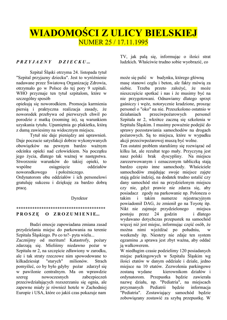 WIADOMOŚCI Z ULICY BIELSKIEJ NUMER 25 / 17.11.1995 PRZYJAZNY D Z I E C K U ... Szpital Śląski otrzyma 24. listopada tytuł "Szpital przyjazny dziecku". Jest to wyróżnienie nadawane przez Światową Organizację Zdrowia, otrzymało go w Polsce do tej pory 9 szpitali. WHO przyznaje ten tytuł szpitalom, które w szczególny sposób opiekują się noworodkiem. Promocja karmienia piersią i praktyczna realizacja zasady, że noworodek przebywa od pierwszych chwil po porodzie z matką (rooming in), są warunkiem uzyskania tytułu. Upamiętnia go plakietka, którą z dumą zawiesimy na widocznym miejscu. Tytuł nie daje pieniędzy ani uprawnień. Daje poczucie satysfakcji dobrze wykonywanych obowiązków na pewnym bardzo ważnym odcinku opieki nad człowiekiem. Na początku jego życia, dlatego tak ważnej w następstwa. Stworzenie warunków do takiej opieki, to wspólne osiągnięcie oddziałów noworodkowego i położniczego. Ordynatorom obu oddziałów i ich personelowi gratuluję sukcesu i dziękuję za bardzo dobrą pracę. Dyrektor *************************************** P R O S Z Ę O Z R O Z U M I E N I E... Budzi emocje zapowiadana zmiana zasad przydzielania miejsc do parkowania na terenie Szpitala Śląskiego. Po co to?- pyta wielu... Zacznijmy od meritum! Katastrofy, pożary zdarzają się. Mieliśmy niedawno pożar w Szpitalu nr 2, na szczęście zdławiony w zarodku, ale i tak straty rzeczowe nim spowodowane to kilkadziesiąt "starych" milionów. Strach pomyśleć, co by było gdyby pożar zdarzył się w pawilonie centralnym. Ma on wprawdzie szereg nowoczesnych zabezpieczeń przeciwdziałających rozszerzaniu się ognia, ale zapewne miały je również hotele w Zachodniej Europie i USA, które co jakiś czas pokazuje nam TV, jak palą się, informując o ilości strat ludzkich. Właściwie trudno sobie wyobrazić, co może się palić w budynku, którego główną masę stanowi cegła i beton, ale fakty mówią za siebie. Trzeba przeto założyć, że może nieszczęście spotkać i nas i że musimy być na nie przygotowani. Odnawiamy dlatego sprzęt gaśniczy i węże, notorycznie kradzione, prosząc personel o "oko" na nie. Przeszkolono ostatnio w działaniach przeciwpożarowych personel Szpitala nr 2, wkrótce zaczną się szkolenia w Szpitalu Śląskim. I musimy poważnie podejść do sprawy pozostawiania samochodów na drogach pożarowych. Są to miejsca, które w wypadku akcji przeciwpożarowej muszą być wolne. Ten ostatni problem staraliśmy się rozwiązać od kilku lat, ale rezultat tego mały. Przyczyną jest nasz polski brak dyscypliny. Na miejscu zarezerwowanym i oznaczonym tabliczką stają bardzo często inne samochody. Właściciele samochodów znajdując swoje miejsce zajęte stają gdzie indziej, na dodatek trudno ustalić czy dany samochód stoi na przydzielonym miejscu czy nie, gdyż prawie nie zdarza się, aby posiadacz zgody na parkowanie np. Poloneza o takim i takim numerze rejestracyjnym powiadomił DAG, że zmienił go na Toyotę itp. Nikt nie zajmuje przydzielonego miejsca postoju przez 24 godzin i dlatego wydawano dotychczas przepustek na samochód więcej niż jest miejsc, informując część osób, że można nimi wjeżdżać po południu, w weekendy itp. Niestety nie zdaje ten system egzaminu ,a sprawa jest zbyt ważna, aby oddać ją walkowerem. W niedługim czasie podzielimy 120 posiadanych miejsc parkingowych w Szpitalu Śląskim wg ilości etatów w danym oddziale i dziale, jedno miejsce na 10 etatów. Zezwolenia parkingowe zostaną wydane kierownikom działów i ordynatorom. Przepustka będzie zawierała nazwę działu, np. "Pediatria", na miejscach przyznanych Pediatrii będzie informacja "Pediatria". Zostawiający samochód będzie zobowiązany zostawić za szybą przepustkę. W sytuacji, gdy posiadający przepustkę zastanie swe miejsce zajęte, powinien to zaraz zgłosić do DAG-u. Zostanie mu doraźnie wyznaczone na ten dzień miejsce rezerwowe, jednocześnie podejmie się działania wobec kierowcy, który źle zaparkował. Będzie to propozycja uiszczenia w kasie ZOZ-u kwoty 20 złotych na konto dobrowolnych świadczeń. Osobom nie godzącym się na dokonanie wpłaty będą udzielane kary regulaminowe, osobom nie będącym pracownikami ZOZ-u zostanie postawiona alternatywa wpłaty lub doniesienia do Kolegium. Niestety, ani Policja, ani Straż Pożarna, gotowe karać dyrektora za niezapewnienie przejezdności dróg pożarowych, nie chcą pełnić swych funkcji wobec użytkowników pojazdów nieprawidłowo parkujących tłumacząc, że jest to nie ich teren. System, który wprowadzimy, pozwoli na lepsze wykorzystanie miejsc w godzinach popołudniowych i nocnych oraz w trakcie weekendów. Kartę będzie można sobie przekazywać w danym dziale. Wiem, że ilość miejsc parkingowych jest niewystarczająca, że ich podział w oddziałach nie będzie łatwy. Rzeczą przełożonego danego zespołu będzie znaleźć rozwiązanie najwłaściwsze. Być może będzie nim dzielenie się dniami lub miesiącami. Jest pewnym pocieszeniem, że parking naprzeciw szpitala jest o godz. 7oo prawie pusty. Zwróciłem się do Zakładu Gospodarki Komunalnej z prośbą , aby przeznaczono go wyłącznie dla pracowników Szpitala Śląskiego stawiając odpowiednią informację, ale nie została ona uwzględniona . I jeszcze jedno. Oddaliśmy ostatnio do użytku parking przy wjeździe do szpitala od ul. Chrobrego. Wybudowany ze środków Fundacji będzie parkingiem płatnym. Zapowiadałem o tym w prasie, kiedy zarzucano nam, że pieniądze, które mogłyby być spożytkowane na sprzęt, wydaje się na parking. Z czasem wydatki poniesione na jego utworzenie zwrócą się i zostaną wykorzystane na zakup sprzętu, jednocześnie ulegnie rozładowaniu problem parkowania samochodów osób odwiedzających. Z tych względów nie może to być bezpłatny parking dla pracowników. Kończąc, proszę Państwa, jak w tytule tego listu. Dyrektor DIAGNOSTYKA ULTRASONOGRAFI