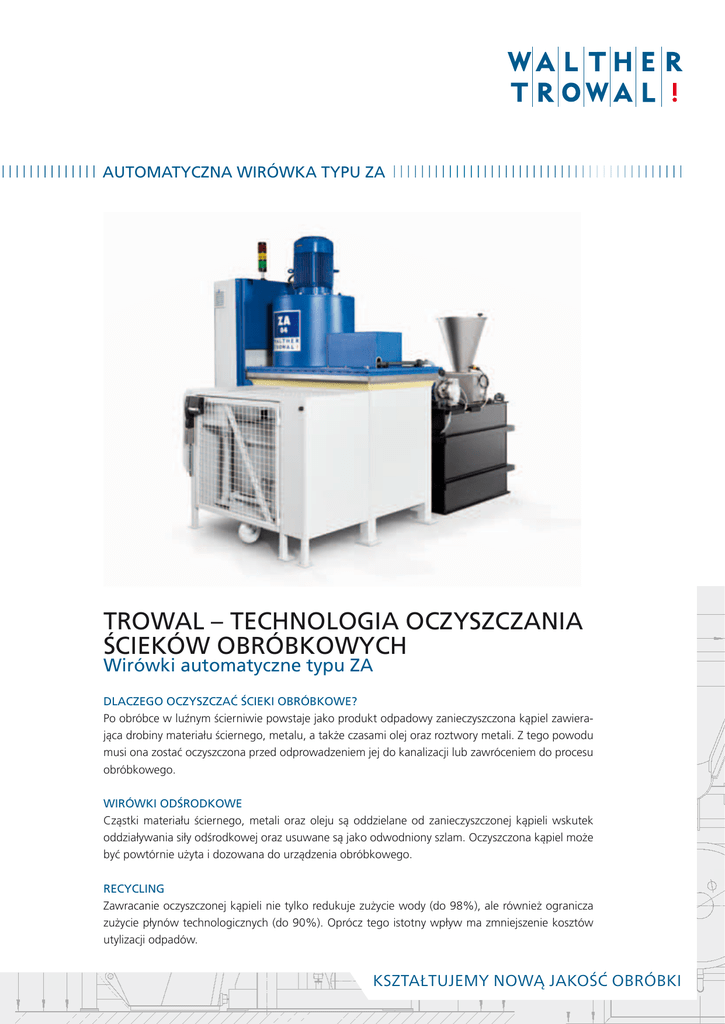 AUTOMATYCZNA WIRÓWKA TYPU ZA TROWAL – TECHNOLOGIA OCZYSZCZANIA ŚCIEKÓW OBRÓBKOWYCH Wirówki automatyczne typu ZA DLACZEGO OCZYSZCZAĆ ŚCIEKI OBRÓBKOWE? Po obróbce w luźnym ścierniwie powstaje jako produkt odpadowy zanieczyszczona kąpiel zawierająca drobiny materiału ściernego, metalu, a także czasami olej oraz roztwory metali. Z tego powodu musi ona zostać oczyszczona przed odprowadzeniem jej do kanalizacji lub zawróceniem do procesu obróbkowego. WIRÓWKI ODŚRODKOWE Cząstki materiału ściernego, metali oraz oleju są oddzielane od zanieczyszczonej kąpieli wskutek oddziaływania siły odśrodkowej oraz usuwane są jako odwodniony szlam. Oczyszczona kąpiel może być powtórnie użyta i dozowana do urządzenia obróbkowego. RECYCLING Zawracanie oczyszczonej kąpieli nie tylko redukuje zużycie wody (do 98%), ale również ogranicza zużycie płynów technologicznych (do 90%). Oprócz tego istotny wpływ ma zmniejszenie kosztów utylizacji odpadów. KSZTAŁTUJEMY NOWĄ JAKOŚĆ OBRÓBKI Wydajność (l/godz.) ZA 04 ZA 06 1.000 2.000 14 28 1.920 2.417 Pojemność kosza na szlam (l) Współczynnik siły odśrodkowej (g) Zbiornik brudnej kąpieli (l) 800 1.500 Zbiornik czystej kąpieli (l) 400 1.000 bezpośredni przy pomocy paska klinowego 1.660 x 2.800 x 2.120 2.250 x 3.000 x 2.200 Rodzaj napędu Wymiary (D x Sz x W) (mm) Moc przyłączeniowa (kW) 4,0 7,0 RECYCLING W WIRÓWCE AUTOMATYCZNEJ Woda* Płyn obróbkowy* Zbiornik czystej kąpieli Części surowe Wirówka Trowalizacja OCZYSZCZANIE SIŁĄ ODŚRODKOWĄ W technologii oczyszczania odśrodkowego cząstki stałe są usuwane z zanieczyszczonej kąpieli wskutek działania siły odśrodkowej, która jest 2417 razy większa niż przyciąganie ziemskie. Olej i mniejsze zanieczyszczenia <1 µm są usuwane z układu poprzez dodanie flokulantu. Płyn obróbkowy użyty w procesie obróbkowym pozostaje w znacznym stopniu w oczyszczonej kąpieli i jest powtórnie używany. Części obrobione Szlam Zbiornik brudnej kąpieli AUTOMATYCZNA WIRÓWKA TYPU ZA W pełni automatyczna, sterowana przy pomocy sterownika PLC wirówka typu ZA pozwala na oczyszczanie do 2.000 l zanieczyszczonej kąpieli na godzinę. W ustawionych interwałach czasowych szlam zbierający się na ściankach wirującego bębna jest automatycznie usuwany wskutek zastosowania specjalnego noża skrawającego i opada do pojemnika. Modułowa konstrukcja wirówki typu ZA pozwala na tworzenie wielu konfiguracji urządzenia i dopasowania sprzętu do specyficznych wymagań klienta. Opcje obejmują różne zbiorniki na kąpiele brudną i oczyszczoną, system chłodzenia wody, dodatkowe pompy, różne systemy dozowania, itp. SCHEMAT FUNKCJONOWANIA WIRÓWKI AUTOMATYCZNEJ Kąpiel oczyszczona Dalsze procesy Flokulant** Szlam * ze względu na proces parowania, woda i płyn obróbkowy muszą być stale uzupełniane. **flokulant może być dozowany do zanieczyszczonej kąpieli w celu tworzenia większych, łatwiejszych do usunięcia frakcji zemulgowanego oleju i smaru. Kąpiel zanieczyszczona Kąpiel oczyszczona Woda* Nóż skrawający Kąpiel zanieczyszczona Płyn obróbkowy* Zbiornik czystej kąpieli Części surowe Wirówka Trowalizacja Części Szlam Zastrzegamy sobie wprowadzanie zmian technicznych uwarunkowanych postępem technicznym i obrobione technologicznym! 04 / 15 www.promise-marketing.de Zbiornik brudnej kąpieli Walther Trowal GmbH & Co. KG Rheinische Straße 35-37 | D-42781 Haan Tel. +49(0)2129-571-0 | Fax +49(0)2129-571-225 [email protected] | www.walther-trowal.com