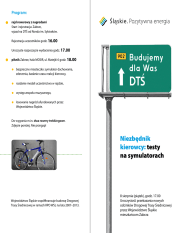 Program: rajd rowerowy z nagrodami Start i rejestracja: Zabrze, wjazd na DTŚ od Ronda im. Sybiraków. Rejestracja uczestników godz. 16.00 Uroczyste rozpoczęcie wydarzenia godz. 17.00 piknik Zabrze, hala MOSIR, ul. Matejki 6 godz. 18.00 • • • • bezpieczne miasteczko: symulator dachowania, zderzenia, badanie czasu reakcji kierowcy, rozdanie medali uczestnictwa w rajdzie, występ zespołu muzycznego, losowanie nagród ufundowanych przez Województwo Śląskie. Do wygrania m.in. dwa rowery trekkingowe. Zdjęcie poniżej. Nie przegap! Budujemy dla Was Budujemy DTŚ dla Was Budujemy DTŚ dla Was DTŚ Niezbędnik kierowcy: testy na symulatorach Województwo Śląskie współfinansujebudowę Drogowej Trasy Średnicowej w ramach RPO WSL na lata 2007–2013. 8 sierpnia (piątek), godz. 17.00 Uroczystość przekazania nowych odcinków Drogowej Trasy Średnicowej przez Województwo Śląskie mieszkańcom Zabrza Otwarcie nowych odcinków DTŚ to okazja, żeby porozmawiać o bezpieczeństwie na drodze. Partnerem wydarzenia jest Wojewódzki Ośrodek Ruchu Drogowego w Katowicach. Na stoiskuWORD czeka na Ciebie szereg atrakcji. Zapraszamy do darmowego wypróbowania symulatorów związanych z bezpieczną jazdą. Uwaga, sprawdź czy spełniasz wymogi dla każdego z urządzeń. Alkogogle Myślisz, że jedno piwo przed trasą nie zaszkodzi? Przymierz okulary obrazujące reakcje człowieka po spożyciu alkoholu, takie jak zaburzona koordynacja wzrokowo ruchowa czy zaburzona ocena odległości. I co? Jak to widzisz? Bez ograniczeń. Symulator dachowania Po takim doświadczeniu już nigdy nie zapomnisz zapiąć pasów. Przeżyj dachowanie samochodu w zwolnionym tempie i poczuj, jak zachowuje się Twoje ciało, gdy działają na nie tak potężne siły. A teraz wyobraź sobie szybkość, z jaką wszystko może się dziać naprawdę. Otwiera oczy… Uwaga: od 18 lat i 150 cm wzrostu! Symulator zderzeń Test czasu reakcji Zmierz swój czas reakcji na profesjonalnym sprzęcie do badań psychotechnicznych. Co to znaczy? Wyobraź sobie, że jedziesz 50 km/h i nagle spostrzegasz pieszego na drodze. Zanim wciśniesz hamulec, upłynie przeciętnie 0,7 sekundy, a Ty w tym czasie przejedziesz ok. 14 metrów. Co się dzieje, gdy prędkość jest większa, a czas reakcji ten sam? Sam zobacz. Bez ograniczeń. Jeśli masz odwagę, poczuj siłę, która działa na człowieka podczas zderzenia z prędkością 7 km/h.I pamiętaj, odczuwalna siła zderzenia w samochodzie średniej klasy jest dwa razy większa. Uwaga: od 18 lat! Symulator jazdy samochodem osobowym Poczuj się jak rasowy kierowca i zobacz z jakimi niebezpiecznymi sytuacjami możesz się spotkać w prawdziwym ruchu drogowym. Bez ograniczeń. Polecany szczególnie najmłodszym.