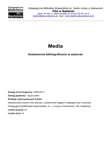 Pedagogiczna Biblioteka Wojewódzka im. Józefa Lompy w Katowicach Filia w Będzinie Będzin, 42-500, ul. Małachowskiego 29, tel./fax 032 267 49 34 [email protected], http//: www.bedzin.pbw.katowice.pl Media Zestawienie bibliograficzne w wyborze Zasięg chronologiczny: 2000-2013 Zasięg językowy: język polski Rodzaje wykorzystanych źródeł: Wydawnictwa zwarte oraz artykuły z wydawnictw ciągłych znajdujące się w zbiorach Pedagogicznej Biblioteki Wojewódzkiej im. J. Lompy w Katowicach, Filii w Będzinie Liczba pozycji: 44 Liczba stron: 6 Pedagogiczna Biblioteka Wojewódzka im. Józefa Lompy w Katowicach Filia w Będzinie Będzin, 42-500, ul. Małachowskiego 29, tel./fax 032 267 49 34 [email protected], http//: www.bedzin.pbw.katowice.pl Media 1. Aboujaoude, Elias Wirtualna osobowość naszych czasów : mroczna strona e-osobowości / Elias Aboujaoude. - Kraków : Wydawnictwo Uniwesytetu Jagiellońskiego, 2012. - 321 s. : il. ; 21 cm. - ISBN 9788323332985 2. Aftab, Parry Internet a dzieci : uzależnienia i inne niebezpieczeństwa / Parry Aftab. - Warszawa : Wydawnictwo Prószyński i S-ka, 2003. - 319, [1] s. ; 21 cm. - ISBN 83-7337-241-5 3. Aouil, Bassam (1962-). Red. Internet w psychologii, psychologia w internecie / red. nauk. Bassam Aouil, Kazimierz Czerwiński, Danuta Wosik-Kawala. - Toruń : Wydawnictwo Adam Marszałek, 2011. - 366 s. : il. ; 23 cm. - (Komunikacja Społeczna w Edukacji). - Częśc. materiały z II i III ogólnopolskiego seminarium nauk., Bydgoszcz. - Bibliogr. s. 343-366. - Streszcz. ang.przy ref. - ISBN 978-83-7611-965-6 (WAM) 4. Ben-Ze'ev, Aharon Miłość w sieci : internet i emocje / Aaron Ben-Ze'ev ; przekł. Anna Zdziemborska. Poznań : Rebis, 2005. - 335, [1] s. ; 23 cm. - Bibliogr. s. 307-317. Indeks.. - ISBN 83-7301-606-6 5. Bogost, Ian Gry informacyjne Schweizer ; Jagiellońskiego, 201-215. Indeks. 6. : dziennikarstwo epoki cyfrowej / Ian Bogost, Simon Ferrari, Bobby przekł. JoannaGilewicz. - Kraków : Wydawnictwo Uniwersytetu 2012. - [8], 223, [1] s. : il. ; 23 cm. - (Media). - Bibliogr. s. - Podręcznik akademicki. - ISBN 978-83-233-3356-2 Bogunia-Borowska, Małgorzata. Red. Dziecko w świecie mediów i konsumpcji / pod red. Małgorzaty Boguni-Borowskiej. Kraków : Wydawnictwo Uniwersytetu Jagiellońskiego, cop. 2006. - 267 s. : il. ; 21 cm. - (Film i Media Audiowizualne). - Bibliogr. przy pracach. - ISBN 83-233-2188-4.978-83-233-2188-0 7. Danowski, Bartosz ABC tworzenia stron www / Bartosz Danowski. - Wyd. 2. - Gliwice : Wydawnictwo Helion, cop. 2006. - 292 s. : il. ; 23 cm. - Indeks. - ISBN 83-246-0605-X 8. Dąbrowska, Anna (ekonomika). E-usługi a społeczeństwo informacyjne / Anna Dąbrowska, Mirosława Janoś-Kresło, Arkadiusz Wódkowski. - Warszawa : Centrum Doradztwa i Informacji Difin, 2009. - 171 s. : il. ; 23 cm. - Bibliogr. s. 164-171. - ISBN 978-83-7251-982-5 9. Ejsmont, Marek Media, wartości, wychowanie / Marek Ejsmont, Beata Kosmalska. - Kraków : Impuls, 2005. - 367 s. : il., mapa, wykr. ; 24 cm. - Bibliogr. s. 349-367. - ISBN 83-7308440-1 (Impuls).- 83-7326-277-6 (UG) Pedagogiczna Biblioteka Wojewódzka im. Józefa Lompy w Katowicach Filia w Będzinie Będzin, 42-500, ul. Małachowskiego 29, tel./fax 032 267 49 34 [email protected], http//: www.bedzin.pbw.katowice.pl 10. Gajda, Janusz (1933-). Media w edukacji / Janusz Gajda. - Kraków : "Impuls", 2002. - 218, [1] s. : il. ; 24 cm. - Bibliogr. - Rozdz. VII zawiera wybór tekstów innych aut. - Tekst częśc. tł. z ang. - ISBN 83-7308-182-8 11. Gogołek, Włodzimierz ABC o Internecie : przykłady zasobów sieciowych: prasa, banki, biznes, pieniądze, polityka / Włodzimierz Gogołek. - Goleszów : "Innowacje", 1998. - 92 s. : il. kolor. ; 24 cm. - Indeks. - ISBN 83-86425-81-4 12. Grodecka, Ewa Edukacja czytelnicza i medialna w szkole podstawowej i gimnazjum : poradnik dla nauczycieli realizujących ścieżkimiędzyprzedmiotowe / Ewa Grodecka, Hanna Sokołowska. - Lublin : "Skurs", cop. 2000. - 107 s. : il. ; 21 cm. - Bibliogr. - ISBN 83-904529-3-6 13. Grzenia, Jan Komunikacja językowa w Internecie / Jan Grzenia. - Warszawa : Wydawnictwo Naukowe PWN, 2006. - 214 s. ; 21 cm. - Bibliogr. s. 201 - 214.. - ISBN 9788301148676 14. Grzesiak, Ewa (filologia polska). Edukacja medialna : scenariusze zajęć / Ewa Grzesiak, Renata Janicka-Szyszko, Magdalena Steblecka. - Wyd. 1 w jęz. pol. - Gdańsk : Gdańskie Wydawnictwo Psychologiczne, 2005. - 73, [2] s. : rys. ; 21 cm. - (Kompetentny Nauczyciel)(Pedagogika / Gdańskie Wydawnictwo Psychologiczne). - Bibliogr. s. [75]. ISBN 83-60083-66-5 15. Huber, Florian Rodzice offline ? : jak nawiązać kontakt ze skomputeryzowanym dzieckiem? / Florian Huber, Christoph Neuschäffer ; zjęz. niem. tł. Ryszard Turczyn. - Warszawa : Wydaw. Lekarskie PZWL, cop. 2003. - 154 s. : il. ; 21 cm. - Indeks. - Tyt. oryg.: "Eltern offline? : so halten Sie Anschluss an Ihr Compuer-Kid" 2001. - ISBN 83-200-2797-7 16. Jabłoński, Włodzimierz Jerzy Komputer i Internet w pracy nauczyciela / Włodzimierz Jabłoński, Janusz Wacławiak, Stanisław Wszelak. - Toruń : Wydaw. Adam Marszałek, cop. 2003. - 210 s. : il., tab., wykr. ; 24 cm. - (Multimedialna Biblioteka Pedagogiczna). - Bibliogr. s. 210. - ISBN 83-7322-648-6 17. Jabłoński, Wojciech Kreowanie informacji : media relations / Wojciech Jabłoński. - Warszawa : Wydawnictwo Naukowe PWN, 2006. - 179, [1] s. : il. ; 24 cm. - Bibliogr. s. 172-176. Indeks. ISBN 83-01-14819-5 18. Kozinets, Robert V. Netnografia : badania etnograficzne online / Robert V. Kozinets. - Warszawa Wydawnictwo Naukowe PWN, 2012. - 295 s. : il. ; 24 cm. - ISBN 9788301171148 19. : Kron, Friedrich W. Dydaktyka mediów / Friedrich W. Kron, Alivisos Sofos. - Gdańsk : Gdańskie Wydawnictwo Psychologiczne, 2008. - 165 s. : il. ; 21 cm. - (Pedagogika GWP). - ISBN 9788360083550 Pedagogiczna Biblioteka Wojewódzka im. Józefa Lompy w Katowicach Filia w Będzinie Będzin, 42-500, ul. Małachowskiego 29, tel./fax 032 267 49 34 [email protected], h