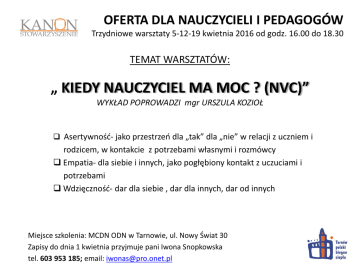 OFERTA DLA NAUCZYCIELI I PEDAGOGÓW Trzydniowe warsztaty 5-12-19 kwietnia 2016 od godz. 16.00 do 18.30 TEMAT WARSZTATÓW: „ KIEDY NAUCZYCIEL MA MOC ? (NVC)” WYKŁAD POPROWADZI mgr URSZULA KOZIOŁ Asertywność- jako przestrzeń dla „tak” dla „nie” w relacji z uczniem i rodzicem, w kontakcie z potrzebami własnymi i rozmówcy Empatia- dla siebie i innych, jako pogłębiony kontakt z uczuciami i potrzebami Wdzięczność- dar dla siebie , dar dla innych, dar od innych Miejsce szkolenia: MCDN ODN w Tarnowie, ul. Nowy Świat 30 Zapisy do dnia 1 kwietnia przyjmuje pani Iwona Snopkowska tel. 603 953 185; email: [email protected]