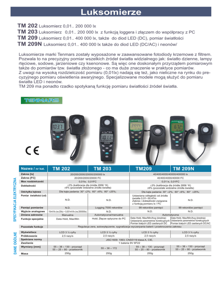 Luksomierze TM 202 Luksomierz 0,01.. 200 000 lx TM 203 Luksomierz 0,01.. 200 000 lx z funkcją loggera i złączem do współpracy z PC TM 209 Luksomierz 0,01.. 400 000 lx, także do diod LED (DC), pomiar światłości TM 209N Luksomierz 0,01.. 400 000 lx także do diod LED (DC/AC) i neonów/ Luksomierze marki Tenmars zostały wyposażone w zaawansowane fotodiody krzemowe z filtrem. Pozwala to na precyzyjny pomiar wszelkich źródeł światła widzialnego jak: światło dzienne, lampy rtęciowe, sodowe, jarzeniowe czy ksenonowe. Są więc one doskonałym przyrządem pomiarowym także do pomiarów tzw. światła złożonego - co ma duże znaczenie w praktyce pomiarów. Z uwagi na wysoką rozdzielczość pomiaru (0,01lx) nadają się też, jako nieliczne na rynku do precyzyjnego pomiaru oświetlenia awaryjnego. Specjalizowane modele mogą służyć do pomiaru światła LED i neonów. TM 209 ma ponadto rzadko spotykaną funkcję pomiaru światłości źródeł światła. Nazwa / nr kat. TM 202 SPECYFIKACJA ELEKTRYCZNA Zakres [lx] Dokładność Odchyłka kątowa Wyjście analogowe Zmiana zakresów Funkcje specjalne Wyświetlacz Próbkowanie Spełniane normy 40/400/4000/40000/400000 lx 40/400/4000/40000 FC ±3% (kalibracja dla źródła 2856 °K) ±6% (pozostałe widzialne źródła światła) ±3% (kalibracja dla źródła 2856 °K) ±6% (pozostałe widzialne źródła światła) 0,01 lx, 0,01FC Dla kąta padania: 30° ±2%; 60° ±6%; 80° ±25%; N.D. N.D. N.D. Logging 7000 rekordów Masa Dla kąta padania: 30° ±2%; 60° ±6%; 80° ±25%; Ustawiana odległość od źródła światła 0,01~30,47m Zakres i dokładność związana z funkcją pomiaru lx / FC 99 rekordów pamięci N.D. 99 rekordów pamięci N.D. Automatyczna Data Hold, Max/Min/Avg (średnia) Data Hold, Max/Min/Avg (średnia) Hold; Złącze optyczne do PC Data Hold, Max/Min Ustawianie parametrów korekcyjnych Ustawianie parametrów korekcyjnych Pomiar białych LED zasilanych DC Pomiar białych LED zasilanych DC/AC Regulacja zera, autowyłączenie, sygnalizacja wyczerpania baterii i przekroczenia zakresu 10mV/lx (na 20lx) ~ 0,001mV/lx (na 200000lx) Manualna N.D. Automatyczna/manualna N.D. LCD 3 ½ cyfry LCD 3 ½ cyfry 2,5 razy/s LCD 3 ¾ cyfry 2,5 razy/s 2,5 razy/s LCD 3 ¾ cyfry 2,5 razy/s JISC1609: 1993; CNS5119 klasa A, CIE, 1 bateria 9V 6F22 Zasilanie Wymiary [mm] TM 209N 20/200/2000/20000 FC 0,01lx; 0,01FC Pomiar światłości (cd) Pamięć pomiarów TM209 20/200/2000/20000/200000 lx Zakres [FC] Max rozdzielczość Pozostałe funkcje DANE OGÓLNE TM 203 55 ´ 38 ´ 130 - przyrząd 55 ´ 25 ´ 80 - przetwornik 55 ´ 38 ´ 172 55 ´ 38 ´ 130 - przyrząd 55 ´ 25 ´ 80 - przetwornik 55 ´ 38 ´ 130 - przyrząd 55 ´ 25 ´ 80 - przetwornik 250g 250g 250g 250g