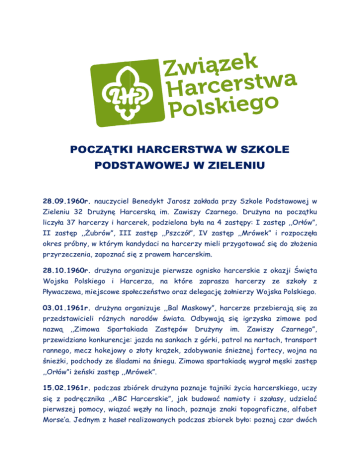 POCZĄTKI HARCERSTWA W SZKOLE PODSTAWOWEJ W ZIELENIU 28.09.1960r. nauczyciel Benedykt Jarosz zakłada przy Szkole Podstawowej w Zieleniu 32 Drużynę Harcerską im. Zawiszy Czarnego. Drużyna na początku liczyła 37 harcerzy i harcerek, podzielona była na 4 zastępy zastępy:: I zastęp ,,Orłów”, II zastęp ,,Żubrów”, III zastęp ,,Pszczół”, IV zastęp ,,Mrówek” i rozpoczęła okres próbny, w którym kandydaci na h harcerzy arcerzy mieli przygotować się do złożenia przyrzeczenia, zapoznać się z prawem harcerskim. 28.10.1960r. drużyna yna organizuje pierwsze ognisko harcerskie z okazji Święta Wojska Polskiego i Harcerza Harcerza, na które zaprasza harcerzy ze szkoły z Pływaczewa, miejscowe społeczeństwo oraz delegację żołnierzy Wojska Polskiego. 03.01.1961r. drużyna organizuje ,,Bal Maskowy”,, harcerze przebierają się za przedstawicieli różnych narodów świata. Odbywają się igrzyska igrzysk zimowe pod nazwą ,,Zimowa Spartakiada Zastępów Drużyny im. Zawiszy Czarnego”, przewidziano konkurencje: jazda na sankach z górki, patrol na nartach, transport rannego, mecz hokejowy o złoty krążek, zdobywanie śnieżnej fortecy, wojna na śnieżki, podchody ze ślada śladami na śniegu. Zimowa spartakiadę wygrał męski zastęp ,,Orłów”i żeński zastęp ,,Mrówek”. 15.02.1961r. podczas zbiórek drużyna poznaje tajniki życia harcerskiego harcerskiego, uczy się z podręcznika ,,ABC Harcerskie”, jak budować namioty i szałasy, udzielać pierwszej pomocy, ocy, wiązać węzły na linach, poznaje znaki topografic topograficzne, alfabet Morse’a. Jednym z haseł realizowanych podczas zbiorek było: poznaj czar dwóch kół swojego roweru, czyli harcerze poznawali budowę roweru, a także uczyli się, jaki poradzić sobie z drobnymi usterkami. 10.06.1961r. drużyna harcerska zorganizowała w szkole Dzień Dziecka dla pozostałych uczniów, był program artystyczny, a w nim: tańce ludowe, olimpiada sportowa w różnych konkurencjach: czwórbój lekkoatletyczny, gry drużynowe, palant, dwa ognie, szczypiorniak, w nagrodę harcerze otrzymali słodycze. 20.06.1961r. w ramach ,,Harcerskiego Lata 1961” dwóch harcerzy zostało wytypowanych na obóz szkoleniowy we Wroniu, organizowany przez Komendę Hufca w Wąbrzeźnie, byli to: druh Piotr Jarosz-przyboczny i druhna Danuta Sroka-zastępowa. Akcję harcerskiego lata nieobozowego można było ocenić jako udaną, pomimo deszczowej pogody harcerze kilka dni biwakowali na terenie boiska szkolnego we własnoręcznie wykonanych szałasach z sitowia, odbyło się również uroczyste przyrzeczenie harcerskie. Rok harcerski 1961/1962 drużynową 37 DH im. Zawiszy Czarnego zostaje nauczycielka Krystyna Stenzel, absolwentka Liceum Pedagogicznego w Grudziądzu. Po roku pracy w Szkole Podstawowej w Zieleniu zostaje przeniesiona do pracy w Komendzie Hufca w Wąbrzeźnie. Czerwiec 1962r. podczas Zlotu Chorągwianego w Bydgoszczy druh Andrzej Jarosz zdobył złoty medal w biegu na 60 m. 30.09.1962r. drużynowym 32 DH im. Zawiszy Czarnego zostaje ponownie Benedykt Jarosz, a drużynową gromady zuchowej nauczycielka Danuta Litak. Organizowany jest nabór do drużyn, ponieważ najstarsze roczniki opuściły już klasę VII, a tam było najwięcej harcerzy. Organizują się dwa nowe zastępy: ,,Koty” i ,, Stokrotki”-27 harcerzy i jedna gromada-11 zuchów. We wrześniu odbyły się wycieczki piesze do lasu do Czystochlebia i do Dylewa. Celem wycieczek było zbieranie materiałów użytkowych do pracowni zajęć technicznych oraz ćwiczenie orientacji w terenie, obsługa kompasu. 12.10.1962r. harcerze w ramach zajęć użyteczno-społecznych pomagają w budowie szkolnej pracowni zajęć technicznych. 15.10.1962r. z okazji Święta Ludowego Wojska Polskiego i Harcerza odbyło się spotkanie przy ognisku harcerzy z naszej drużyny z delegacją wojskową z Grudziądza. 3.01.1963r. drużyna przygotowała program na ferie zimowe dla dzieci, które nie są harcerzami. Odbyło się: zgaduj- zgadula kibiców sportowych, popisy jazdy na łyżwach, turniej hokejowy, turniej tenisa stołowego. Wiosna 1963r. odbywa się wycieczka rowerowa do Kowalewa Pomorskiego, gdzie harcerze zwiedzili miasto, a także w kinie obejrzeli film ,,Wojna i pokój”. 1.05.1964r. drużyna uczestniczy w pochodzie pierwszomajowym w Wąbrzeźnie. Maj 1964r. akcja letnia drużyny, odbywa się biwak szkoleniowy zastępów. 18.04.1965r. rozpoczyna się ,,Harcerski start’ organizowany przez Główną Kwaterę ZHP i Polski Komitet Olimpijski. Polega na udziale harcerzy w biegu patrolowym pod hasłem: ,,Stop czerwone światło”. Wiosna 1965r. Alert harcerskiego wiosennego zwiadu. Jednym z zadań wiosennego alertu było odwiedzenie miejsca straceń pomordowanych w czasie II wojny światowej Polaków w lesie w Nielubiu. Przy pamiątkowym obelisku harcerze zaciągnęli wartę i złożyli kwiaty. 14.11.1965r. odbywa się uroczyste przyrzeczenie harcerskie już na własny sztandar ufundowany przez Komitet Rodzicielski szkoły w Zieleniu. 28.01.1966r. harcerze goszczą delegację radziecką z miejscowości Czerkas, która zwiedziła bazę remontową miejscowego Kółka Rolniczego. Delegacji wręczono list z pozdrowieniami dla pionierów Czerkaskich oraz pamiątkowy proporzec drużyny. Rok 1966 rozpoczęły się przygotowania do obchodów 1000-lecia Państwa Polskiego, drużyna harcerska przygotowała program artystyczny. Nie udało się wyjechać drużynie na zlot hufca Radzyń Chełmiński, ponieważ PGR w Piątkowie, który za pracę harcerzy przy wykopkach ziemniaków obiecał transport na zlot, nie dotrzymał słowa, drużyna była bardzo rozczarowana. Rok harcerski 1966/67 nowym drużynowym zostaje hm. Benedykt Markowski, drużyna liczy 22 harcerzy i harcerek , pracują w zastępach: ,,Koty” i ,,Stokrotki”. Największym wydarzeniem w życiu drużyny był ,,Alert III” - harcerska próba sprawności. Szkoła w Zieleniu była miejscem spotkań c