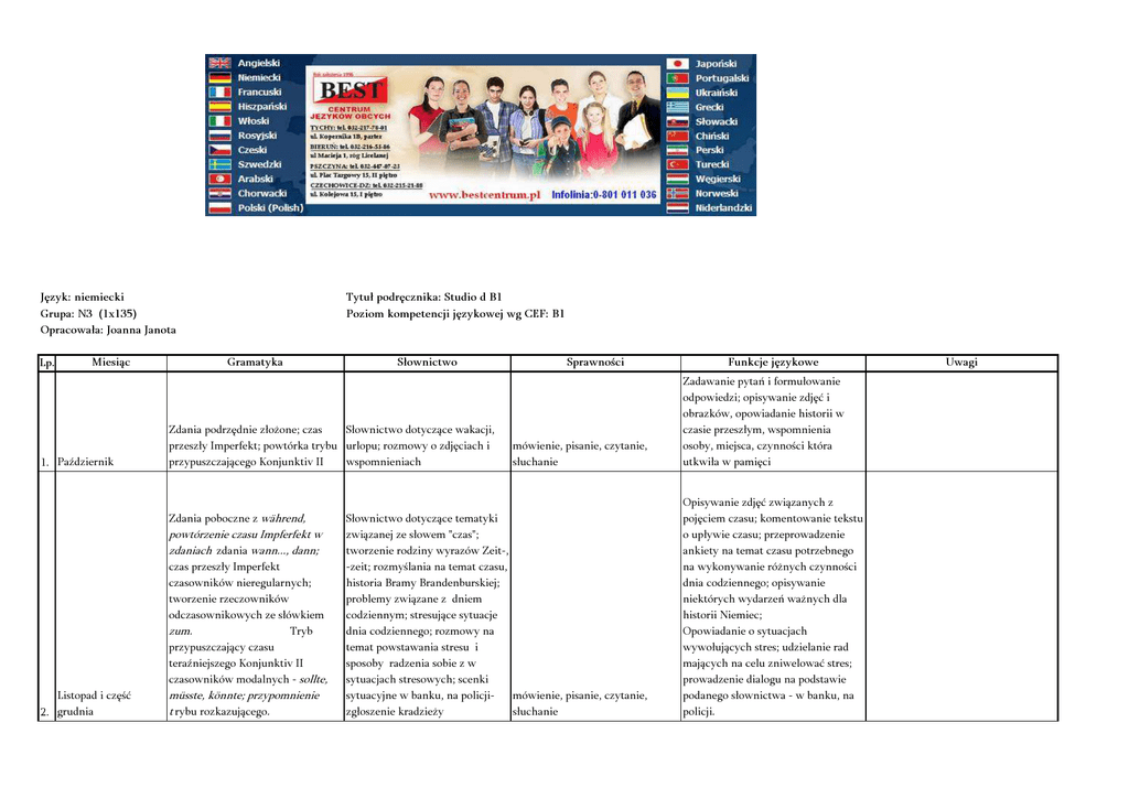 Język: niemiecki Grupa: N3 (1x135) Opracowała: Joanna Janota Lp. Miesiąc Tytuł podręcznika: Studio d B1 Poziom kompetencji językowej wg CEF: B1 Gramatyka Słownictwo 1. Październik Zdania podrzędnie złożone; czas Słownictwo dotyczące wakacji, przeszły Imperfekt; powtórka trybu urlopu; rozmowy o zdjęciach i przypuszczającego Konjunktiv II wspomnieniach Listopad i część 2. grudnia Zdania poboczne z während, powtórzenie czasu Impferfekt w zdaniach zdania wann..., dann; czas przeszły Imperfekt czasowników nieregularnych; tworzenie rzeczowników odczasownikowych ze słówkiem zum. Tryb przypuszczający czasu teraźniejszego Konjunktiv II czasowników modalnych - sollte, müsste, könnte; przypomnienie t rybu rozkazującego. Sprawności mówienie, pisanie, czytanie, słuchanie Słownictwo dotyczące tematyki związanej ze słowem "czas"; tworzenie rodziny wyrazów Zeit-, -zeit; rozmyślania na temat czasu, historia Bramy Brandenburskiej; problemy związane z dniem codziennym; stresujące sytuacje dnia codziennego; rozmowy na temat powstawania stresu i sposoby radzenia sobie z w sytuacjach stresowych; scenki sytuacyjne w banku, na policjimówienie, pisanie, czytanie, zgłoszenie kradzieży słuchanie Funkcje językowe Zadawanie pytań i formułowanie odpowiedzi; opisywanie zdjęć i obrazków, opowiadanie historii w czasie przeszłym, wspomnienia osoby, miejsca, czynności która utkwiła w pamięci Opisywanie zdjęć związanych z pojęciem czasu; komentowanie tekstu o upływie czasu; przeprowadzenie ankiety na temat czasu potrzebnego na wykonywanie różnych czynności dnia codziennego; opisywanie niektórych wydarzeń ważnych dla historii Niemiec; Opowiadanie o sytuacjach wywołujących stres; udzielanie rad mających na celu zniwelować stres; prowadzenie dialogu na podstawie podanego słownictwa - w banku, na policji. Uwagi 3. Grudzień Stereotypy dotyczące charakterów i zachowań kobiet i Zdania bezokolicznikowe z zu; mężczyzn; problemy występujące przymiotniki rozpoczynające się na w partnerstwie, przymiotniki un- i zakończone na -los; zdania opisujące charakter partnerów np. mówienie, pisanie, czytanie, poboczne z dass ehrlich oraz ich przeciwieństwa. słuchanie Prowadzenie dyskusji dotyczącej stereotypów odnośnie kobiet i mężczyzn; zwroty służące do wyrażania swojej opinii; zgadzanie się ze zdaniem/wypowiedzią innej osoby; wyrażanie sprzeciwu; dyskutowanie o problemach występujących w związkach. 4. Styczeń Odmiana przymiotnika bez rodzajnika ; odmiana przymiotnika po rodzajniku określonym i nieokreślonym; zdrobnienia; Słownictwo związane z przemysłem Niemiec; historia Zagłębia Ruhry; przemysł ciężki; mówienie, pisanie, czytanie, wypadki w pracy; słuchanie Opisywanie regionów przemysłowych Niemiec, ze szczególnym uwzględnieniem Zagłębia Rury; opis wypadku przy pracy 5. Luty Tryb przypuszczający czasu teraźniejszego Konjunktiv II ( Präsens ); powtórka ze zdań przydawkowych; Słownictwo związane ze szkolnictwem w Niemczech; zawody występujące w szkole; skala ocen, przybory i przedmioty mówienie, pisanie, czytanie, szkolne; słuchanie Opisanie swojej drogi kształcenia, formułowanie życzeń realnych i niemożliwych do spełnienia; Tworzenie zdań " Gdybym mógł………." 6. Marzec Czas przyszły Futur konstrukcja werden + Infinitiv, konstrukcje zdaniowe z je...desto, nicht nur....sondern auch, weder...noch; tworzenie zdań ze słówkiem wegen ; Zagadnienia związane z klimatem i ochroną środowiska; problemy środowiska naturalnego; powtórzenie słownictwa mówienie, pisanie, czytanie, związanego z pogodą; słuchanie Rozmowy na temat pogody, klimatu, środowiska dyskusja o problemach związanych z ekologią; 7. Kwiecień Partizip I, zdania poboczne z obwohl, konstrukcje zdaniowe nicht nur…., sondern; auch…/weder….noch; powtórka z udzielania rad za pomocą wenn i sollte Sytuacje żenujące na co dzień, zwyczaje występujące w różnych mówienie, pisanie, czytanie, państwach, gesty, mowa ciała; słuchanie Komentowanie nieprzyjemnej sytuacji, rozmowy na temat gestów i etykiety zachowań, rozpoznawanie problemu i próby jego rozwiązania; Słownictwo związane z etapami życia człowieka, począwszy od dziecięcych marzeń, poprzez młodość, dorosłe życie, aż do starości Rozmowy na temat poszczególnych etapów w życiu człowieka, dyskusja na temat konfliktów występujących w rodzinie, próby rozwiązania konfliktów, czytanie ze zrozumieniem tekstu literackiego, opowiadanie o swoich dziecięcych marzeniach 8. Maj Czasownik modalny: könnte, czas przeszły Plusquamperfekt, zdania czasowe z seit, zaimek dzierżawczy w dopełniaczu, powtórka czasu przeszłego Imperfekt mówienie, pisanie, czytanie, słuchanie 9. Czerwiec Czasownik lassen, forma strony biernej wyrażona za pomocą zaimka nieokreślonego man, zaimki w dopełniaczu wprowadzające zdanie przydawkowe, powtórka ze strony biernej,słówka pytające wofür, woran, worüber, wovon, konstrukcja bezokolicznikowa brauchen + zu, tworzenie rzeczowników zakończonych na -keit i -heit, zdania ze spójnikiem trotzdem; budowa zdań : entweder....oder Słownictwo związane z polityką europejską i instytucjami Unii Europejskiej, grupy wyrazów związane z osobami i instytucjami mówienie, pisanie, czytanie, powiązanymi z polityką; słuchanie Rozmowy na temat polityki, problemów politycznych które należy rozwiązać jak również postępowania polityków, dyskusja na temat wad i zalet Unii Europejskiej
