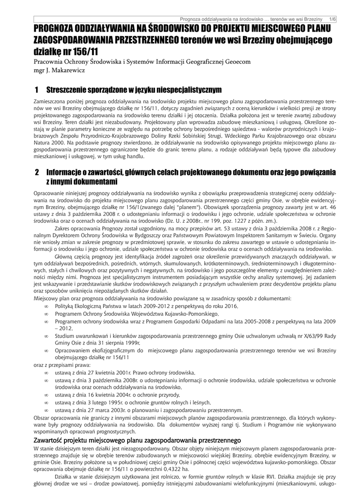 Prognoza oddziaływania na środowisko … terenów we wsi Brzeziny 1/6 PROGNOZA ODDZIAŁYWANIA NA ŚRODOWISKO DO PROJEKTU MIEJSCOWEGO PLANU ZAGOSPODAROWANIA PRZESTRZENNEGO terenów we wsi Brzeziny obejmującego działkę nr 156/11 Pracownia Ochrony Środowiska i Systemów Informacji Geograficznej Geoecom mgr J. Makarewicz 1 Streszczenie sporządzone w języku niespecjalistycznym Zamieszczona poniżej prognoza oddziaływania na środowisko projektu miejscowego planu zagospodarowania przestrzennego terenów we wsi Brzeziny obejmującego działkę nr 156/11, dotyczy zagadnień związanych z oceną kierunków i wielkości presji ze strony projektowanego zagospodarowania na środowisko terenu działki i jej otoczenia. Działka położona jest w terenie zwartej zabudowy wsi Brzeziny. Teren działki jest niezabudowany. Projektowany plan wprowadza zabudowę mieszkaniową i usługową. Określone zostają w planie parametry konieczne ze względu na potrzebę ochrony bezpośredniego sąsiedztwa - walorów przyrodniczych i krajo brazowych Zespołu Przyrodniczo-Krajobrazowego Doliny Rzeki Sobińskiej Strugi, Wdeckiego Parku Krajobrazowego oraz obszaru Natura 2000. Na podstawie prognozy stwierdzono, że oddziaływanie na środowisko opisywanego projektu miejscowego planu zagospodarowania przestrzennego ograniczone będzie do granic terenu planu, a rodzaje oddziaływań będą typowe dla zabudowy mieszkaniowej i usługowej, w tym usług handlu. 2 Informacje o zawartości, głównych celach projektowanego dokumentu oraz jego powiązania z innymi dokumentami Opracowanie niniejszej prognozy oddziaływania na środowisko wynika z obowiązku przeprowadzenia strategicznej oceny oddziaływania na środowisko do projektu miejscowego planu zagospodarowania przestrzennego części gminy Osie, w obrębie ewidencyjnym Brzeziny, obejmującego działkę nr 156/1(zwanego dalej "planem"). Obowiązek sporządzenia prognozy zawarty jest w art. 46 ustawy z dnia 3 października 2008 r. o udostępnianiu informacji o środowisku i jego ochronie, udziale społeczeństwa w ochronie środowiska oraz o ocenach oddziaływania na środowisko (Dz. U. z 2008r., nr 199, poz. 1227 z późn. zm.). Zakres opracowania Prognozy został uzgodniony, na mocy przepisów art. 53 ustawy z dnia 3 października 2008 r. z Regionalnym Dyrektorem Ochrony Środowiska w Bydgoszczy oraz Państwowym Powiatowym Inspektorem Sanitarnym w Świeciu. Organy nie wniosły zmian w zakresie prognozy w przedmiotowej sprawie, w stosunku do zakresu zawartego w ustawie o udostępnianiu informacji o środowisku i jego ochronie, udziale społeczeństwa w ochronie środowiska oraz o ocenach oddziaływania na środowisko. Główną częścią prognozy jest identyfikacja źródeł zagrożeń oraz określenie przewidywanych znaczących oddziaływań, w tym oddziaływań bezpośrednich, pośrednich, wtórnych, skumulowanych, krótkoterminowych, średnioterminowych i długoterminowych, stałych i chwilowych oraz pozytywnych i negatywnych, na środowisko i jego poszczególne elementy z uwzględnieniem zależności między nimi. Prognoza jest specjalistycznym instrumentem posiadającym wszystkie cechy analizy systemowej. Jej zadaniem jest wskazywanie i przedstawianie skutków środowiskowych związanych z przyszłym uchwaleniem przez decydentów projektu planu oraz sposobów uniknięcia niepożądanych skutków działań. Miejscowy plan oraz prognoza oddziaływania na środowisko powiązane są w zasadniczy sposób z dokumentami: • Polityką Ekologiczną Państwa w latach 2009-2012 z perspektywą do roku 2016, • Programem Ochrony Środowiska Województwa Kujawsko-Pomorskiego, • Programem ochrony środowiska wraz z Programem Gospodarki Odpadami na lata 2005-2008 z perspektywą na lata 2009 – 2012, • Studium uwarunkowań i kierunków zagospodarowania przestrzennego gminy Osie uchwalonym uchwałą nr X/63/99 Rady Gminy Osie z dnia 31 sierpnia 1999r, • Opracowaniem ekofizjograficznym do miejscowego planu zagospodarowania przestrzennego terenów we wsi Brzeziny obejmującego działkę nr 156/11 oraz z przepisami prawa: • ustawą z dnia 27 kwietnia 2001r. Prawo ochrony środowiska, • ustawą z dnia 3 października 2008r. o udostępnianiu informacji o ochronie środowiska, udziale społeczeństwa w ochronie środowiska oraz ocenach oddziaływania na środowisko, • ustawą z dnia 16 kwietnia 2004r. o ochronie przyrody, • ustawą z dnia 3 lutego 1995r. o ochronie gruntów rolnych i leśnych, • ustawą z dnia 27 marca 2003r. o planowaniu i zagospodarowaniu przestrzennym. Obszar opracowania nie graniczy z innymi obszarami miejscowych planów zagospodarowania przestrzennego, dla których wykonywane były prognozy oddziaływania na środowisko. Dla dokumentów wyższej rangi tj. Studium i Programów nie wykonywano wspominanych opracowań prognostycznych. Zawartość projektu miejscowego planu zagospodarowania przestrzennego W stanie dzisiejszym teren działki jest niezagospodarowany. Obszar objęty niniejszym miejscowym planem zagospodarowania przestrzennego znajduje się w obrębie terenów zabudowanych w miejscowości wiejskiej Brzeziny, obrębie ewidencyjnym Brzeziny, w gminie Osie. Brzeziny położone są w południowej części gminy Osie i północnej części województwa kujawsko-pomorskiego. Obszar opracowania obejmuje działkę nr 156/11 o powierzchni 0,4322 ha. Działka w stanie dzisiejszym użytkowana jest rolniczo, w formie gruntów rolnych w klasie RVI. Działka znajduje się przy głównej drodze we wsi – drodze powiatowej, pomiędzy istniejącymi zabudowaniami wielofunkcyjnymi (mieszkaniowymi, usługo- Prognoza oddziaływania na środowisko … terenów we wsi Brzeziny 2/6 wymi i produkcyjnymi). Plan zawiera ustalenia ogólne obowiązujące na całym obszarze planu oraz ustalenia szczegółowe. Plan przewiduje wprowadzenie na terenach rolnych nowych terenów funkcjonalnych: MN – zabudowę mieszkaniową jednorodzinną; U – zabudowę usługową,