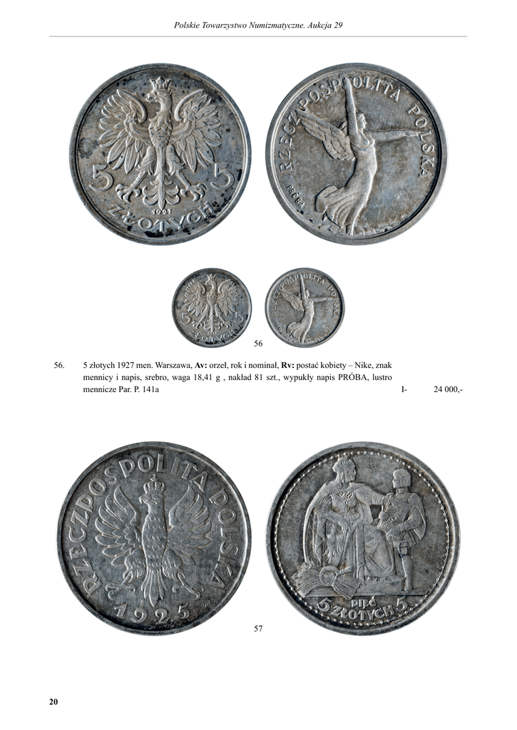 Polskie Towarzystwo Numizmatyczne. Aukcja 29 _____________________________________________________________________________________________________________________________________________________________________ 56 56. 5 złotych 1927 men. Warszawa, Av: orzeł, rok i nominał, Rv: postać kobiety – Nike, znak mennicy i napis, srebro, waga 18,41 g , nakład 81 szt., wypukły napis PRÓBA, lustro mennicze Par. P. 141a 57 20 I- 24 000,- Polskie Towarzystwo Numizmatyczne. Aukcja 29 _____________________________________________________________________________________________________________________________________________________________________ 57 57. 5 złotych 1925 – Konstytucja men. Warszawa, Av: orzeł, rok i napis, Rv: postać kobiety wręczającej młodzieńcowi konstytucję i nominał, srebro, waga 24,98 g , nakład 1 000 szt., 81 perełek . Kop. 2922 R4, F P 021. I 12 000,- I 15 000,- I 8 000,- 58 58. 5 złotych 1925 – Konstytucja, men. Warszawa, Av: orzeł, rok i napis, Rv: postać kobiety wręczającej młodzieńcowi konstytucję i nominał, srebro, waga 24,95 g , stempel głęboki nakład nieznany, 100 perełek . Kop. 2924 R4 Par. P.139d 59 59. 2 złote 1936 men. Warszawa, Av: orzeł, rok i napis, Rv: żaglowiec Dar Pomorza , wypukły napis PRÓBA, srebro, ø 22 mm, waga 4,37 g , nakład nieznany, stempel lustrzany, tęczowa patyna Par P.137a 21 Polskie Towarzystwo Numizmatyczne. Aukcja 29 _____________________________________________________________________________________________________________________________________________________________________ 60 60. 2 złote 1933 men. Warszawa, Av: orzeł, rok i napis, Rv: głowa kobiety, wypukły napis PRÓBA, srebro, ø 22 mm, waga 4,37 g ,nakład 110 szt. Par P.137a I 6 000,- I 20 000,- I- 8 000,- II 4 000,- 61 61. 2 złote 1927 men. Warszawa, Av: orzeł, rok i napis – herb Kościesza , Rv: popiersie dziewczynki, nominał i wypukły napis PRÓBA srebro, waga 10,21 g , nakład nieznany, stempel prosty lustrzany, tęczowa patyna Par P 136e 62 62. 2 złote 1924 H men. Birmingham, Av: orzeł, rok i napis, Rv: popiersie dziewczynki i nominał, srebro, waga 10,00 g, nakład 1 200 000 szt., litera H, stempel prosty, kropki patyny na awersie Par 109 b 63 63. 22 1 złoty 1928 men. Warszawa, Av: orzeł, rok i napis, Rv: wieniec z liści dębu i nominał nikiel PRÓBA nakład 35 szt. znany ze zbioru Soubise-Bisiera. Par. 126a Polskie Towarzystwo Numizmatyczne. Aukcja 29 _____________________________________________________________________________________________________________________________________________________________________ 64 64. 1 złoty 1932 men. Warszawa, Av: orzeł, rok i napis, Rv: głowa kobiety, wypukły napis PRÓBA, srebro, ø 20 mm, waga 3,35 g ,nakład 120 szt. Par. P.131a 65 65. 66. 3 000,- 66 5 groszy 1934 men. Warszawa, Av: orzeł, rok i napis, Rv: nominał, Kop. 2827 2 grosze 1933 men. Warszawa, Av: orzeł, rok i napis, Rv: nominał, Kop. 2803 67 67. 68. I- III+ III+ 100,100,- III+ III 80,80,- III 600,- 68 grosz 1933 men. Warszawa, Av: orzeł, rok i napis, Rv: nominał, Kop. 2779 grosz 1934 men. Warszawa, Av: orzeł, rok i napis, Rv: nominał, Kop. 2780 WOLNE MIASTO GDAŃSK (1923-1939) 69 69. 2 guldeny 1923 men. Utrecht, Av: herb Gdańska i rok, Rv: koga, nominał i napis, Par. 63 23 Polskie Towarzystwo Numizmatyczne. Aukcja 29 _____________________________________________________________________________________________________________________________________________________________________ 70 70. 71. 71 10 fenigów 1923 men. Berlin, Av: herb Gdańska i rok, Rv: nominał i napis, Par. 57 Zestaw 5 i 1 fenigów 4 szt. 5 – 1923 i 1928, 1 – 1923 i 1926 Par. 53,55 II III 50,200,- PRL i III RP MONETY ZŁOTE 72 72. 73. 73 2 000 zł. 1979 Mieszko I, Av:orzeł, napis, data i nominał, Rv: popiersie i napis, Fisch. KZ024 2 000 zł. 1980 Bolesław Chrobry, Av: orzeł, napis, data i nominał, Rv: popiersie i napis, Fisch. KZ026 74 74. 75. I 1 900,- I 2 800,- I 1 750,- I 1 900,- I 5 600,- I 3 500,- 75 2 000 zł. 1980 Kazimierz Odnowiciel, Av: orzeł, napis, data i nominał, Rv: popiersie i napis, Fisch. KZ027 100 zł 2000 Królowa Jadwiga, Av: orzeł, napis, data i nominał, Rv: półpostać i napis, z pudełkiem i certyfikatem Fisch. KZ(100)007 76 76. 200 zł 2000 1000-lecie Zjazdu w Gnieźnie, Av: orzeł, denar, napis i data, Rv: stylizowana scena spotkania i napis, bez pudełka i certyfikatu Fisch. KZ(100)010 77 77. 24 200 zł 2000 20 lat Solidarności, Av: orzeł, nominał, napis i data, Rv: dwie głowy, mapa i napis, z pudełkiem i certyfikatem Fisch. KZ(100)012 Polskie Towarzystwo Numizmatyczne. Aukcja 29 _____________________________________________________________________________________________________________________________________________________________________ BANKNOTY Insurekcja kościuszkowska 1794 r. 78 78. 79. 79 25 złotych 1794 ser. A nr 2788 z fragmentem znaku wodnego Peter de Vries Comp. Mił. A3 (banknot po konserwacji) 4 złote 1794 ser. I K dziurka w centrum jak Mił. A11 błąd – prawy górny ornament )): – obrócony o 90o III 1 000,- III 750,- II- 250,- Generalne Gubernatorstwo Warszawskie 1916 (1917) 80 80. 5 marek polskich 1917 ser.B „Generał” Mił. 11b po konserwacji 25 Polskie Towarzystwo Numizmatyczne. Aukcja 29 _____________________________________________________________________________________________________________________________________________________________________ II RZECZPOSPOLITA (1918-1939) Marki polskie 81 81. 1000 marek polskich 1919 ser. G Mił. 22b I- 600,- I-II- 180,- II 120,- 82 82. Zestaw 1,10,20,100,500,1000 i 5000 marek polskich 1919 Mił. 23c,25c,26c,27c,28d,29a i 31a. 83 83. 10 000 marek polskich 1922 ser. A Mił. 32 84 84. 26 10 000 marek polskich 1922 ser. B Mił. 32 I 1 100,- Polskie Towarzystwo Numizmatyczne. Aukcja 29 _________________________________________________________________________________________________________________________________________