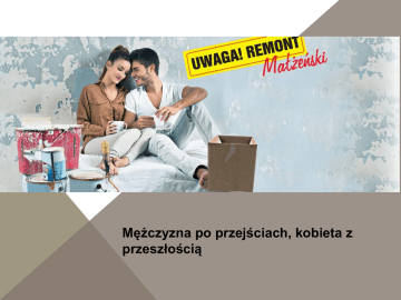 Mężczyzna po przejściach, kobieta z przeszłością • KRYTYKA - oskarżenia jako początek rozmowy, • POGARDA, CYNIZM, • POSTAWA OBRONNA - nie przyznają się do błędów, nie przepraszają, atak • MUR OBOJĘTNOŚCI - wał przeciwpowodziowy • POTOP - zalew negatywnych uczuć, ALARM OSTATNIE OSTRZEŻENIE REMONTOWE • NIEPOWODZENIE PRÓB ratowania dyskusji • ZATRUCIE WSPOMNIEŃ • WYCOFANIE SIĘ ZE ZWIĄZKU partnerzy uważają, że mają poważne problemy. wspólna rozmowa wydaje się bezsensowna. małżonkowie zaczynają żyć obok siebie. pojawia się uczucie samotności. zdrada Co mnie zachwyca/podoba mi się w Tobie, a co wyniosłeś ze swojego domu rodzinnego? Zachwyca mnie…………. Co mi przeszkadza w życiu z Tobą, a co wyniosłeś ze swojego domu rodzinnego? Przeszkadza mi………… POMYŚL, I SPRÓBUJ BYĆ SZCZERY, Co z tym zrobię co usłyszałem UKRYTE STRATEGIE MANIPULOWANIA Obwinianie i osądzanie Wzbudzanie poczucia winy Wzbudzanie litości Szantaż Przekupstwo Zjednywanie Chłód Objawy chorobowe i zachowania ucieczkowe ratownik Trójkąt dramatyczny ofiara prześladowca GRY RATOWNICZE • • • • • • • • Przecież ja chcę dla ciebie dobrze Ja ci tylko chcę pomóc Do sług – daj ja to zrobię Sam sobie nie poradzisz Gdybym był tobą Opowiedz mi szybko co się stało Napij się jeszcze to ci pomoże Szczęście że ty mnie masz – cos ty byś beze mnie zrobił GRY PRZEŚLADOWCY • Tu cię dorwałem ty … • Punktowanie • Gdyby cię nie było to.... • Zobacz , co przez ciebie zrobiłem • Moje lepsze/ moje gorsze • Coś wiem ale nie powiem • Patrz coś mi zrobił GRY OFIARY • • • • • • • • • Ja się na tym nie znam Struganie wariata Daj mi kopa To straszne Ale ja chyba cię zanudzam Ja nie potrafię ty potrafisz Co zrobię jeśli ty mnie opuścisz TAK ALE To tylko mnie mogło się przydarzyć • Ja się na tym nie znam • Struganie wariata • To straszne • Ale ja chyba cię zanudzam • Ja nie potrafię ty potrafisz • Co zrobię jeśli ty mnie opuścisz • TAK ALE • To tylko mnie mogło się przydarzyć OFIARA • Przecież ja chcę dla ciebie dobrze • Ja ci tylko chcę pomóc • Do sług – daj ja to zrobię • Sam sobie nie poradzisz • Gdybym był tobą • Opowiedz mi szybko co się stało • Szczęście że ty mnie masz – cos ty byś beze mnie zrobił R AT O W N I K • Tu cię dorwałem ty... • Punktowanie • Gdyby cię nie było to.... • Zobacz , co przez ciebie zrobiłem • Moje lepsze/ moje gorsze • Coś wiem ale nie powiem • Patrz coś mi zrobił PRZEŚLADOWCA Jak wygląda typowy trójkąt w moim życiu małżeńskim ZASADY UCZCIWEJ KŁÓTNI • Wyznacz odpowiedni czas, miejsce • Opisz problem • Trzymaj się jednej sprawy • Wyraź pełną gamę uczuć • Zaproponuj zmianę. • Przedstaw konsekwencje. • Zapobiegaj eskalacji. - obserwowanie zachowania niewerbalnego, - głębokie oddychanie w celu zwolnienia tempa interakcji oraz -odłożenie dyskusji na później. • Zakończ rozmowę ugodą, alternatywną propozycją lub odłożeniem sprawy na później.