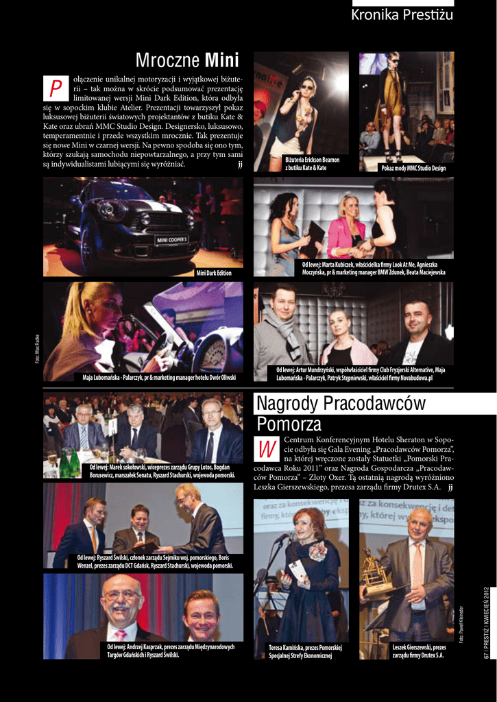 Kronika Prestiżu Mroczne Mini ołączenie unikalnej motoryzacji i wyjątkowej biżuterii – tak można w skrócie podsumować prezentację limitowanej wersji Mini Dark Edition, która odbyła się w sopockim klubie Atelier. Prezentacji towarzyszył pokaz luksusowej biżuterii światowych projektantów z butiku Kate & Kate oraz ubrań MMC Studio Design. Designersko, luksusowo, temperamentnie i przede wszystkim mrocznie. Tak prezentuje się nowe Mini w czarnej wersji. Na pewno spodoba się ono tym, którzy szukają samochodu niepowtarzalnego, a przy tym sami są indywidualistami lubiącymi się wyróżniać. jj p Biżuteria Erickson Beamon z butiku Kate & Kate Pokaz mody MMC Studio Design Od lewej: Marta Kubiczek, właścicielka firmy Look At Me, Agnieszka Moczyńska, pr & marketing manager BMW Zdunek, Beata Maciejewska Foto: Max Radke Mini Dark Edition Od lewej: Artur Mundrzyński, współwłaściciel firmy Club Fryzjerski Alternative, Maja Lubomańska - Palarczyk, Patryk Stępniewski, właściciel firmy Novabudowa.pl Maja Lubomańska - Palarczyk, pr & marketing manager hotelu Dwór Oliwski Nagrody Pracodawców Pomorza Od lewej: Marek sokołowski, wiceprezes zarządu Grupy Lotos, Bogdan Borusewicz, marszałek Senatu, Ryszard Stachurski, wojewoda pomorski. Centrum Konferencyjnym Hotelu Sheraton w Sopocie odbyła się Gala Evening „Pracodawców Pomorza”, na której wręczone zostały Statuetki „Pomorski Pracodawca Roku 2011” oraz Nagroda Gospodarcza „Pracodawców Pomorza” – Złoty Oxer. Tą ostatnią nagrodą wyróżniono Leszka Gierszewskiego, prezesa zarządu firmy Drutex S.A. jj w Teresa Kamińska, prezes Pomorskiej Specjalnej Strefy Ekonomicznej Leszek Gierszewski, prezes zarządu firmy Drutex S.A. 67 | PRESTIŻ | kwiecień 2012 Od lewej: Andrzej Kasprzak, prezes zarządu Międzynarodowych Targów Gdańskich i Ryszard Świlski. Foto: Paweł Kleineder Od lewej: Ryszard Świlski, członek zarządu Sejmiku woj. pomorskiego, Boris Wenzel, prezes zarządu DCT Gdańsk, Ryszard Stachurski, wojewoda pomorski.