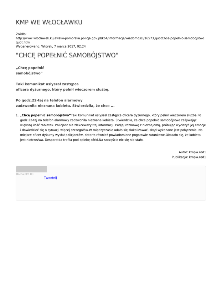 KMP WE WŁOCŁAWKU Źródło: http://www.wloclawek.kujawsko-pomorska.policja.gov.pl/kb4/informacje/wiadomosci/16573,quotChce-popelnic-samobojstwo quot.html Wygenerowano: Wtorek, 7 marca 2017, 02:24 "CHCĘ POPEŁNIĆ SAMOBÓJSTWO" „Chcę popełnić samobójstwo” Taki komunikat usłyszał zastępca oficera dyżurnego, który pełnił wieczorem służbę. Po godz.22-tej na telefon alarmowy zadzwoniła nieznana kobieta. Stwierdziła, że chce ... 1. „Chcę popełnić samobójstwo”Taki komunikat usłyszał zastępca oficera dyżurnego, który pełnił wieczorem służbę.Po godz.22-tej na telefon alarmowy zadzwoniła nieznana kobieta. Stwierdziła, że chce popełnić samobójstwo zażywając większą ilość tabletek. Policjant nie zlekceważył tej informacji. Podjął rozmowę z nieznajomą, próbując wyciszyć jej emocje i dowiedzieć się o sytuacji więcej szczegółów.W międzyczasie udało się zlokalizować, skąd wykonane jest połączenie. Na miejsce oficer dyżurny wysłał policjantów, dotarło również powiadomione pogotowie ratunkowe.Okazało się, że kobieta jest nietrzeźwa. Desperatka trafiła pod opiekę córki.Na szczęście nic się nie stało. Autor: kmpw.red1 Publikacja: kmpw.red1 Ocena: 0/5 (0) Tweetnij