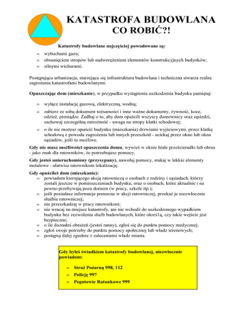 KATASTROFA BUDOWLANA CO ROBIĆ?! Katastrofy budowlane najczęściej powodowane są: • • • wybuchami gazu; obsunięciem stropów lub nadweręŜeniem elementów konstrukcyjnych budynków; silnymi wichurami. Postępująca urbanizacja, starzejąca się infrastruktura budowlana i techniczna stwarza realne zagroŜenia katastrofami budowlanymi. Opuszczając dom (mieszkanie), w przypadku wystąpienia uszkodzenia budynku pamiętaj: • wyłącz instalację gazową, elektryczną, wodną; • zabierz ze sobą dokument toŜsamości i inne waŜne dokumenty, Ŝywność, koce, odzieŜ, pieniądze. Zadbaj o to, aby dom opuścili wszyscy domownicy oraz sąsiedzi, zachowaj szczególną ostroŜność - uwaga na stropy klatki schodowej; • o ile nie moŜesz opuścić budynku (mieszkania) drzwiami wyjściowymi, przez klatkę schodową z powodu zagroŜenia lub innych przeszkód - uciekaj przez okno lub okna sąsiadów, jeśli to moŜliwe. Gdy nie masz moŜliwości opuszczenia domu, wywieś w oknie białe prześcieradło lub obrus - jako znak dla ratowników, Ŝe potrzebujesz pomocy. Gdy jesteś unieruchomiony (przysypany), nawołuj pomocy, stukaj w lekkie elementy metalowe - ułatwisz ratownikom lokalizację. Gdy opuściłeś dom (mieszkanie): • powiadom kierującego akcją ratowniczą o osobach z rodziny i sąsiadach, którzy zostali jeszcze w pomieszczeniach budynku, oraz o osobach, które aktualnie i na pewno przebywają poza domem (w pracy, szkole itp.); • jeśli posiadasz informacje pomocne w akcji ratowniczej, przekaŜ je niezwłocznie słuŜbie ratowniczej; • nie przeszkadzaj w pracy ratownikom; • nie wracaj na miejsce katastrofy, ani nie wchodź do uszkodzonego wypadkiem budynku bez zezwolenia słuŜb budowlanych, które okreś1ą, czy takie wejście jest bezpieczne; • o ile doznałeś obraŜeń (jesteś ranny), zgłoś się do punktu pomocy medycznej; • zgłoś swoje potrzeby do punktu pomocy społecznej lub władz terenowych; • postępuj dalej zgodnie z zaleceniami władz miasta. Gdy byłeś świadkiem katastrofy budowlanej, niezwłocznie powiadom: • StraŜ PoŜarną 998, 112 • Policję 997 • Pogotowie Ratunkowe 999
