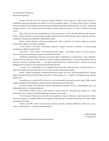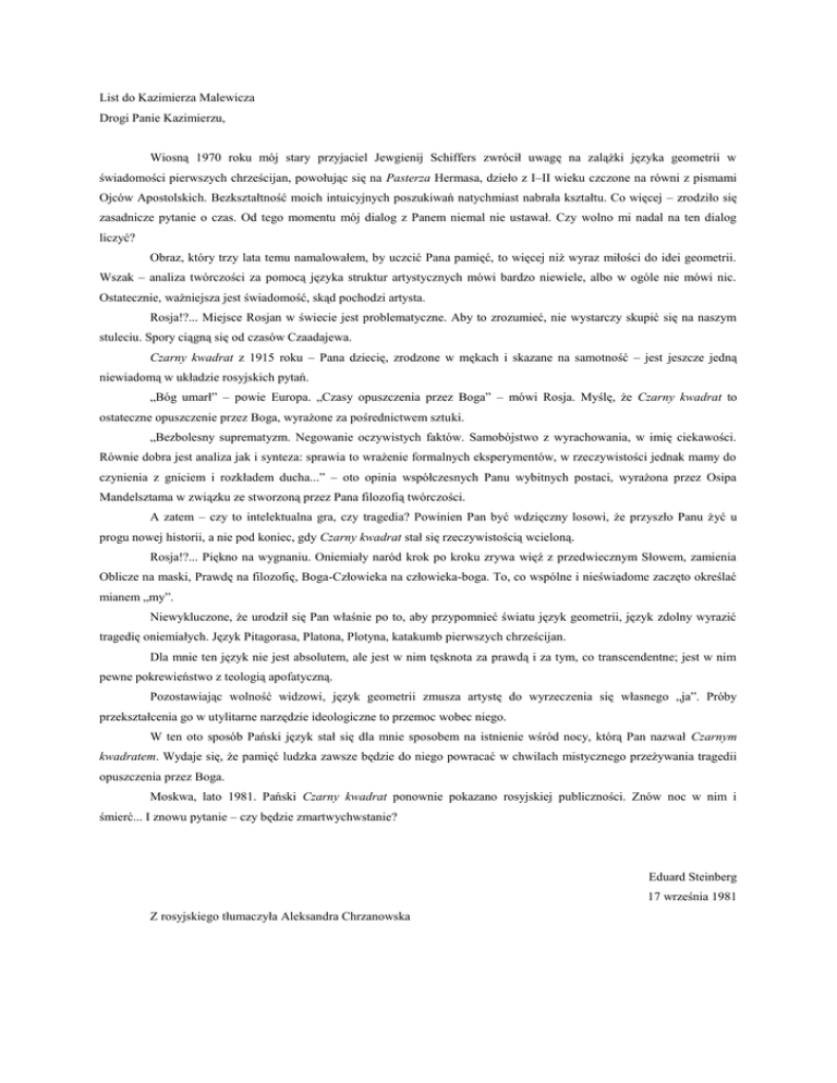 List do Kazimierza Malewicza Drogi Panie Kazimierzu, Wiosną 1970 roku mój stary przyjaciel Jewgienij Schiffers zwrócił uwagę na zalążki języka geometrii w świadomości pierwszych chrześcijan, powołując się na Pasterza Hermasa, dzieło z I–II wieku czczone na równi z pismami Ojców Apostolskich. Bezkształtność moich intuicyjnych poszukiwań natychmiast nabrała kształtu. Co więcej – zrodziło się zasadnicze pytanie o czas. Od tego momentu mój dialog z Panem niemal nie ustawał. Czy wolno mi nadal na ten dialog liczyć? Obraz, który trzy lata temu namalowałem, by uczcić Pana pamięć, to więcej niż wyraz miłości do idei geometrii. Wszak – analiza twórczości za pomocą języka struktur artystycznych mówi bardzo niewiele, albo w ogóle nie mówi nic. Ostatecznie, ważniejsza jest świadomość, skąd pochodzi artysta. Rosja!?... Miejsce Rosjan w świecie jest problematyczne. Aby to zrozumieć, nie wystarczy skupić się na naszym stuleciu. Spory ciągną się od czasów Czaadajewa. Czarny kwadrat z 1915 roku – Pana dziecię, zrodzone w mękach i skazane na samotność – jest jeszcze jedną niewiadomą w układzie rosyjskich pytań. „Bóg umarł” – powie Europa. „Czasy opuszczenia przez Boga” – mówi Rosja. Myślę, że Czarny kwadrat to ostateczne opuszczenie przez Boga, wyrażone za pośrednictwem sztuki. „Bezbolesny suprematyzm. Negowanie oczywistych faktów. Samobójstwo z wyrachowania, w imię ciekawości. Równie dobra jest analiza jak i synteza: sprawia to wrażenie formalnych eksperymentów, w rzeczywistości jednak mamy do czynienia z gniciem i rozkładem ducha...” – oto opinia współczesnych Panu wybitnych postaci, wyrażona przez Osipa Mandelsztama w związku ze stworzoną przez Pana filozofią twórczości. A zatem – czy to intelektualna gra, czy tragedia? Powinien Pan być wdzięczny losowi, że przyszło Panu żyć u progu nowej historii, a nie pod koniec, gdy Czarny kwadrat stał się rzeczywistością wcieloną. Rosja!?... Piękno na wygnaniu. Oniemiały naród krok po kroku zrywa więź z przedwiecznym Słowem, zamienia Oblicze na maski, Prawdę na filozofię, Boga-Człowieka na człowieka-boga. To, co wspólne i nieświadome zaczęto określać mianem „my”. Niewykluczone, że urodził się Pan właśnie po to, aby przypomnieć światu język geometrii, język zdolny wyrazić tragedię oniemiałych. Język Pitagorasa, Platona, Plotyna, katakumb pierwszych chrześcijan. Dla mnie ten język nie jest absolutem, ale jest w nim tęsknota za prawdą i za tym, co transcendentne; jest w nim pewne pokrewieństwo z teologią apofatyczną. Pozostawiając wolność widzowi, język geometrii zmusza artystę do wyrzeczenia się własnego „ja”. Próby przekształcenia go w utylitarne narzędzie ideologiczne to przemoc wobec niego. W ten oto sposób Pański język stał się dla mnie sposobem na istnienie wśród nocy, którą Pan nazwał Czarnym kwadratem. Wydaje się, że pamięć ludzka zawsze będzie do niego powracać w chwilach mistycznego przeżywania tragedii opuszczenia przez Boga. Moskwa, lato 1981. Pański Czarny kwadrat ponownie pokazano rosyjskiej publiczności. Znów noc w nim i śmierć... I znowu pytanie – czy będzie zmartwychwstanie? Eduard Steinberg 17 września 1981 Z rosyjskiego tłumaczyła Aleksandra Chrzanowska