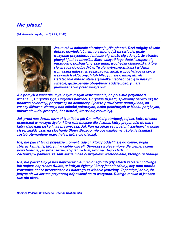 Nie płacz! (10 niedziela zwykła, rok C, Łk 7, 11-17) Jezus mówi kobiecie cierpiącej: „Nie płacz!”. Dziś mógłby równie dobrze powiedzieć nam to samo, gdyż na świecie, gdzie wszystko przyspiesza i miesza się, może się zdarzyć, że stracisz głowę! I jest co stracić... Masz wszystkiego dość i czujesz się odrzucony, pozbawiony szacunku, trochę jak chusteczka, którą się wrzuca do odpadków. Twoje wytyczne znikają i widzisz wymazaną miłość, wrzeszczących ludzi, wybuchające urazy, a wszystkich skłóconych lub bijących się o mniej niż nic. Ostatecznie miłość staje się wielką nieobecnością w naszym świecie, gdzie panuje obojętność i gdzie pozory mają pierwszeństwo przed wszystkim... Ale pomyśl o wahadle, myśl o tym małym instrumencie, bo po zimie przychodzi wiosna... „Chrystus żyje, Chrystus powróci, Chrystus tu jest”, śpiewamy bardzo często podczas celebracji, począwszy od anamnezy. I jest to prawdziwe: nauczył nas, co znaczy Miłować. Nauczył nas miłości pokornych, nisko położonych w blasku potężnych, miłowania ludzi prostych, bez historii, którzy się rozumieją. Jak prosi nas Jezus, czyń akty miłości jak On, miłości poświęcającej się, która otwiera przestrzeń w naszym życiu, która robi miejsce dla Jezusa, który przychodzi do nas i który daje nam łaskę i nas przewyższa. Jak Pan na górze czy pustyni, zachowaj w sobie ciszę, znajdź czas na słuchanie Słowa Bożego, nie pozwalając na uśpienie (zamiast zostać otumaniony przez hałas, który cię otacza). Nie, nie płacz! Gdyż przyjdzie moment, gdy ci, którzy oddalili się od ciebie, pójdą zbierać kamienie, którymi w ciebie rzucali. Otworzą swoje ramiona dla ciebie, razem powstaniecie, jak prosi Jezus, aby iść za Nim, krocząc Jego śladami. Zachowaj w pamięci, że sam Jezus może ci przynieść wzmocnienie, którego Ci brakuje. Nie, nie płacz! Gdy jesteś naprzeciw nieuniknionego lub gdy strach zabiera ci odwagę lub stajesz naprzeciw świata, w którym żyjemy i który jest niezdolny, aby nam pomóc zrozumieć nasze przeznaczenie i dlaczego tu właśnie jesteśmy. Zapamiętaj sobie, że jedyne słowa Jezusa przynoszą odpowiedź na to wszystko. Dlatego mówię ci jeszcze raz: nie płacz. Bernard Vollerin, tłumaczenie: Joanna Szubstarska