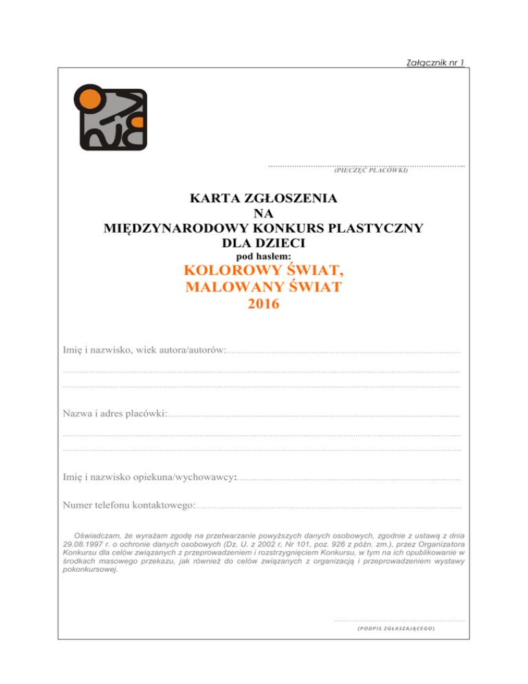 Załącznik nr 1 ……………………………….……………………………………….. (PIECZĘĆ PLACÓWKI) KARTA ZGŁOSZENIA NA MIĘDZYNARODOWY KONKURS PLASTYCZNY DLA DZIECI pod hasłem: KOLOROWY ŚWIAT, MALOWANY ŚWIAT 2016 Imię i nazwisko, wiek autora/autorów:……………………………………………………………………………………… …………………………………………………………………………………………………………………………………………………… ……………………………………………………………………………………………………...………………….………………………… Nazwa i adres placówki:……………………………………………………………………………………………………….…… ………………….………………………………………………………………………………………………………………………………… ………………………………………………………………………………………………………………………………………….……….... Imię i nazwisko opiekuna/wychowawcy:………………………………………………………………………………….. Numer telefonu kontaktowego:………………………………………………………………………………………………….. Oświadczam, że wyrażam zgodę na przetwarzanie powyższych danych osobowych, zgodnie z ustawą z dnia 29.08.1997 r. o ochronie danych osobowych (Dz. U. z 2002 r, Nr 101, poz. 926 z późn. zm.), przez Organizatora Konkursu dla celów związanych z przeprowadzeniem i rozstrzygnięciem Konkursu, w tym na ich opublikowanie w środkach masowego przekazu, jak również do celów związanych z organizacją i przeprowadzeniem wystawy pokonkursowej. ……………………………………………….. (P ODP IS ZGŁASZAJĄ CEGO )