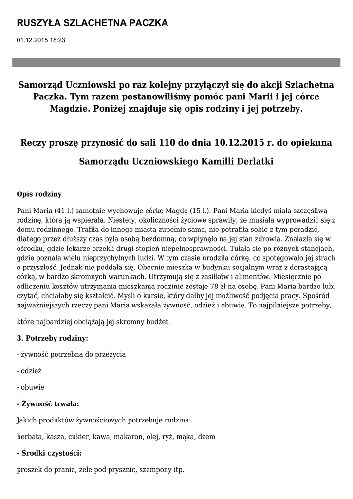 RUSZYŁA SZLACHETNA PACZKA 01.12.2015 18:23 Samorząd Uczniowski po raz kolejny przyłączył się do akcji Szlachetna Paczka. Tym razem postanowiliśmy pomóc pani Marii i jej córce Magdzie. Poniżej znajduje się opis rodziny i jej potrzeby. Reczy proszę przynosić do sali 110 do dnia 10.12.2015 r. do opiekuna Samorządu Uczniowskiego Kamilli Derlatki Opis rodziny Pani Maria (41 l.) samotnie wychowuje córkę Magdę (15 l.). Pani Maria kiedyś miała szczęśliwą rodzinę, która ją wspierała. Niestety, okoliczności życiowe sprawiły, że musiała wyprowadzić się z domu rodzinnego. Trafiła do innego miasta zupełnie sama, nie potrafiła sobie z tym poradzić, dlatego przez dłuższy czas była osobą bezdomną, co wpłynęło na jej stan zdrowia. Znalazła się w ośrodku, gdzie lekarze orzekli drugi stopień niepełnosprawności. Tułała się po różnych stancjach, gdzie poznała wielu nieprzychylnych ludzi. W tym czasie urodziła córkę, co spotęgowało jej strach o przyszłość. Jednak nie poddała się. Obecnie mieszka w budynku socjalnym wraz z dorastającą córką, w bardzo skromnych warunkach. Utrzymują się z zasiłków i alimentów. Miesięcznie po odliczeniu kosztów utrzymania mieszkania rodzinie zostaje 78 zł na osobę. Pani Maria bardzo lubi czytać, chciałaby się kształcić. Myśli o kursie, który dałby jej możliwość podjęcia pracy. Spośród najważniejszych rzeczy pani Maria wskazała żywność, odzież i obuwie. To najpilniejsze potrzeby, które najbardziej obciążają jej skromny budżet. 3. Potrzeby rodziny: - żywność potrzebna do przeżycia - odzież - obuwie - Żywność trwała: Jakich produktów żywnościowych potrzebuje rodzina: herbata, kasza, cukier, kawa, makaron, olej, ryż, mąka, dżem - Środki czystości: proszek do prania, żele pod prysznic, szampony itp. Obuwie – rozmiar 40 Odzież – rozmiar XXL oraz XXXL Rodzina potrzebuje również: pościel, kołdrę, poduszki itp.