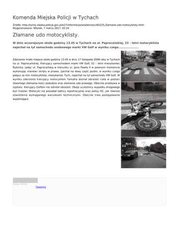 Komenda Miejska Policji w Tychach Źródło: http://tychy.slaska.policja.gov.pl/k27/informacje/wiadomosci/65225,Zlamane-udo-motocyklisty.html Wygenerowano: Wtorek, 7 marca 2017, 02:24 Złamane udo motocyklisty. W dniu wczorajszym około godziny 13.45 w Tychach na ul. Paprocańskiej, 23 – letni motocyklista najechał na tył samochodu osobowego marki VW Golf w wyniku czego.................... Zdarzenie miało miejsce około godziny 13.45 w dniu 17 listopada 2008 roku w Tychach na ul. Paprocańskiej. Kierujący samochodem marki VW Golf, 52 – letni mieszkaniec Rybnika, jadąc ul. Paprocańską w kierunku ul. Jana Pawła II w pewnym momencie wykonując manewr skrętu w prawo, zjechał na lewą część jezdni, w wyniku czego jadący za nim motocyklista, mieszkaniec Tych, najechał na tył samochodu VW Golf. W wyniku zderzenia kierujący motocyklem Yamaha doznał obrażeń ciała w postaci otwartego złamania kości podudzia oraz złamania uda prawego. Obecnie przebywa w szpitalu. Kierujący Golfem nie odniósł obrażeń. Oboje uczestnicy wypadku drogowego byli trzeźwi. Motocykl nie posiadał tablicy rejestracyjnej oraz polisy OC, jak również oświetlenia wymaganego warunkami technicznymi. Obecnie trwa postępowanie wyjaśniające. Ocena: 0/5 (0) Tweetnij