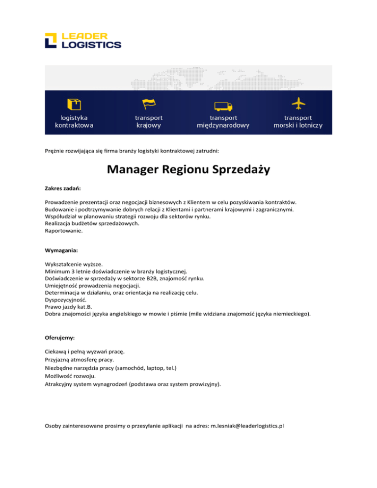 Prężnie rozwijająca się firma branży logistyki kontraktowej zatrudni: Manager Regionu Sprzedaży Zakres zadań: Prowadzenie prezentacji oraz negocjacji biznesowych z Klientem w celu pozyskiwania kontraktów. Budowanie i podtrzymywanie dobrych relacji z Klientami i partnerami krajowymi i zagranicznymi. Współudział w planowaniu strategii rozwoju dla sektorów rynku. Realizacja budżetów sprzedażowych. Raportowanie. Wymagania: Wykształcenie wyższe. Minimum 3 letnie doświadczenie w branży logistycznej. Doświadczenie w sprzedaży w sektorze B2B, znajomość rynku. Umiejętność prowadzenia negocjacji. Determinacja w działaniu, oraz orientacja na realizację celu. Dyspozycyjność. Prawo jazdy kat.B. Dobra znajomości języka angielskiego w mowie i piśmie (mile widziana znajomość języka niemieckiego). Oferujemy: Ciekawą i pełną wyzwań pracę. Przyjazną atmosferę pracy. Niezbędne narzędzia pracy (samochód, laptop, tel.) Możliwość rozwoju. Atrakcyjny system wynagrodzeń (podstawa oraz system prowizyjny). Osoby zainteresowane prosimy o przesyłanie aplikacji na adres: [email protected]