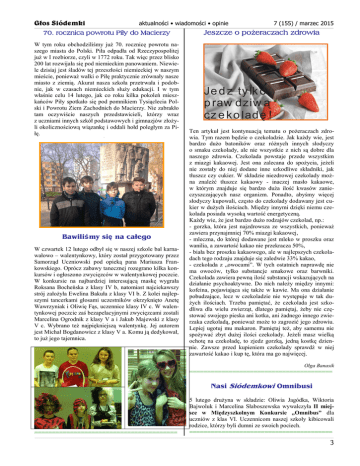Głos Siódemki aktualności • wiadomości • opinie 7 (155) / marzec 2015 _______________________________________________________________________________________________________________________________________________________________________________________________________________________________________________________________________________________________________________________________________________________________________________________ 70. rocznica powrotu Piły do Macierzy W tym roku obchodziliśmy już 70. rocznicę powrotu naszego miasta do Polski. Piła odpadła od Rzeczypospolitej już w I rozbiorze, czyli w 1772 roku. Tak więc przez blisko 200 lat rozwijała się pod niemieckim panowaniem. Niewiele dzisiaj jest śladów tej przeszłości niemieckiej w naszym mieście, ponieważ walki o Piłę praktycznie zrównały nasze miasto z ziemią. Akurat nasza szkoła przetrwała i podobnie, jak w czasach niemieckich służy edukacji. I w tym właśnie celu 14 lutego, jak co roku kilka pokoleń mieszkańców Piły spotkało się pod pomnikiem Tysiąclecia Polski i Powrotu Ziem Zachodnich do Macierzy. Nie zabrakło tam oczywiście naszych przedstawicieli, którzy wraz z uczniami innych szkół podstawowych i gimnazjów złożyli okolicznościową wiązankę i oddali hołd poległym za Piłę. Bawiliśmy się na całego W czwartek 12 lutego odbył się w naszej szkole bal karnawałowo – walentynkowy, który został przygotowany przez Samorząd Uczniowski pod opieką pana Mariusza Frankowskiego. Oprócz zabawy tanecznej rozegrano kilka konkursów i ogłoszono zwycięzców w walentynkowej poczcie. W konkursie na najbardziej interesującą maskę wygrała Roksana Bocheńska z klasy IV b, natomiast najciekawszy strój założyła Ewelina Bakuła z klasy VI b. Z kolei najlepszymi tancerkami głosami uczestników okrzyknięto Anetę Wawrzyniak i Oliwię Fąs, uczennice klasy IV c. W walentynkowej poczcie zaś bezapelacyjnymi zwycięzcami zostali Marcelina Ogrodnik z klasy V a i Jakub Majewski z klasy V c. Wybrano też najpiękniejszą walentynkę. Jej autorem jest Michał Bogdanowicz z klasy V a. Komu ją dedykował, to już jego tajemnica. Jeszcze o pożeraczach zdrowia Je d z ty lk o p raw dziw ą cz e ko ladę ! Ten artykuł jest kontynuacją tematu o pożeraczach zdrowia. Tym razem będzie o czekoladzie. Jak każdy wie, jest bardzo dużo batoników oraz różnych innych słodyczy o smaku czekolady, ale nie wszystkie z nich są dobre dla naszego zdrowia. Czekolada powstaje przede wszystkim z miazgi kakaowej. Jest ona zalecana do spożycia, jeżeli nie zostały do niej dodane inne szkodliwe składniki, jak tłuszcz czy cukier. W składzie niezdrowej czekolady można znaleźć tłuszcz kakaowy - inaczej masło kakaowe, w którym znajduje się bardzo duża ilość kwasów zanieczyszczających nasz organizm. Ponadto, abyśmy więcej słodyczy kupowali, często do czekolady dodawany jest cukier w dużych ilościach. Między innymi dzięki niemu czekolada posiada wysoką wartość energetyczną. Każdy wie, że jest bardzo dużo rodzajów czekolad, np.: - gorzka, która jest najzdrowsza ze wszystkich, ponieważ zawiera przynajmniej 70% miazgi kakaowej, - mleczna, do której dodawane jest mleko w proszku oraz wanilia, a zawartość kakao nie przekracza 50%, - biała bez proszku kakaowego, ale w najlepszych czekoladach tego rodzaju znajduje się zaledwie 33% kakao, - czekolada z „owocami”. W tych ostatnich naprawdę nie ma owoców, tylko substancje smakowe oraz barwniki. Czekolada zawiera pewną ilość substancji wskazujących na działanie psychoaktywne. Do nich należy między innymi: kofeina, pojawiająca się także w kawie. Ma ona działanie pobudzające, lecz w czekoladzie nie występuje w tak dużych ilościach. Trzeba pamiętać, że czekolada jest szkodliwa dla wielu zwierząt, dlatego pamiętaj, żeby nie częstować swojego pieska ani kotka, ani żadnego innego zwierzaka czekoladą, ponieważ może to zagrozić jego zdrowiu. Lepiej ugotuj mu makaron. Pamiętaj też, aby samemu nie spożywać zbyt dużej ilości czekolady. Jeżeli masz wielką ochotę na czekoladę, to zjedz gorzką, jedną kostkę dziennie. Zawsze przed kupieniem czekolady sprawdź w niej zawartość kakao i kup tę, która ma go najwięcej. Olga Banasik ======================================== Nasi Siódemkowi Omnibusi 5 lutego drużyna w składzie: Oliwia Jagódka, Wiktoria Bajwoluk i Marcelina Słaboszewska wywalczyła II miejsce w Międzyszkolnym Konkursie „Omnibus” dla uczniów z klas VI. Uczennicom naszej szkoły kibicowali rodzice, którzy byli dumni ze swoich pociech. ======================================== ======================================== __________________________________________________________________________________________________________________________________________________________________________________________________________________________________________________________________________________________________________________________________________________________________________________________________________________________________________________________________________ 3