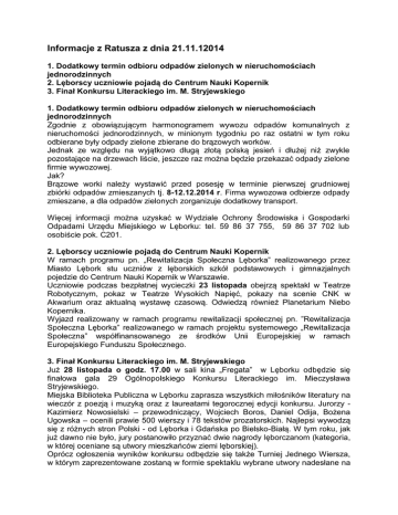 Informacje z Ratusza z dnia 21.11.12014 1. Dodatkowy termin odbioru odpadów zielonych w nieruchomościach jednorodzinnych 2. Lęborscy uczniowie pojadą do Centrum Nauki Kopernik 3. Finał Konkursu Literackiego im. M. Stryjewskiego 1. Dodatkowy termin odbioru odpadów zielonych w nieruchomościach jednorodzinnych Zgodnie z obowiązującym harmonogramem wywozu odpadów komunalnych z nieruchomości jednorodzinnych, w minionym tygodniu po raz ostatni w tym roku odbierane były odpady zielone zbierane do brązowych worków. Jednak ze względu na wyjątkowo długą złotą polską jesień i dłużej niż zwykle pozostające na drzewach liście, jeszcze raz można będzie przekazać odpady zielone firmie wywozowej. Jak? Brązowe worki należy wystawić przed posesję w terminie pierwszej grudniowej zbiórki odpadów zmieszanych tj. 8-12.12.2014 r. Firma wywozowa odbierze odpady zmieszane, a dla odpadów zielonych zorganizuje dodatkowy transport. Więcej informacji można uzyskać w Wydziale Ochrony Środowiska i Gospodarki Odpadami Urzędu Miejskiego w Lęborku: tel. 59 86 37 755, 59 86 37 702 lub osobiście pok. C201. 2. Lęborscy uczniowie pojadą do Centrum Nauki Kopernik W ramach programu pn. „Rewitalizacja Społeczna Lęborka” realizowanego przez Miasto Lębork stu uczniów z lęborskich szkół podstawowych i gimnazjalnych pojedzie do Centrum Nauki Kopernik w Warszawie. Uczniowie podczas bezpłatnej wycieczki 23 listopada obejrzą spektakl w Teatrze Robotycznym, pokaz w Teatrze Wysokich Napięć, pokazy na scenie CNK w Akwarium oraz aktualną wystawę czasową. Odwiedzą również Planetarium Niebo Kopernika. Wyjazd realizowany w ramach programu rewitalizacji społecznej pn. ”Rewitalizacja Społeczna Lęborka” realizowanego w ramach projektu systemowego „Rewitalizacja Społeczna” współfinansowanego ze środków Unii Europejskiej w ramach Europejskiego Funduszu Społecznego. 3. Finał Konkursu Literackiego im. M. Stryjewskiego Już 28 listopada o godz. 17.00 w sali kina „Fregata” w Lęborku odbędzie się finałowa gala 29 Ogólnopolskiego Konkursu Literackiego im. Mieczysława Stryjewskiego. Miejska Biblioteka Publiczna w Lęborku zaprasza wszystkich miłośników literatury na wieczór z poezją i muzyką oraz z laureatami tegorocznej edycji konkursu. Jurorzy Kazimierz Nowosielski – przewodniczący, Wojciech Boros, Daniel Odija, Bożena Ugowska – ocenili prawie 500 wierszy i 78 tekstów prozatorskich. Najlepsi wywodzą się z różnych stron Polski - od Lęborka i Gdańska po Bielsko-Białą. W tym roku, jak już dawno nie było, jury postanowiło przyznać dwie nagrody lęborczanom (kategoria, w której oceniane są utwory mieszkańców ziemi lęborskiej). Oprócz ogłoszenia wyników konkursu odbędzie się także Turniej Jednego Wiersza, w którym zaprezentowane zostaną w formie spektaklu wybrane utwory nadesłane na konkurs. Dla autora najciekawszego/ najpiękniejszego wybranego przez publiczność wiersza przewidziana jest specjalna nagroda, a wśród publiczności biorącej udział w plebiscycie rozlosowane zostaną nagrody książkowe, które ufundowała Księgarnia Akapit. Cały spektakl przygotowują wspólnie Miejska Biblioteka Publiczna i Młodzieżowy Dom Kultury w Lęborku. Podczas imprezy będzie można kupić almanach pokonkursowy z nagrodzonymi utworami, publikacje Miejskiej Biblioteki Publicznej w Lęborku oraz prace podopiecznych Środowiskowego Domu Samopomocy Lwiątko w Lęborku. W części muzycznej organizatorzy zapraszają na recital Barbary Brody-Malon „Ocalmy je od zapomnienia…”, który jest podróżą do krainy piosenki tej bardzo dobrze znanej, a także próbą ocalenia piosenki już zapomnianej. Podczas koncertu będzie można usłyszeć piosenki z repertuaru Ewy Demarczyk, Anny German, Alicji Majewskiej czy Grażyny Łobaszewskiej. Patronat honorowy nad Konkursem objął Mieczysław Struk, Marszałek Województwa Pomorskiego. ORGANIZATORZY: BURMISTRZ LĘBORKA I RADA MIEJSKA W LĘBORKU ZARZĄD I RADA POWIATU LĘBORSKIEGO Oddział Miejski KATOLICKIEGO STOW ARZYSZENIA CIVITAS CHRISTIANA w Lęborku Zarząd Główny oraz Oddział w Lęborku ZRZESZENIA KASZUBSKOPOMORSKIEGO MIEJSKA BIBLIOTEKA PUBLICZNA w Lęborku LICEUM OGÓLNOKSZTAŁCĄCE Nr 1 w Lęborku Lęborskie Centrum Kultury „FREGATA”