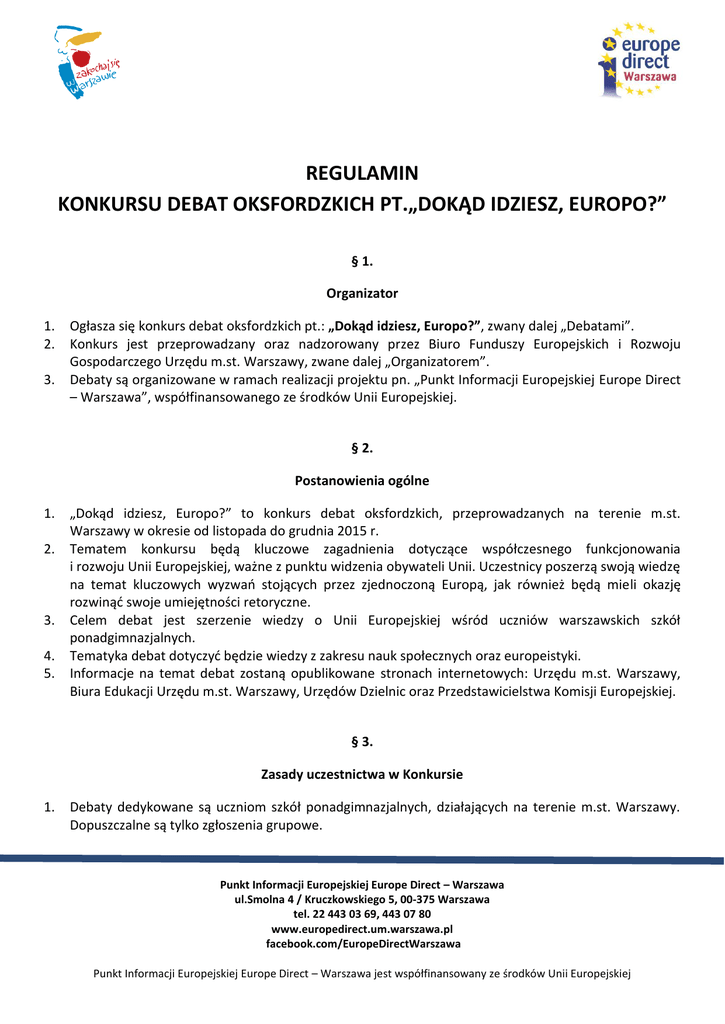 REGULAMIN KONKURSU DEBAT OKSFORDZKICH PT.„DOKĄD IDZIESZ, EUROPO?” § 1. Organizator 1. 2. 3. Ogłasza się konkurs debat oksfordzkich pt.: „Dokąd idziesz, Europo?”, zwany dalej „Debatami”. Konkurs jest przeprowadzany oraz nadzorowany przez Biuro Funduszy Europejskich i Rozwoju Gospodarczego Urzędu m.st. Warszawy, zwane dalej „Organizatorem”. Debaty są organizowane w ramach realizacji projektu pn. „Punkt Informacji Europejskiej Europe Direct – Warszawa”, współfinansowanego ze środków Unii Europejskiej. § 2. Postanowienia ogólne 1. 2. 3. 4. 5. „Dokąd idziesz, Europo?” to konkurs debat oksfordzkich, przeprowadzanych na terenie m.st. Warszawy w okresie od listopada do grudnia 2015 r. Tematem konkursu będą kluczowe zagadnienia dotyczące współczesnego funkcjonowania i rozwoju Unii Europejskiej, ważne z punktu widzenia obywateli Unii. Uczestnicy poszerzą swoją wiedzę na temat kluczowych wyzwań stojących przez zjednoczoną Europą, jak również będą mieli okazję rozwinąć swoje umiejętności retoryczne. Celem debat jest szerzenie wiedzy o Unii Europejskiej wśród uczniów warszawskich szkół ponadgimnazjalnych. Tematyka debat dotyczyć będzie wiedzy z zakresu nauk społecznych oraz europeistyki. Informacje na temat debat zostaną opublikowane stronach internetowych: Urzędu m.st. Warszawy, Biura Edukacji Urzędu m.st. Warszawy, Urzędów Dzielnic oraz Przedstawicielstwa Komisji Europejskiej. § 3. Zasady uczestnictwa w Konkursie 1. Debaty dedykowane są uczniom szkół ponadgimnazjalnych, działających na terenie m.st. Warszawy. Dopuszczalne są tylko zgłoszenia grupowe. Punkt Informacji Europejskiej Europe Direct – Warszawa ul.Smolna 4 / Kruczkowskiego 5, 00-375 Warszawa tel. 22 443 03 69, 443 07 80 www.europedirect.um.warszawa.pl facebook.com/EuropeDirectWarszawa Punkt Informacji Europejskiej Europe Direct – Warszawa jest współfinansowany ze środków Unii Europejskiej 2. Stronami debat będą trzyosobowe grupy uczniów oraz nauczyciel, pełniący nadzór merytoryczny nad argumentacją grupy. 3. Oprócz ww. drużyny, w debatach oksfordzkich udział weźmie ponadto jedna klasa ze szkoły (min. 15 osób), która będzie stanowiła publiczność. Publiczność będzie miała głos oceniający w debatach. 4. Udział uczniów w debatach będzie miał charakter edukacyjny – tematyka debat poświęcona zostanie aktualnym zagadnieniom i kierunkom polityki Unii Europejskiej, wskazanym przede wszystkim w 10 priorytetach Komisji Europejskiej. 5. O zakwalifikowaniu drużyn reprezentujących szkołę do udziału w debatach, decydować będzie kolejność zgłoszeń. 6. Każda szkoła może wystawić do udziału w debatach tylko jedna drużynę, która będzie reprezentowała szkołę. 7. W przypadku, gdy w szkole jest więcej uczniów chętnych do wzięcia udziału w debatach, decyzja o wyselekcjonowaniu konkretnych 3 członków drużyny oraz nauczyciela pozostaje po stronie szkoły i może zostać podjęta w oparciu o kryteria wyznaczone wewnętrznie przez szkołę. 8. Zgłoszenie drużyny (3 uczniów i nauczyciela) musi zawierać: a) Wypełniony i podpisany przez Dyrektora szkoły formularz zgłoszeniowy, załączony do ww. regulaminu, dostępny na stronie Punktu Informacji Europejskiej Europe Direct – Warszawa (http://europedirect.um.warszawa.pl/). b) Oświadczenie podpisane przez uczestnika lub (w przypadku gdy nie jest on pełnoletni) jego rodziców/opiekunów prawnych, w którym uczestnik (bądź rodzic) wyraża zgodę na: udział debatach oxfordzkich i zaakceptowanie wszystkich postanowień Regulaminu Debat; wykonywanie zdjęć podczas trwania Konkursu. Fotografie będą wykorzystywane do dokumentacji projektu pn. „Punkt Informacji Europejskiej Europe Direct - Warszawa” oraz wszelkich działań promocyjnych z nim związanych; nieodpłatne wykorzystanie i rozpowszechnienie swojego wizerunku na zdjęciach zrobionych w trakcie konkursu, w celu realizacji przez m.st. Warszawę działań promocyjno – informacyjnych prowadzonych w ramach projektu pn. „Punkt Informacji Europejskiej Europe Direct – Warszawa”. Niniejsza zgoda nie jest ograniczona czasowo i terytorialnie oraz obejmuje wszelkie formy publikacji, w szczególności publikacji na plakatach, ulotkach, broszurach, folderach a także publikacji za pośrednictwem dowolnego medium; otrzymywanie za pośrednictwem poczty elektronicznej informacji dotyczących przeprowadzenia konkursu debat oksfordzkich pt. „Dokąd idziesz, Europo?; przetwarzanie swoich danych osobowych dla potrzeb przeprowadzenia konkursu debat oksfordzkich pt. „Dokąd idziesz, Europo?”, zgodnie z Ustawą z dnia 29 sierpnia 1997 roku o Ochronie danych osobowych. 9. Formularz zgłoszeniowy wraz z oświadczeniem należy przesłać na adres: [email protected] 10. Uczestnikami Konkursu mogą być wyłącznie uczniowie szkół ponadgimnazjalnych, którzy uczęszczają do szkoły na terytorium m.st. Warszawy. 11. Uczestnikami Konkursu nie mogą być członkowie rodzin osób zatrudnionych przez Organizatora lub z nim współpracujących. Punkt Informacji Europejskiej Europe Direct – Warszawa ul.Smolna 4 / Kruczkowskiego 5, 00-375 Warszawa tel. 22 443 03 69, 443 07 80 www.europedirect.um.warszawa.pl facebook.com/EuropeDirectWarszawa Punkt Informacji Europejskiej Europe Direct – Warszawa jest współfinansowany ze środków Unii Europejskiej 12. Organizator Konkursu zastrzega sobie prawo do wykluczenia Uczestnika w szczególności w następujących przypadkach: 1) złamania postanowień Regulaminu, 2) zachowań nieetycznych i sprzecznych z prawem, 3) podania nieprawdziwych lub niepełnych danych, 4) podjęcia działań uznanych przez Organizatora za niepożądane bądź szkodliwe. z Konkursu, § 4. Zasady organizacyjne debat 1. 2. 3. 4. 5. 6. 7. 8. Drużyny, które biorą udział w debatach jako strony zostaną wybrane przez organizatorów na podstawie kolejności zgłoszeń, zawierających formularz zgło