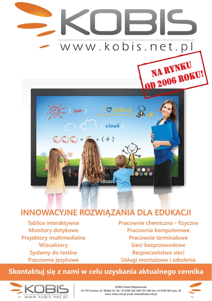 NKU Y R A N KU! O R 6 0 OD 20 INNOWACYJNE ROZWIĄZANIA DLA EDUKACJI Tablice interaktywne Monitory dotykowe Projektory multimedialne Wizualizery Systemy do testów Pracownie językowe Pracownie chemiczno - fizyczne Pracownie komputerowe Pracownie terminalowe Sieci bezprzewodowe Bezpieczeństwo sieci Usługi montażowe i szkolenia Skontaktuj się z nami w celu uzyskania aktualnego cennika KOBIS Paweł Wojtanowski 33-170 Tuchów, Ul. Widok 16, Tel.: 14 6789 160, 600 743 944 Fax: 14 6789 160 wew. 26 www: kobis.net.pl email: [email protected] Nowoczesna szkoła Przegląd rozwiązań interaktywnych Trudno wyobrazić sobie pracę w szkole bez tablicy interaktywnej. Na przestrzeni ostatnich lat stała się podstawowym narzędziem nauczyciela, który chce urozmaicić swoje zajęcia, przekazać uczniom więcej wiedzy i zachęcić do poznawania świata. Tablice interaktywne znają już niemal wszyscy nauczyciele i chętnie korzystają z ich funkcji rozszerzając zasób możliwych form przekazywania wiedzy. Nowoczesna szkoła to jednak nie tylko tablica interaktywna. Nowoczesna szkoła to dostęp do Czy wiesz, że... zaawansowanych, nowoczesnych technologii w sposób prosty i łatwy do wykorzystania w edukacji. Nowoczesna szkoła powinna dawać nauczycielom i uczniom dostęp do największej bazy wiedzy, jaką jest Internet, wykorzystywać na zajęciach lekcyjnych nowoczesne technologie, ale przede wszystkim - Nowoczesna szkoła musi być przyjazna dla nauczycieli i uczniów, prosta i intuicyjna. Niniejsza ulotka jest przeglądem nowoczesnych rozwiązań stosowanych w edukacji, począwszy od Czy wiesz, że... monitory znanych już wszystkim tablic interaktywnych, przez dużo bardziej zaawansowane dotykowe, pracownie komputerowe oparte o komputery stacjonarne, sieci przewodowe i bezprzewodowe, do rozwiązań przygotowywanych indywidualnie dla każdego klienta, m. in. pracownie komputerowe terminalowe, pracownie językowe, fizyko-chemiczne, czy profesjonalne rozwiązania dotyczące bezpieczeństwa sieci w szkole. Zapraszamy do lektury 2 KOBIS Paweł Wojtanowski 33-170 Tuchów, Ul. Widok 16, Tel.: 14 6789 160, 600 743 944 Fax: 14 6789 160 wew. 26 www: kobis.net.pl email: [email protected] Zestawy interaktywne Tablice interaktywne i projektory Najchętniej wybieranym rozwiązaniem interaktywnym jest zestaw tablicy interaktywnej z projektorem. Jest to też idealne rozwiązanie dla szkół, które zaczynają swoją przygodę z interaktywnością, dzięki swojej prostocie obsługi oraz atrakcyjnej cenie. Tablice interaktywne można podzielić ze względu na ich technologię oraz funkcjonalność: ź elektromagnetyczne - sterowane specjalnym pisakiem elektronicznym; dużo dokładniejsze oraz szybsze w działaniu; ź dotykowe - działają w technologii pozycjonowania w podczerwieni, optycznej bądź DViT; mogą być obsługiwane dowolnym przedmiotem lub palcem ź tablice stacjonarne - klasyczne tablice do powieszenia na ścianie lub specjalnym uchwycie/statywie jezdnym, umożliwiającym przemieszczanie pomiędzy salami lekcyjnymi, bądź umożliwiającym regulację wysokości ź tablice mobilne - pozwalają zamienić dowolną powierzchnię w tablicę interaktywną Do pracy z tablicą interaktywną niezbędny jest projektor multimedialny, które to można podzielić ze względu na ich ogniskową, czyli odległość projektora od tablicy: ź standardowe - wyświetlają obraz z odległości około 2,5-3,5m; rozwiązania najtańsze ale też najmniej komfortowe ź krótkoogniskowe - wyświetlają obraz z odległości około 1m; rozwiązanie optymalne dające lepszy komfort pracy z zestawem interaktywnym ź ultra krótkoogniskowe - wyświetlają obraz z odległości poniżej 0,5m; rozwiązanie zapewniające najwyższy komfort pracy z zestawem interaktywnym. Coraz popularniejsze stają się projektory krótkoogniskowe i ultra krótkoogniskowe wyposażone w moduł interaktywny, który pozwala zamienić powierzchnię białej tablicy lub ściany w tablicę interaktywną. KOBIS Paweł Wojtanowski 33-170 Tuchów, Ul. Widok 16, Tel.: 14 6789 160, 600 743 944 Fax: 14 6789 160 wew. 26 www: kobis.net.pl email: [email protected] 3 Monitory interaktywne Nowa generacja tablic interaktywnych Monitory interaktywne to połączenie wysokiej jakości panelu LCD z nakładką dotykową (oraz opcjonalnie komputerem) pełniące funkcje niemal identyczne jak zestawy interaktywne. Do głównych cech monitorów dotykowych zaliczyć można: ź dużo wyższa jakość wyświetlanego obrazu - monitory dotykowe charakteryzują się rozdzielczością wyświetlanego obrazu min. 1920x1080 (Full HD), ź brak cienia na ekranie - jako, że sam monitor aktywnie wyświetla obraz, nie ma konieczności stosowania projektora, a co za tym idzie nie ma efektu cienia na wyświetlanym obrazie, ź brak konieczności kalibracji - w przypadku monitora z wbudowanym komputerem nie ma konieczności kalibracji dotyku, ź większa żywotność paneli LCD - w porównaniu do projektorów, których lampa wytrzymuje do 10 000h godzin świecenia, matryce monitorów charakteryzują się żywotnością nawet do 30 000h, ź urządzenie All-in-One - monitor dotykowy, jako jedno zintegrowane urządzenie, pozwala na Czy wiesz, że... łatwe przenoszenie pomiędzy salami lekcyjnymi. Monitory dotykowe występują w różnych wariantach (bez komputera, z możliwością podłączenia komputera OPS, z wbudowanym komputerem OPS) oraz w rozmiarach o przekątnej 55", 65", 70" i 84". Niektóre monitory dotykowe można także wykorzystać jako stół interaktywny (po zastosowaniu odpowiedniego statywu). Monitory dotykowe mogą być sprzedawane dla sektora edukacji z 0% stawką VAT 4 KOBIS Paweł Wojtanowski 33-170 Tuchów, Ul. Widok 16, Tel.: 14 6789 160, 600 743 944 Fax: 14 6789 160 wew. 26 www: kobis.net.pl email: [email protected] Pracownie komputerowe Kilka wariantów pracowni komputerowych Trudno wyobrazić sobie szkołę bez pracowni informatycznej. Dzisiejsze pracownie komputerowe