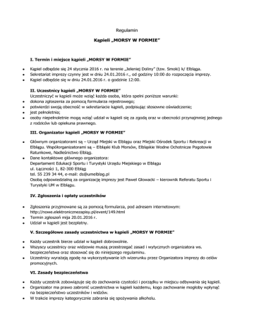 Regulamin Kąpieli „MORSY W FORMIE” I. Termin i miejsce kąpieli „MORSY W FORMIE” Kąpiel odbędzie się 24 stycznia 2016 r. na terenie „Jeleniej Doliny” (tzw. Smoki) k/ Elbląga. Sekretariat imprezy czynny jest w dniu 24.01.2016 r., od godziny 10:00 do rozpoczęcia imprezy. Kąpiel odbędzie się w dniu 24.01.2016 r. o godzinie 12:00. II. Uczestnicy kąpieli „MORSY W FORMIE” Uczestniczyć w kąpieli może wziąć każda osoba, która spełni poniższe warunki: dokona zgłoszenia za pomocą formularza rejestrowego; potwierdzi swoją obecność w sekretariacie kąpieli, podpisując stosowne oświadczenie; jest pełnoletnia; osoby niepełnoletnie mogą wziąć udział w kąpieli się za zgodą oraz w obecności przynajmniej jednego z rodziców lub opiekuna prawnego. III. Organizator kąpieli „MORSY W FORMIE” Głównym organizatorami są – Urząd Miejski w Elblągu oraz Miejski Ośrodek Sportu i Rekreacji w Elblągu. Współorganizatorami są – Elbląski Klub Morsów, Elbląskie Wodne Ochotnicze Pogotowie Ratunkowe, Nadleśnictwo Elbląg. Dane kontaktowe głównego organizatora: Departament Edukacji Sportu i Turystyki Urzędu Miejskiego w Elblągu ul. Łączności 1, 82-300 Elbląg tel. 55 239 34 44, e-mail: [email protected] Osobą odpowiedzialną za organizację imprezy jest Paweł Głowacki – kierownik Referatu Sportu i Turystyki UM w Elblągu. IV. Zgłoszenia i opłaty uczestników Zgłoszenia przyjmowane są za pomocą formularza, pod adresem internetowym: http://nowe.elektronicznezapisy.pl/event/149.html Termin zgłoszeń mija 20.01.2016 r. Udział w kąpieli jest bezpłatny. V. Szczegółowe zasady uczestnictwa w kąpieli „MORSY W FORMIE” Każdy uczestnik bierze udział w kąpieli dobrowolnie. Wszyscy uczestnicy oraz widzowie muszą przestrzegać zasad i wytycznych organizatora ws. bezpieczeństwa oraz stosować się do niniejszego regulaminu. Uczestnicy wyrażają zgodę na wykorzystywanie ich wizerunku przez Organizatora imprezy do celów promocyjnych. VI. Zasady bezpieczeństwa Każdy uczestnik zobowiązuje się do zachowania czystości i porządku w miejscu odbywania się kąpieli. Organizator ma prawo zabronić uczestnictwa w kąpieli każdemu, kogo zachowanie mogłoby wpłynąć na bezpieczeństwo uczestników i widzów. W trakcie imprezy kategorycznie zabrania się spożywania alkoholu. W trakcie kąpieli mają zastosowanie wszystkie przepisy prawne Rzeczypospolitej Polskiej oraz powszechnie obowiązujące zasady dobrego zachowania w miejscu publicznym. VII. Postanowienia końcowe Każdy uczestnik kąpieli, który zarejestruje się do 15.01. 2016 r. otrzymuje pamiątkowy medal. Osobo zarejestrowanym po tym terminie Organizator nie gwarantuje medali. Organizatorzy zastrzegają sobie prawo do wprowadzania zmian w programie imprezy.