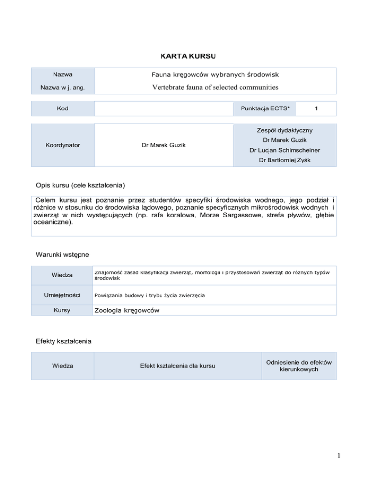 KARTA KURSU Nazwa Fauna kręgowców wybranych środowisk Nazwa w j. ang. Vertebrate fauna of selected communities Kod Punktacja ECTS* 1 Zespół dydaktyczny Koordynator Dr Marek Guzik Dr Marek Guzik Dr Lucjan Schimscheiner Dr Bartłomiej Zyśk Opis kursu (cele kształcenia) Celem kursu jest poznanie przez studentów specyfiki środowiska wodnego, jego podział i różnice w stosunku do środowiska lądowego, poznanie specyficznych mikrośrodowisk wodnych i zwierząt w nich występujących (np. rafa koralowa, Morze Sargassowe, strefa pływów, głębie oceaniczne). Warunki wstępne Wiedza Umiejętności Kursy Znajomość zasad klasyfikacji zwierząt, morfologii i przystosowań zwierząt do różnych typów środowisk Powiązania budowy i trybu życia zwierzęcia Zoologia kręgowców Efekty kształcenia Wiedza Efekt kształcenia dla kursu Odniesienie do efektów kierunkowych 1 W01 Wymienia rodzaje adaptacji (osobnicza, gatunkowa). W02 Charakteryzuje zwierzęta środowiska wodnego - przystosowania do warunków życiowych oraz wybranych stref ekologicznych i mikrośrodowisk (zwierzęta reofilne, litoralne, pelagiczne, głębinowe, słodko- i słonowodne, raf koralowych) W03 Wskazuje i wyjaśnia związki między środowiskiem życia organizmu zwierzęcego a jego budową i fizjologią. W04 Opisuje świat zwierząt zgodnie z zasadami taksonomii i systematyki W05 Charakteryzuje rozmieszczenie zwierząt w różnych strefach środowiska wodnego W06 Charakteryzuje rafę koralową, głębie oceaniczne, strefę pływów, Morze Sargassowe jako specyficzne środowiska oceaniczne. Efekt kształcenia dla kursu Umiejętności K_W05 K_W06 K_W11 K_W06 K_W09 Odniesienie do efektów kierunkowych U01 Posługuje się podstawową terminologią i wiedzą właściwą dla nauk zoologicznych. K_U06 U02 Wyjaśnia relacje między budową i funkcjonowaniem organizmu zwierzęcego a środowiskiem życia. K_U07 U03 Objaśnia mechanizmy funkcjonowania pojedynczych gatunków oraz całych zespołów organizmów zwierzęcych w środowisku wodnym K_U03 U04 Wykonuje rysunki wybranych zwierząt wodnych Kompetencje społeczne K_W04 Efekt kształcenia dla kursu K_U04 Odniesienie do efektów kierunkowych 2 K01 Przejawia chęć systematycznego poszerzania wiedzy zoologicznej. K_K01, K_K06 K02 Jest otwarty na podjęcie działań mających na celu zachowanie różnorodności biologicznej fauny. K_K06 K03 Jest wrażliwy na problemy dotyczące środowiska wodnego. K_K06 Organizacja Forma zajęć Ćwiczenia w grupach Wykład (W) A Liczba godzin K L 5 S P E 6 Opis metod prowadzenia zajęć Wykład z prezentacją foliogramów, filmy, okazy zwierząt różnych środowisk morskich W01 W02 W03 W04 W05 W06 U01 x x x x x x x Inne Egzamin pisemny Egzamin ustny Praca pisemna (esej) Referat Udział w dyskusji Projekt grupowy Projekt indywidualny Praca laboratoryjna Zajęcia terenowe Ćwiczenia w szkole Gry dydaktyczne E – learning Formy sprawdzania efektów kształcenia x x x x x 3 U02 U03 U04 K01 K02 K03 Kryteria oceny x x x x x x x x x x Aktywny udział w dyskusji, poprawne wykonanie rysunków, właściwa interpretacja budowy zwierząt Uwagi Treści merytoryczne (wykaz tematów) Zajęcia koncentrują się na zagadnieniach związanych z życiem w środowisku wodnym. Na wykładach omawiana jest charakterystyka środowiska wodnego, jego podział i różnice w stosunku do środowiska lądowego. Na ćwiczeniach omawiana jest charakterystyka rafy koralowej jako specyficznego środowiska oceanicznego. Zajęcia z tematu wód słodkich koncentrują się na charakterystycznych cechach krokodyli Wykaz literatury podstawowej Grodziński Z. Red. 1979. Zoologia Przedstrunowce i strunowce. PWN W- wa Szarski H. 1998. Historia zwierząt kręgowych. Wyd. Nauk PWN Wwa Szarski H. (red). 1978. Anatomia porównawcza kręgowców. PWN W-wa Zamachowski W., Zyśk A. 2002. Strunowce Chordata Wyd. Nauk. AP Umiński W. 1974. Zwierzęta i kontynenty. WSiP Umiński W. 1976. Zwierzęta i oceany. WSiP Demel K. 1967. Zwierzę i jego środowisko PWN Wykaz literatury uzupełniającej Attenborough D. 1993. Na ścieżkach życia. Wyd. Wilga Bilans godzinowy zgodny z CNPS (Całkowity Nakład Pracy Studenta) 4 Ilość godzin w kontakcie z prowadzącymi Ilość godzin pracy studenta bez kontaktu z prowadzącymi Wykład 5 Konwersatorium (ćwiczenia, laboratorium itd.) 6 Pozostałe godziny kontaktu studenta z prowadzącym 5 Lektura w ramach przygotowania do zajęć 5 Przygotowanie krótkiej pracy pisemnej lub referatu po zapoznaniu się z niezbędną literaturą przedmiotu Przygotowanie projektu lub prezentacji na podany temat (praca w grupie) Przygotowanie do egzaminu Ogółem bilans czasu pracy 21 Ilość punktów ECTS w zależności od przyjętego przelicznika 1 5